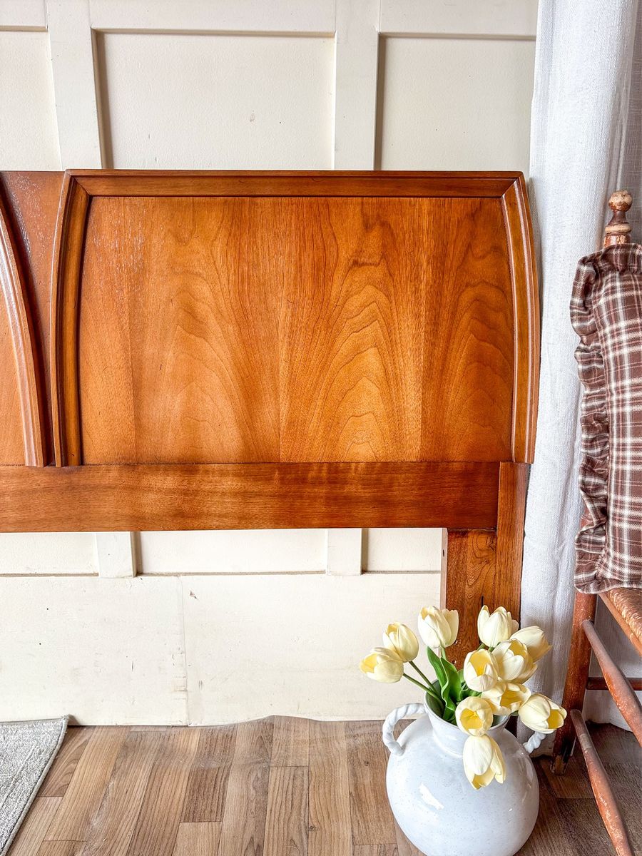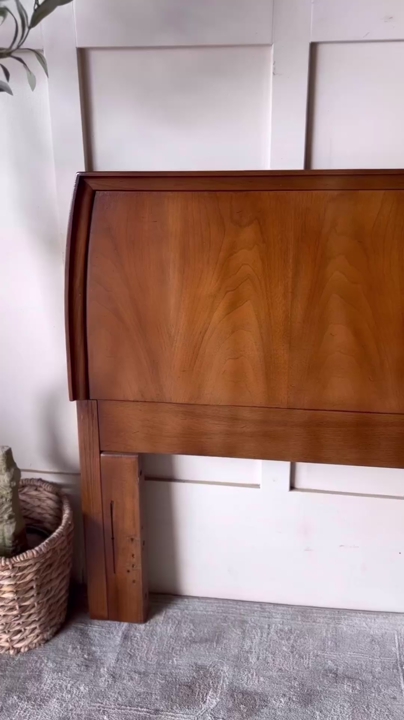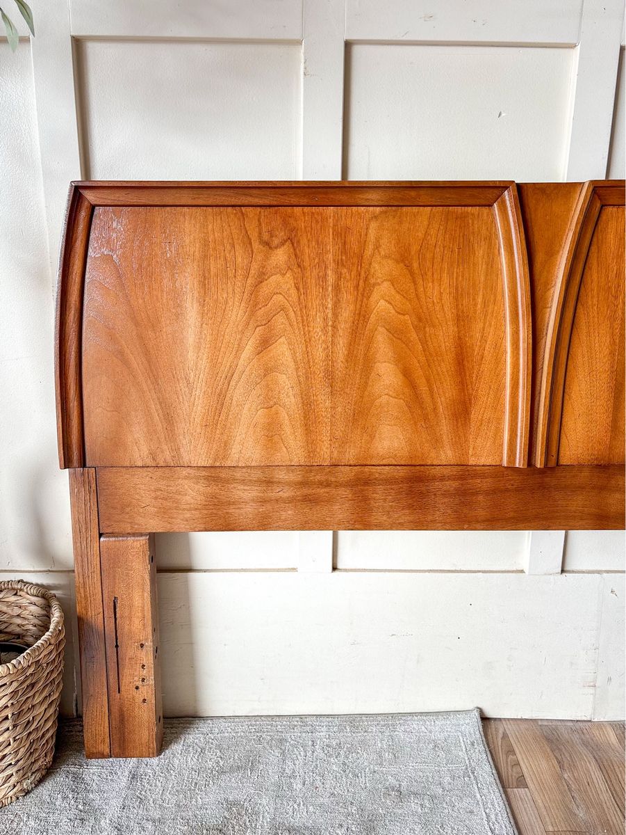 VenmoThis beautiful mid century modern walnut headboard features a warm rich tone and a clean timeless silhouette that instantly elevates any bedroom space. Designed to work with both full and queen size beds, it offers great versatility with a simple adjustable metal bedframe. It is in great condition with only minor wear that adds just the right touch of character while still feeling polished and well cared for!