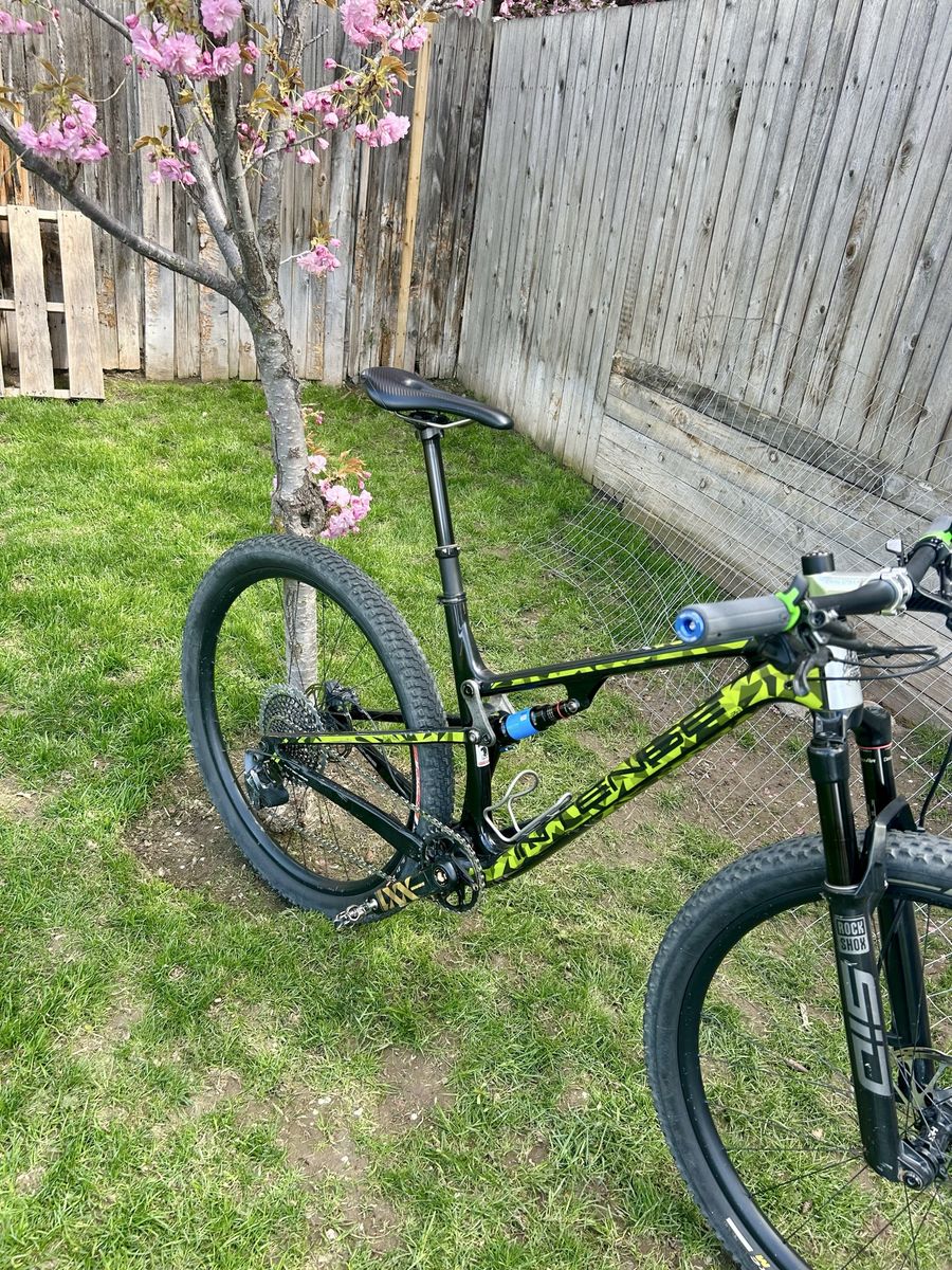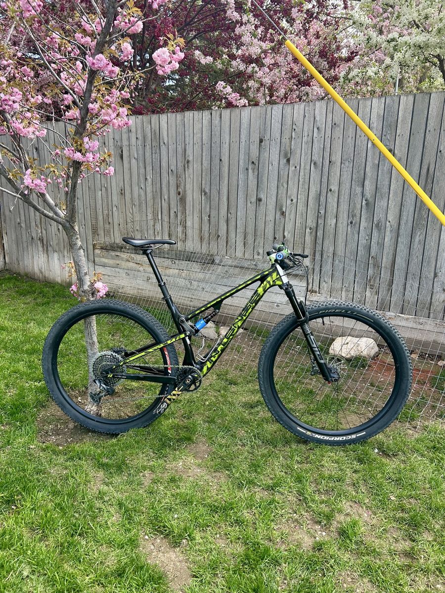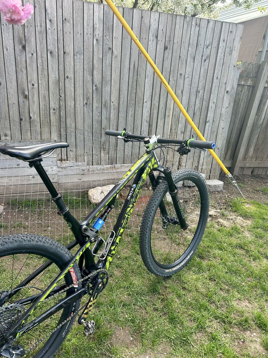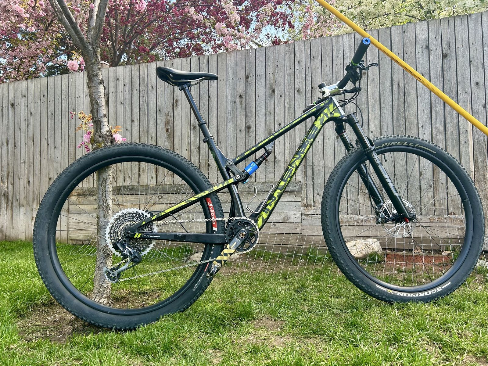 VenmoSRAM XX1 SL cranks SRAM X01 derailleur SRAM XX1 shifter SRAM X01 cassette Shimano XTR brakes Rockshox sid fork Rockshox Sid ultimate shock Titanium water bottle cage Cannondale hollowgram carbon rims on dt Swiss hubs Fox transfer SL dropper Santa Cruz carbon bars Vittoria mezcal rear tire 2.4 Pirelli scorpion XCM front tire 2.4 Pedals and Garmin mount not included