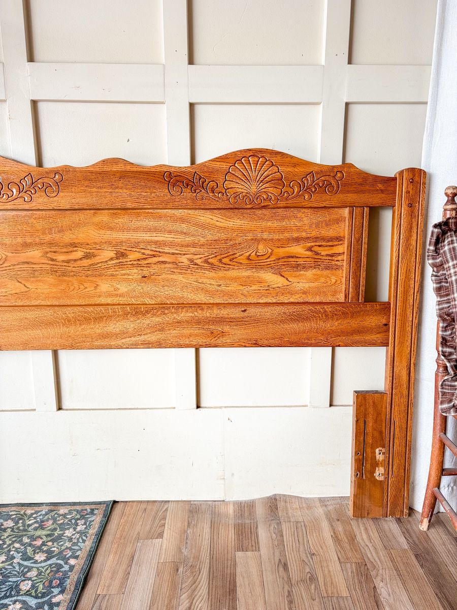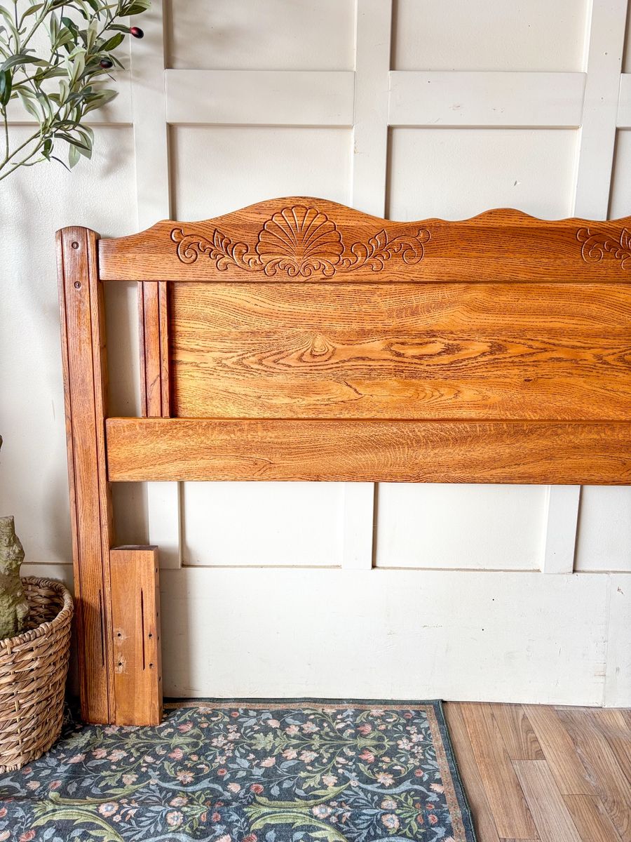 VenmoThis beautiful vintage oak queen size headboard features a charming traditional farmhouse style with carved detailing that adds warmth and character to any bedroom. The natural oak grain shines through with rich tones and a timeless look that pairs well with a variety of decor styles. It is in great condition for its age with minor wear that adds to its authentic vintage appeal while still feeling sturdy and well cared for!