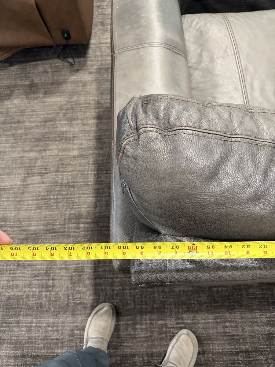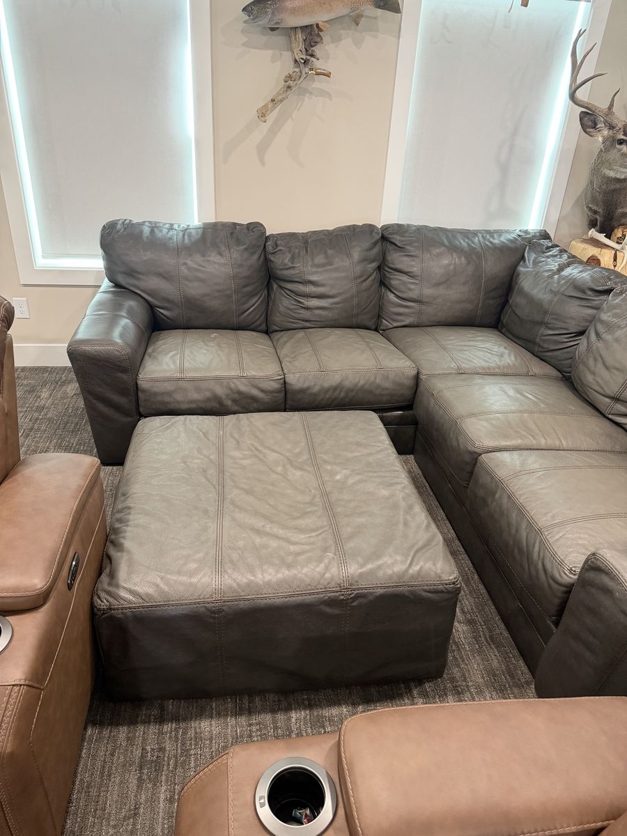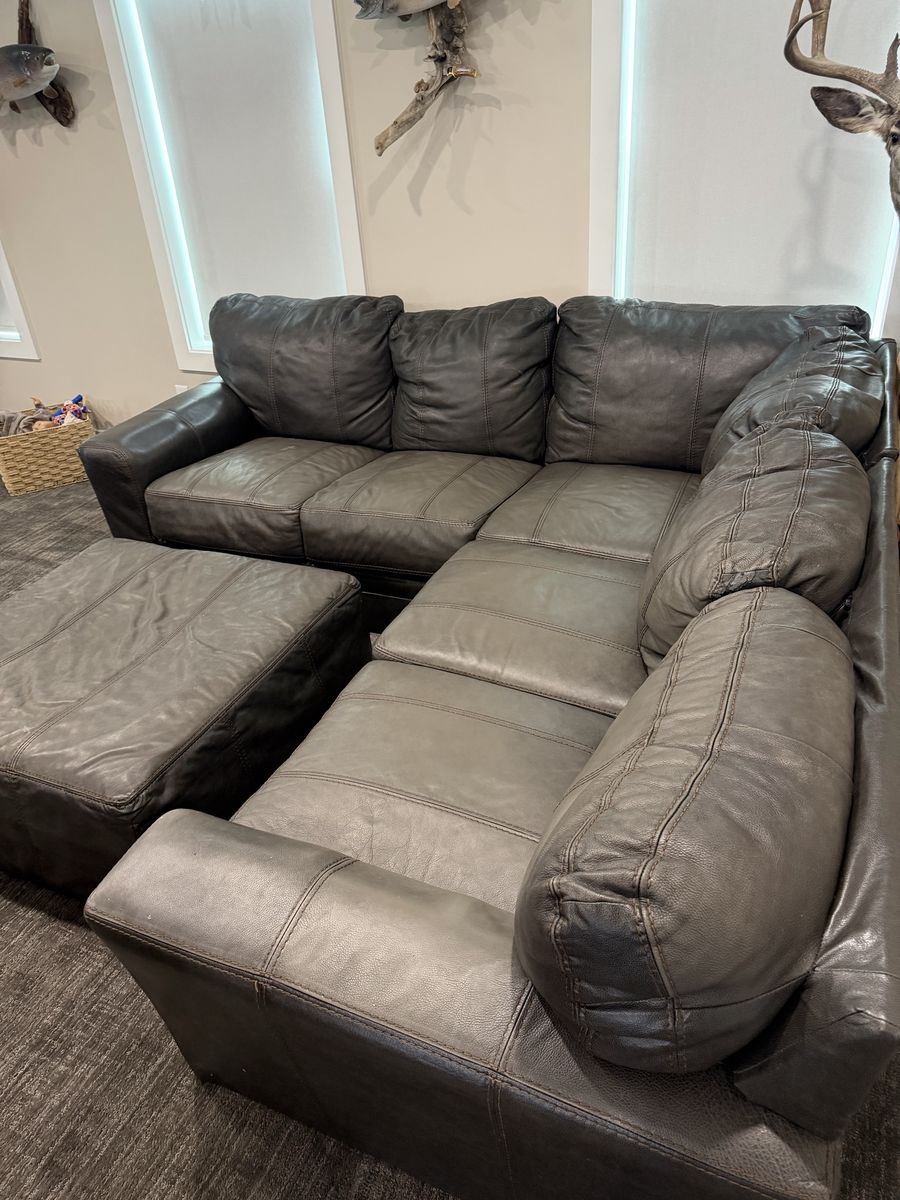 Selling my gray REAL leather sectional couch with ottoman. I paid over 3k for this set when it was new, still in pretty good shape. It measures a little over 8 feet long both ways. Price is obo