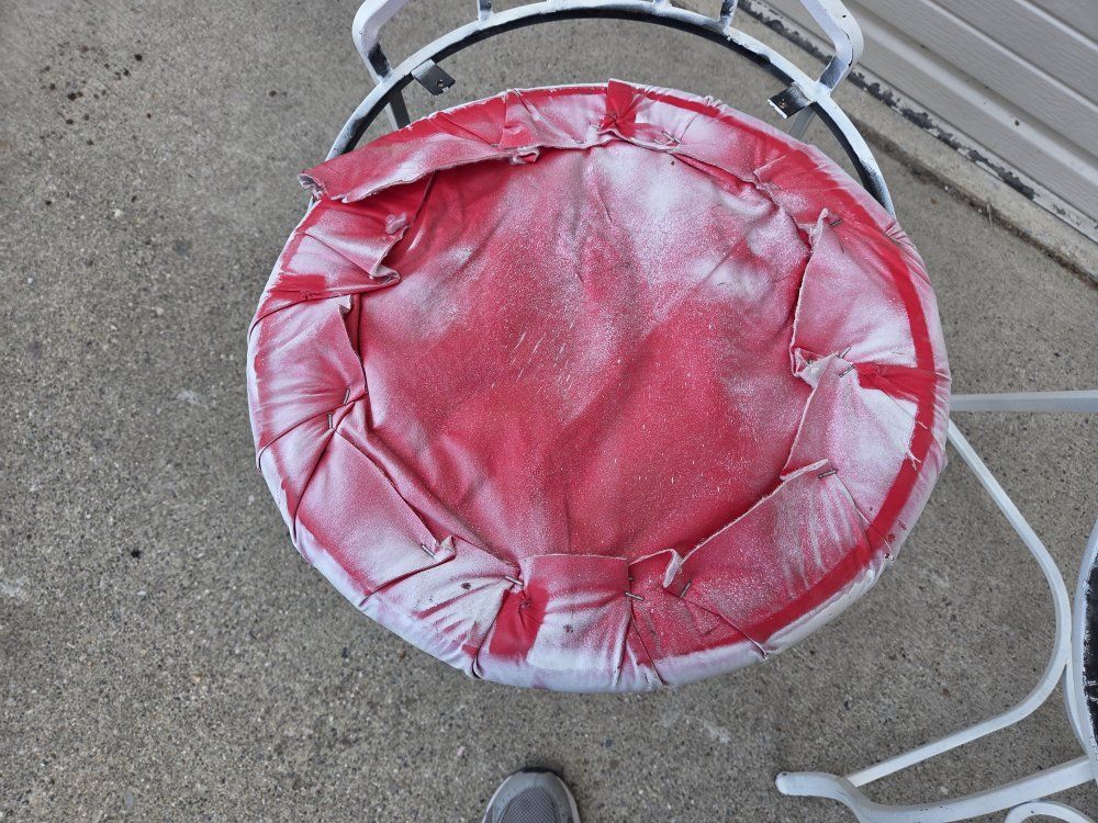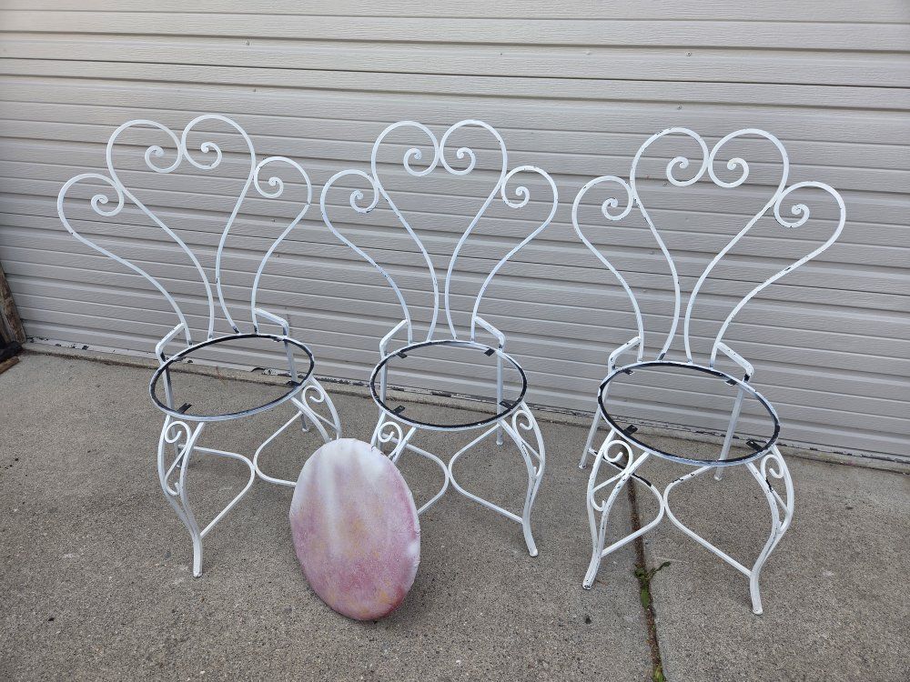 VenmoThree sturdy, beautiful, wrought iron project patio chairs. We were going to refinish them but don't have the time. There is one seat for sizing help. New seats and you are all set!
