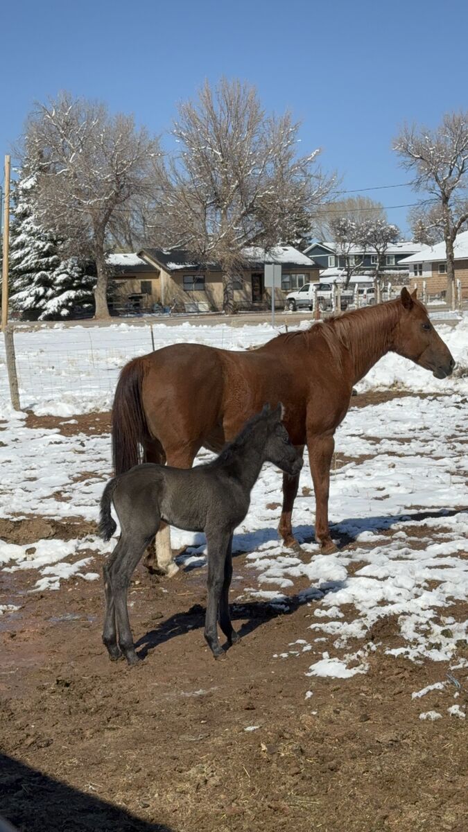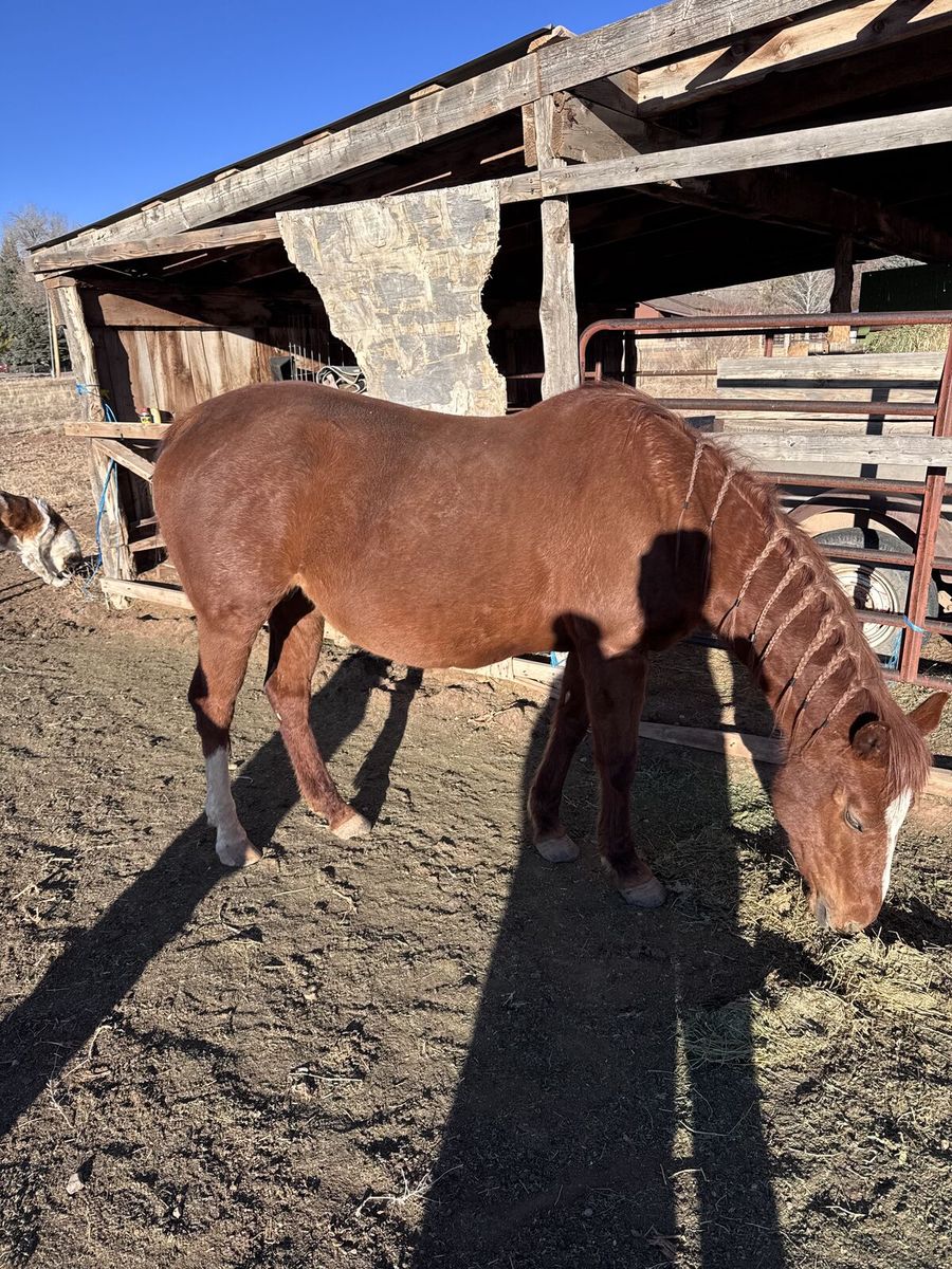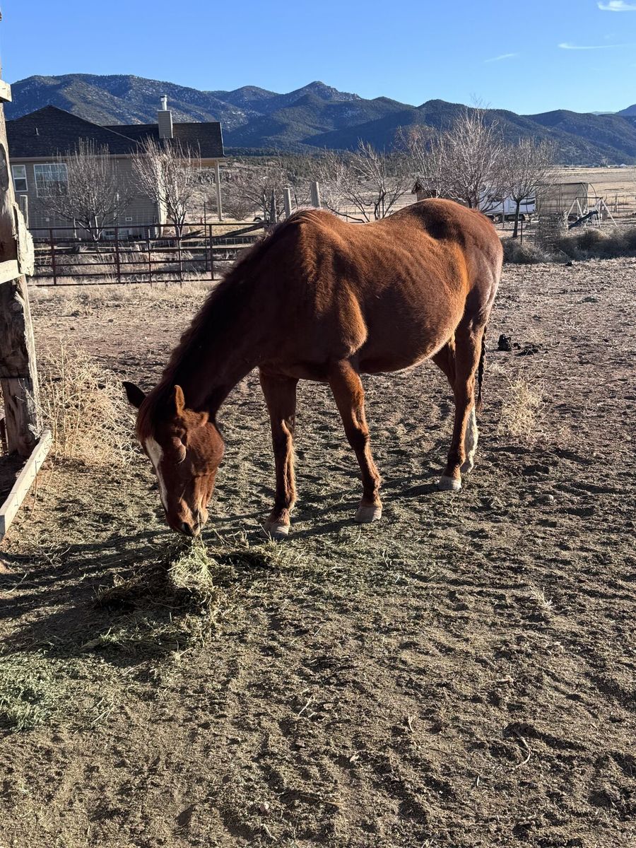 12 yo quarter horse Broodmare, Reba. Has had two sucessful births since I have owned her. One in 2022 & one in 2025. She was rideable when I bought her in 2019 but has since had an injury to her back leg that made me decide she will only be good for breeding. I don't want anymore babies so she needs to go. She is an amazing mom.