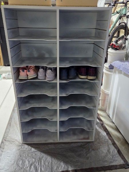 We've been using this for our shoes. Depending on the size of shoe, we fit 32 pair of adult shoes easily without stacking them.
