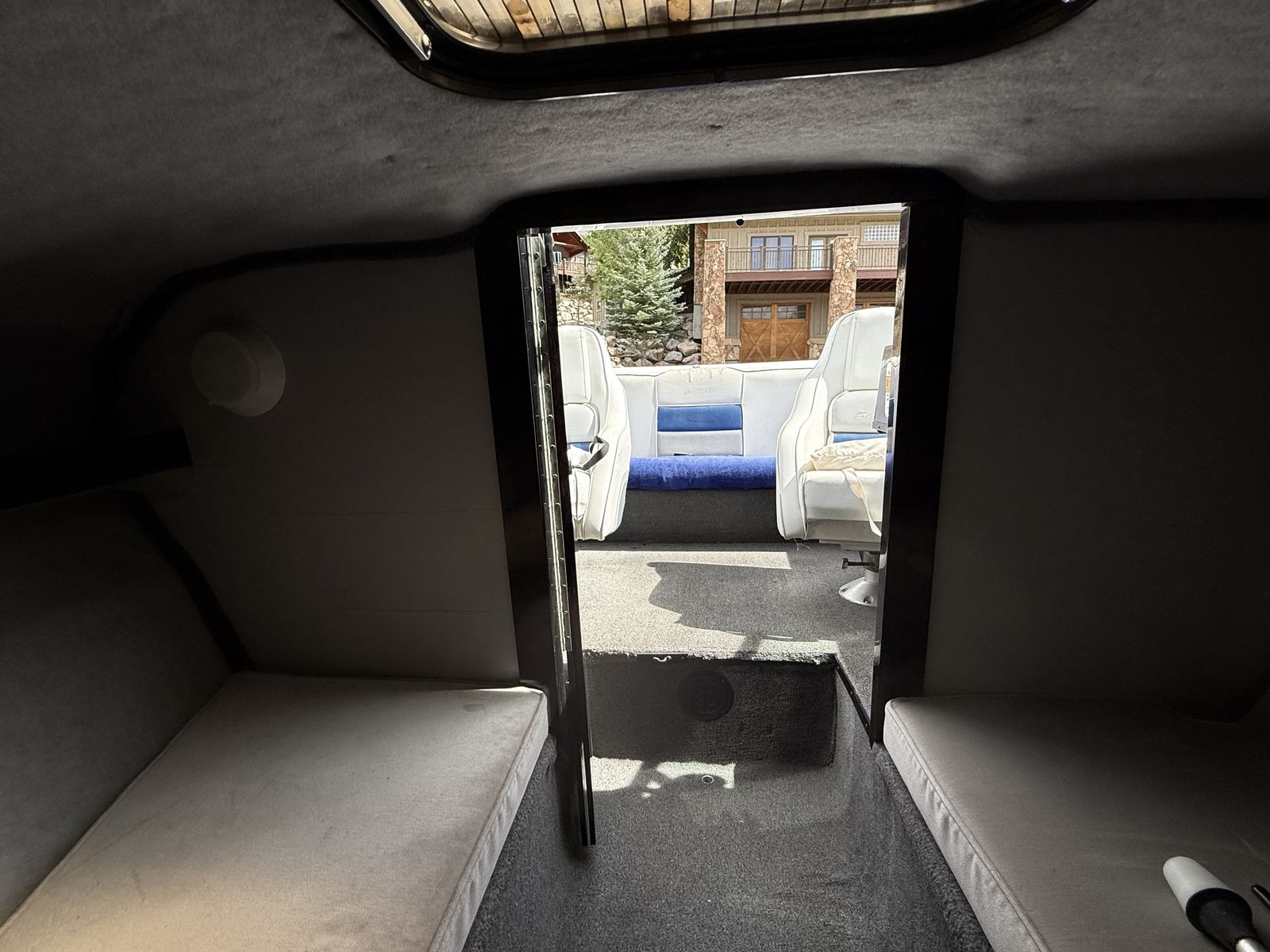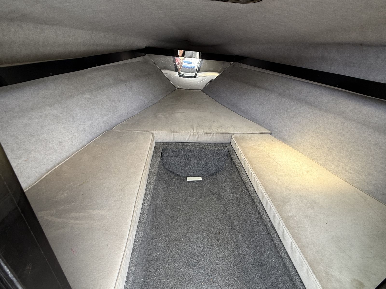 The cuddy cabin offers a comfortable space for shade, storage, or even overnight stays—great for longer days on the lake.