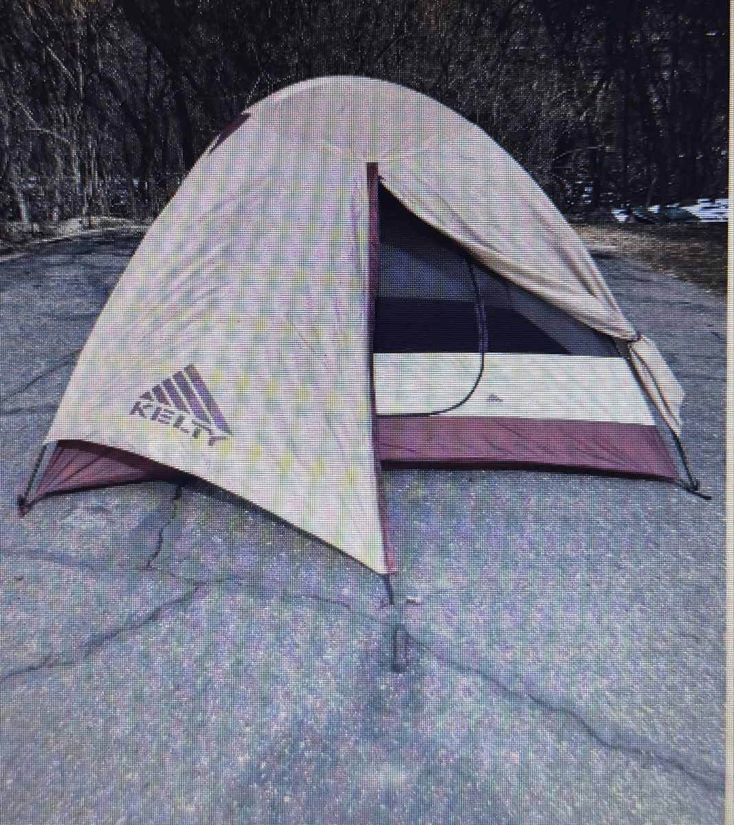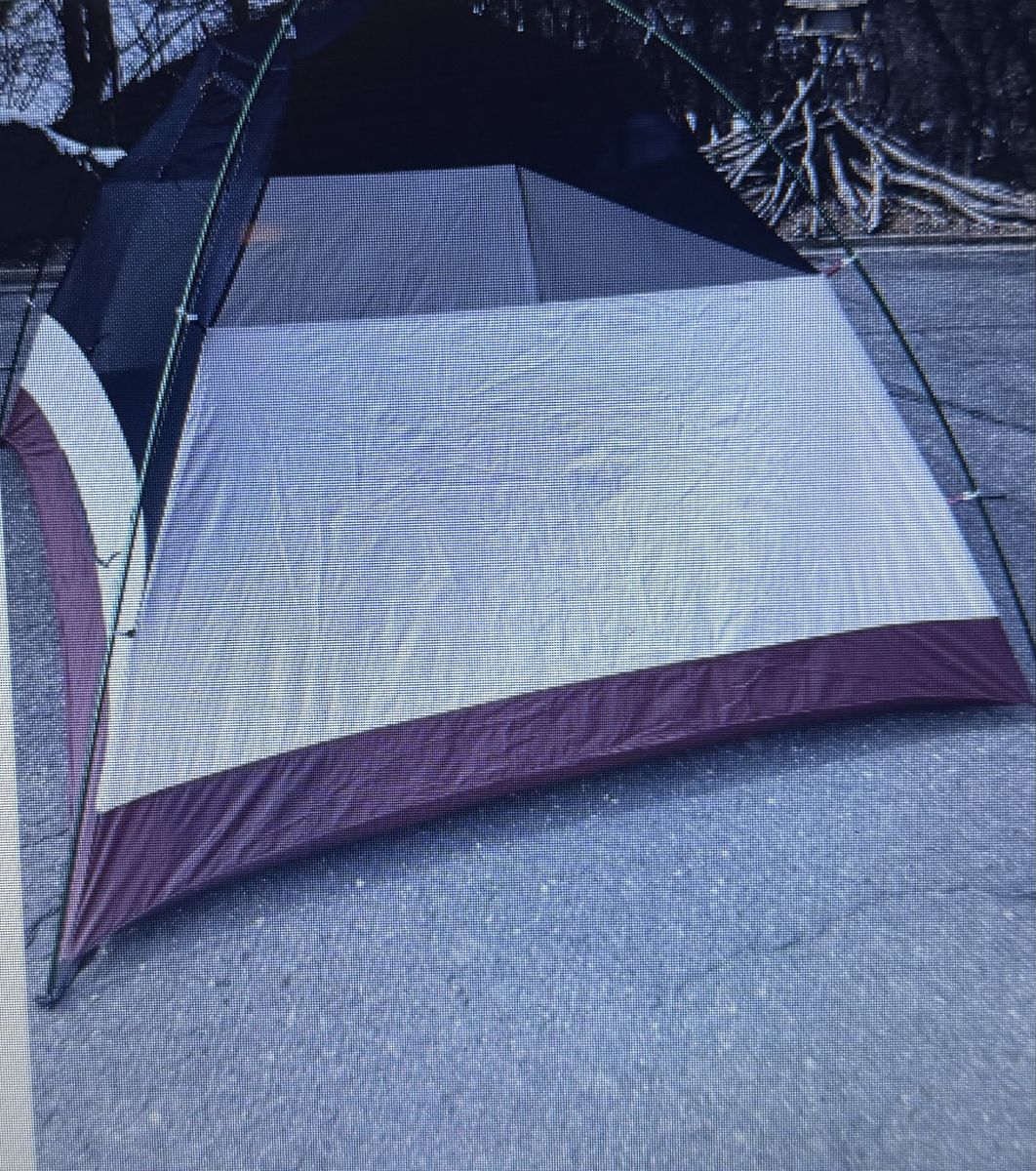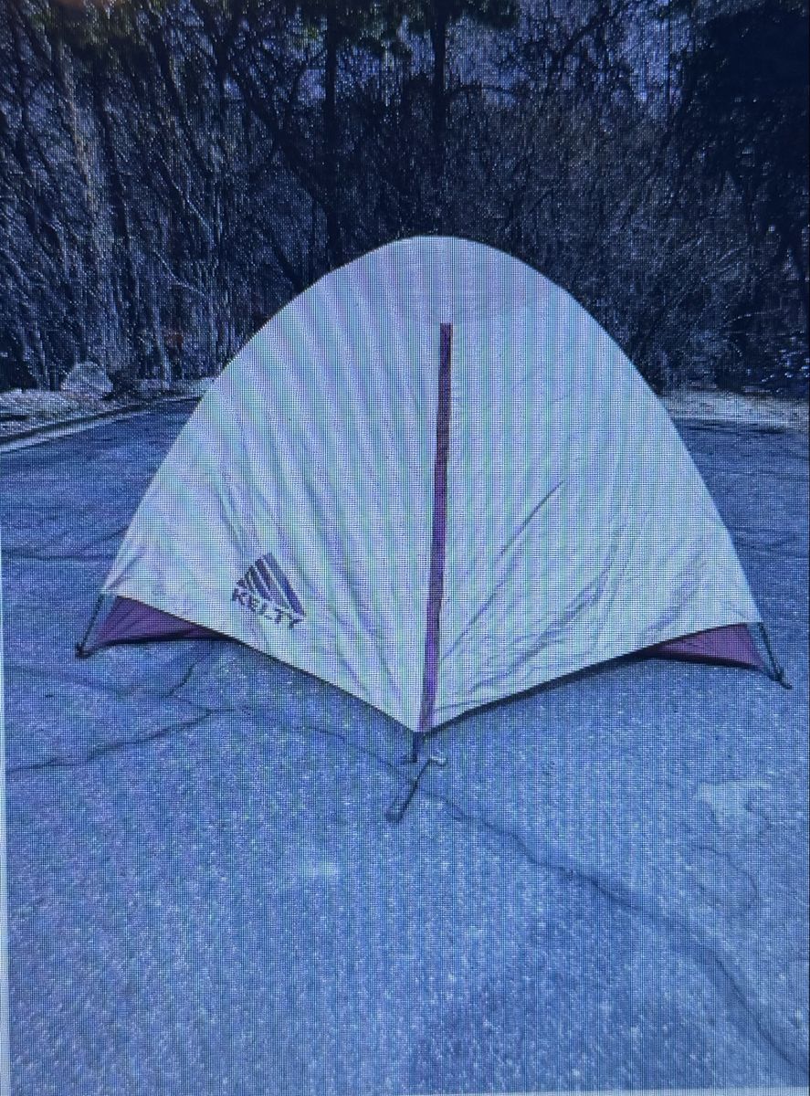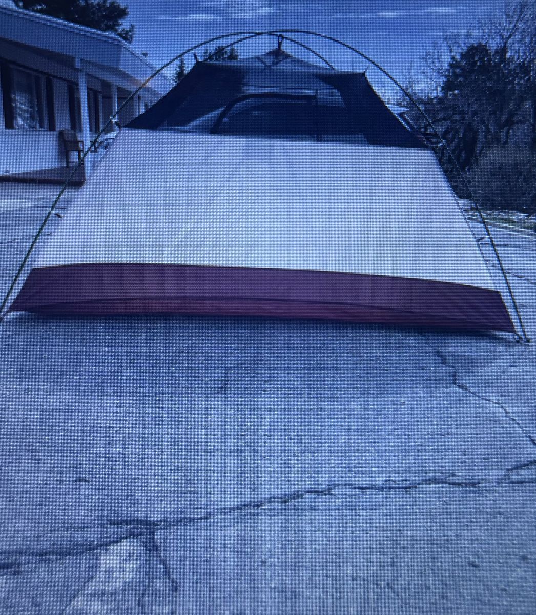 VenmoThis tent is big and clean and easy to set up! Approximate sizes 100“ x 80“ and 56” in height. This tent has a mesh screen door and four sides of ventilation via mesh panels- bathtub styled floor, large rain fly with vestibule. Approximate weight is 7.5 pounds. Pictures are of the actual item for sale and part of the description. Shock chords could be adjusted, they are a little loose. That’s an easy thing to do. Two small holes professionally repaired in the floor. See pictures for locations of repair. Comes with a NEW, 10’ x 20’ generic dark green nylon ground cloth. Ground cloth not pictured.