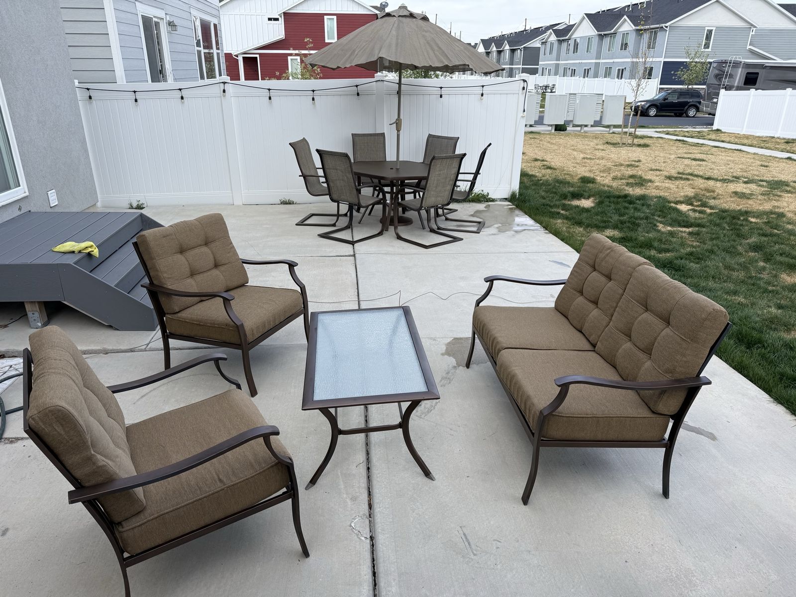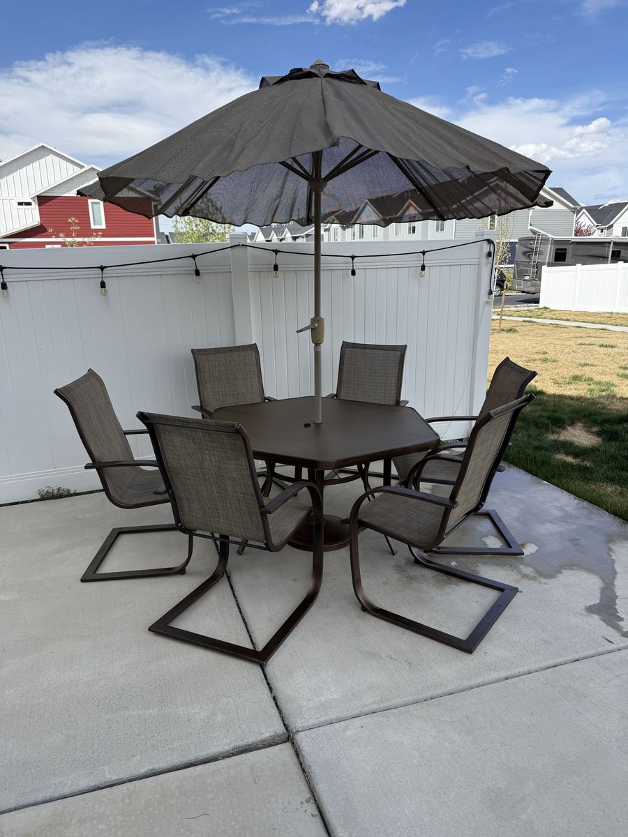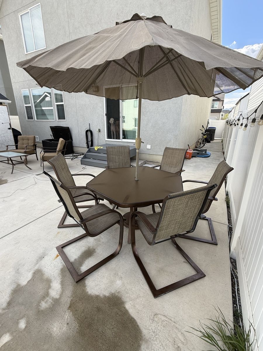 PayPalSpacious outdoor furniture set. Has a 6-seater dining table with an umbrella, plus a lounge set with two armchairs, a loveseat, and a coffee table. All pieces have brown metal frames. Dining chairs have sling fabric. Lounge chairs and loveseat have comfy brown cushions. Coffee table has a glass top. Good condition. Cushion storage box included.