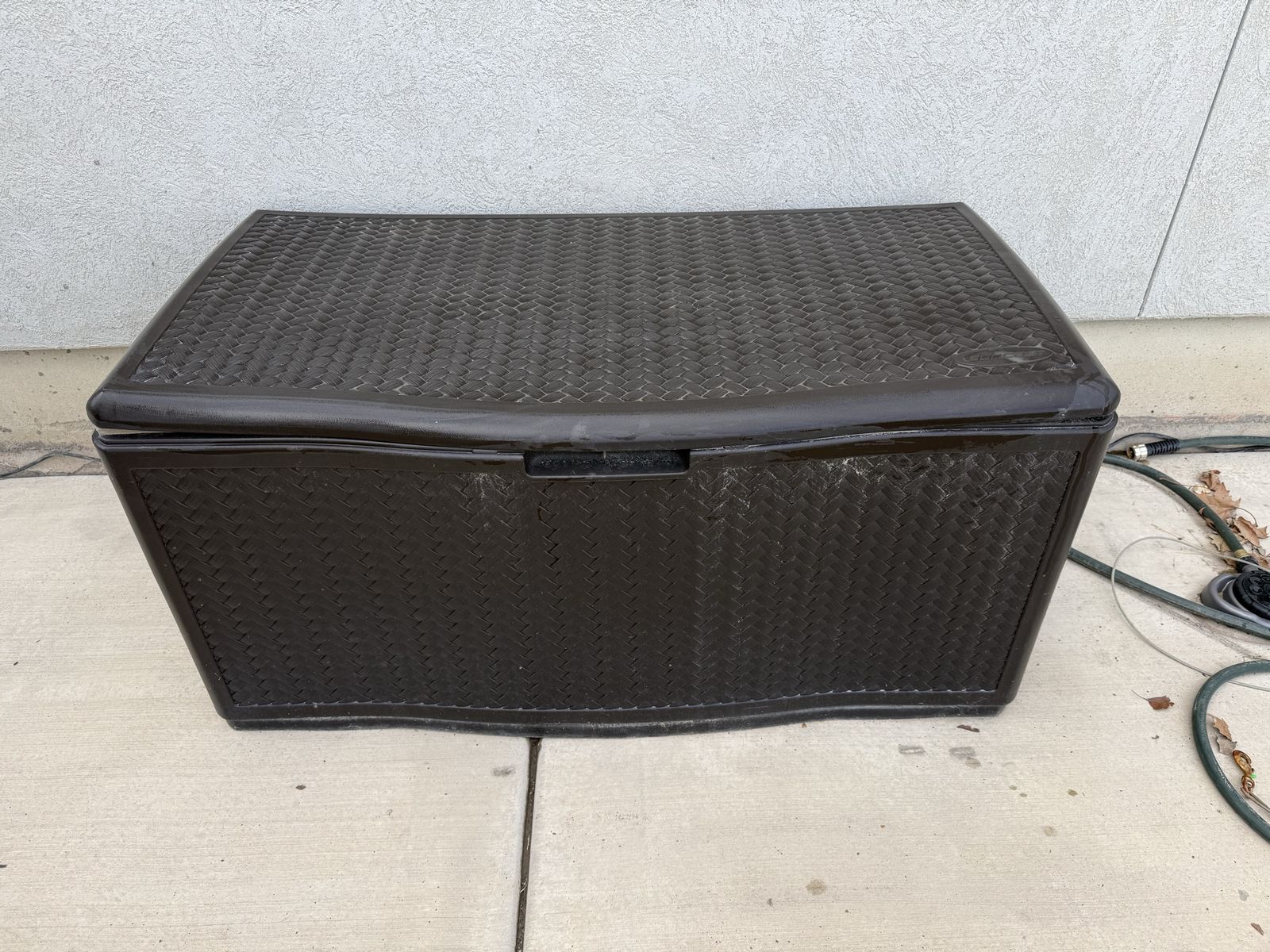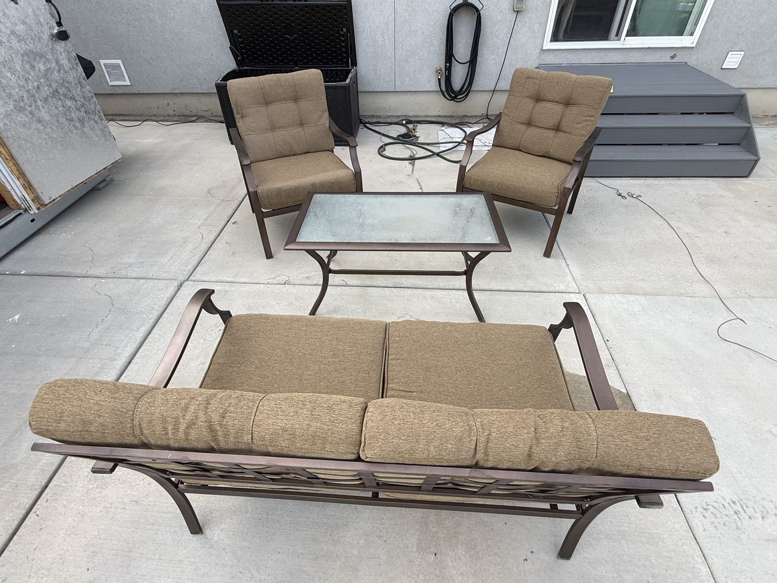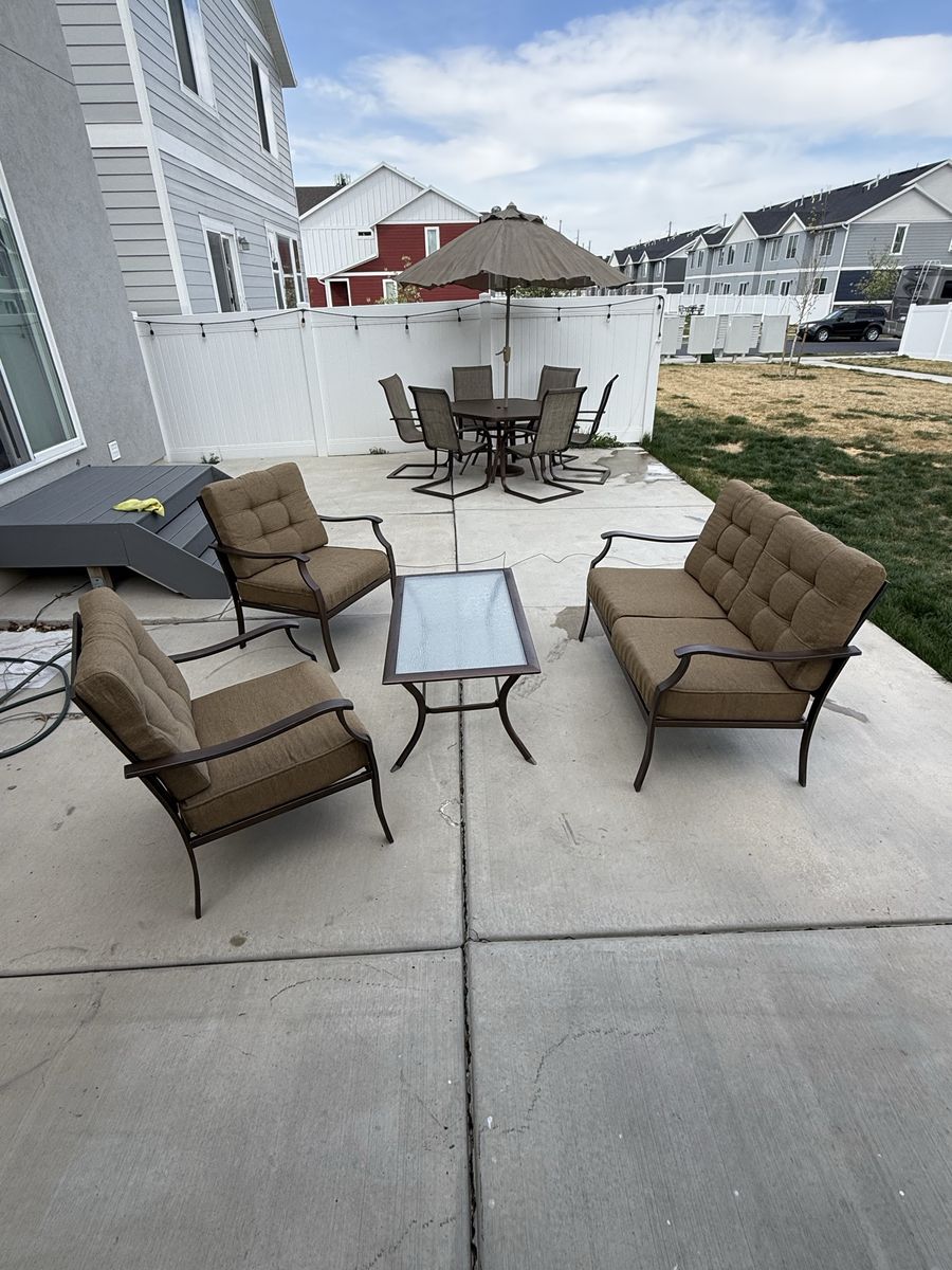 PayPalSpacious outdoor furniture set. Has a 6-seater dining table with an umbrella, plus a lounge set with two armchairs, a loveseat, and a coffee table. All pieces have brown metal frames. Dining chairs have sling fabric. Lounge chairs and loveseat have comfy brown cushions. Coffee table has a glass top. Good condition. Cushion storage box included.