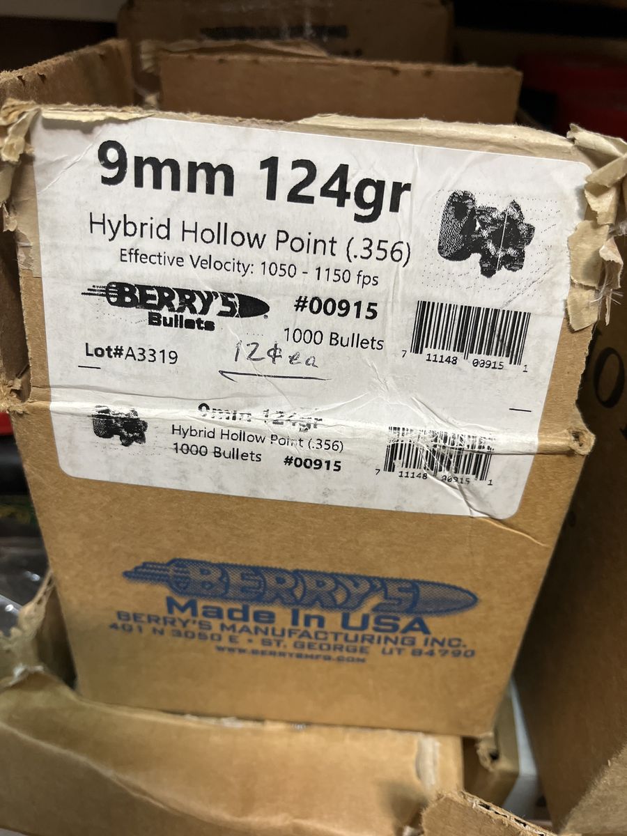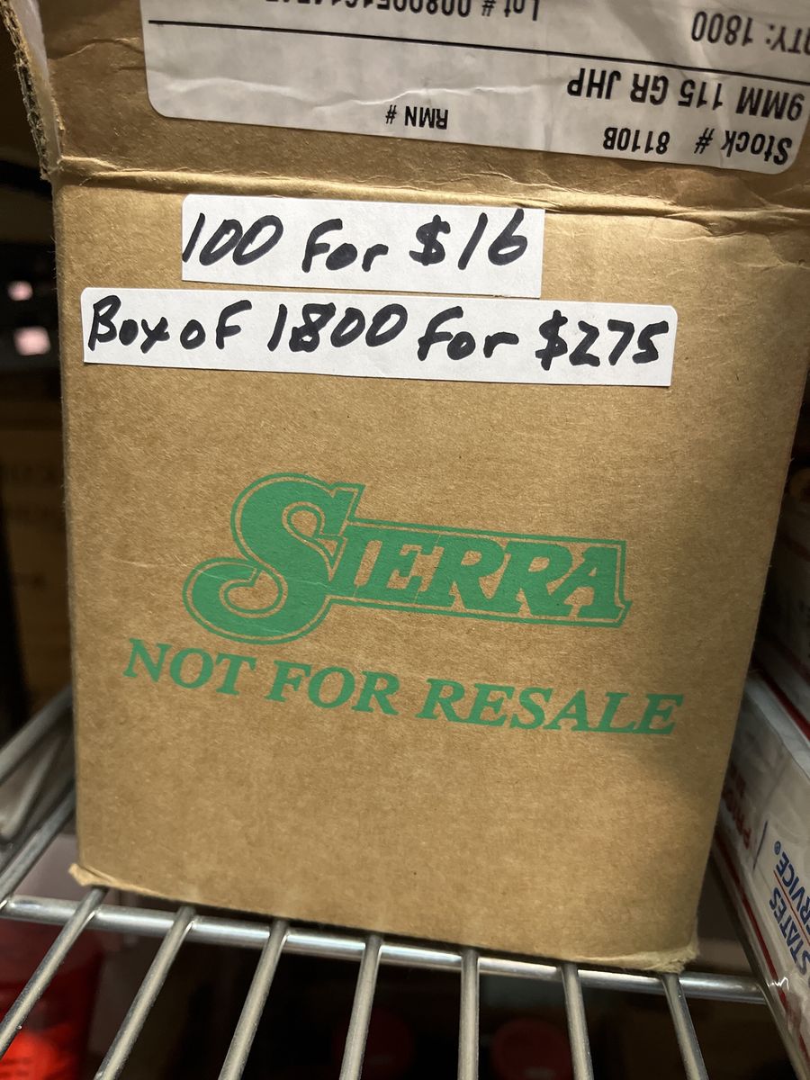 Sierra JHP for $16/100 or 1800 full box for $275. All marked prices will be reduced 10%. 275-10%=247.50. Box of 1000 Berrys for $100-10%=$90.00. Lots of other fmj and JHP and plated bullets too. I will ship for postage costs. Please see my other ads. Thanks, Joe.