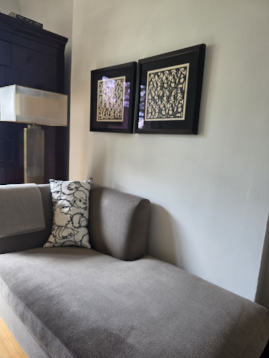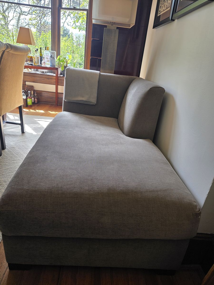ZelleThis handsome, contemporary chaise lounge is from Los Angeles, the RBF International Group, Beverly Hospitality. It is in EXCELLENT condition! The dark gray fabric is spotless. This comfortable chaise measures 34" H, 34" D, and 65" length and it includes white duck feathers for comfort and form. It is understated, yet very functional and it fits nicely in any room.