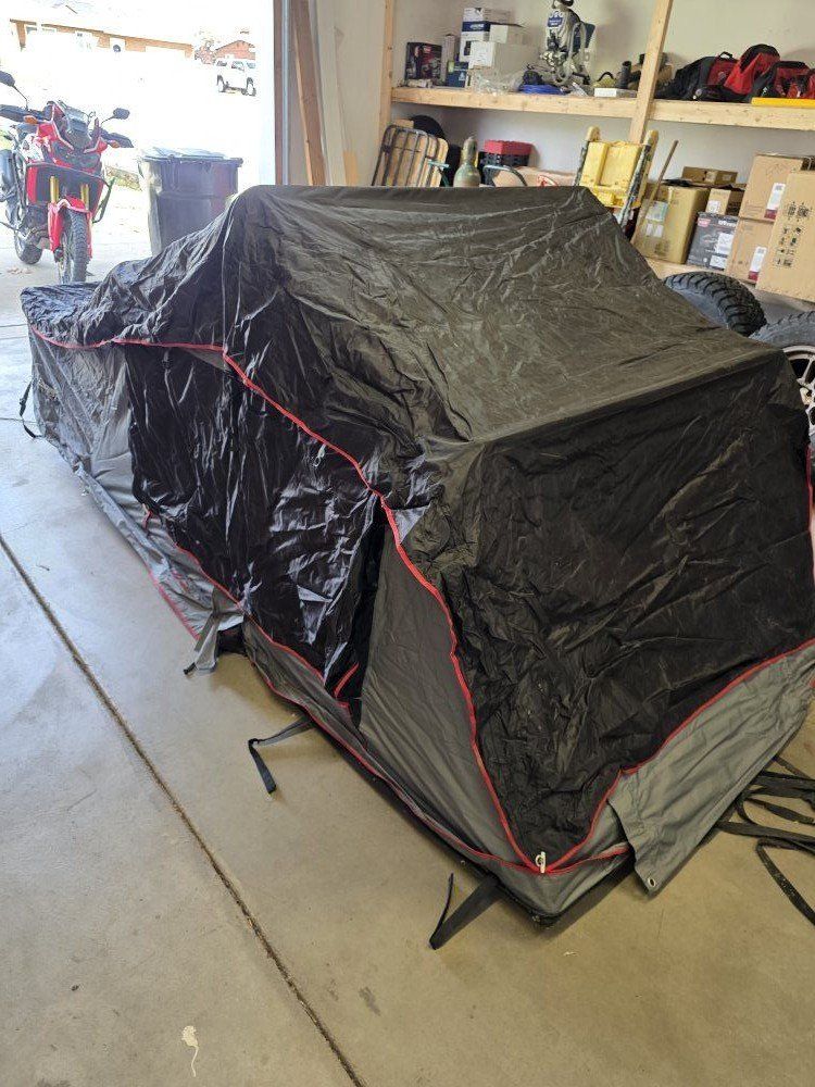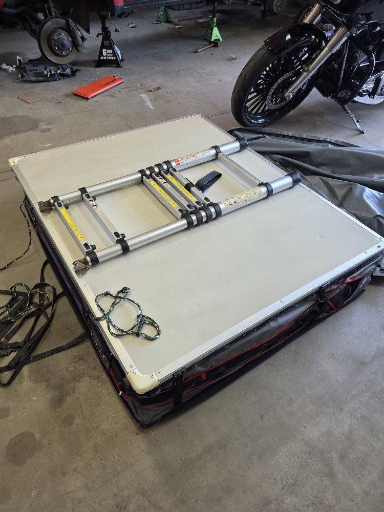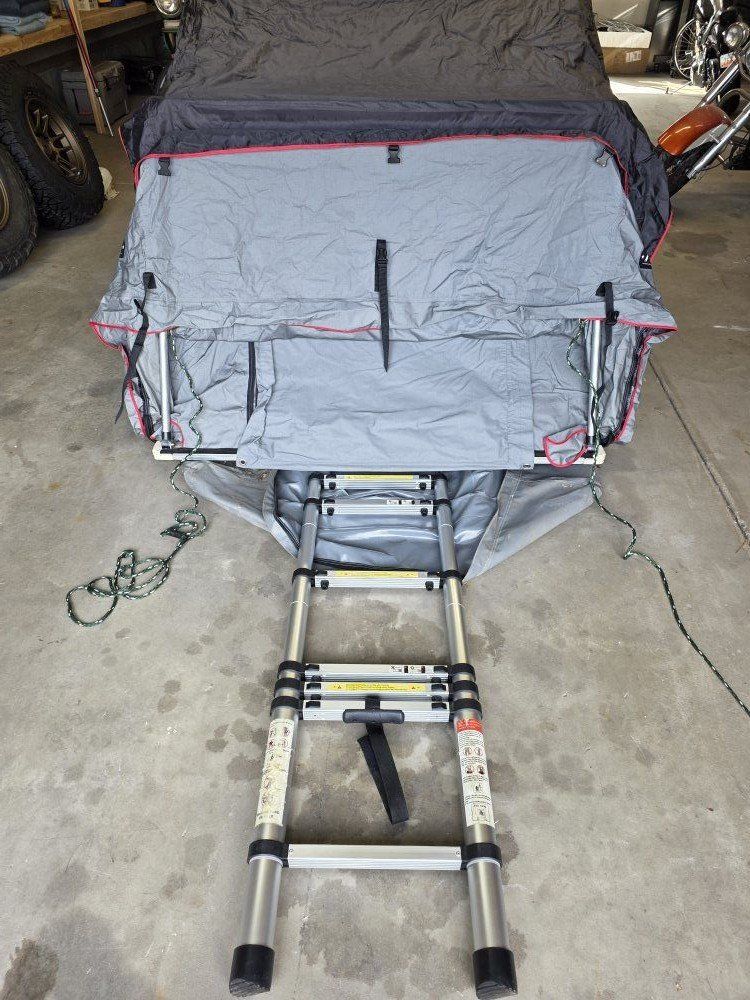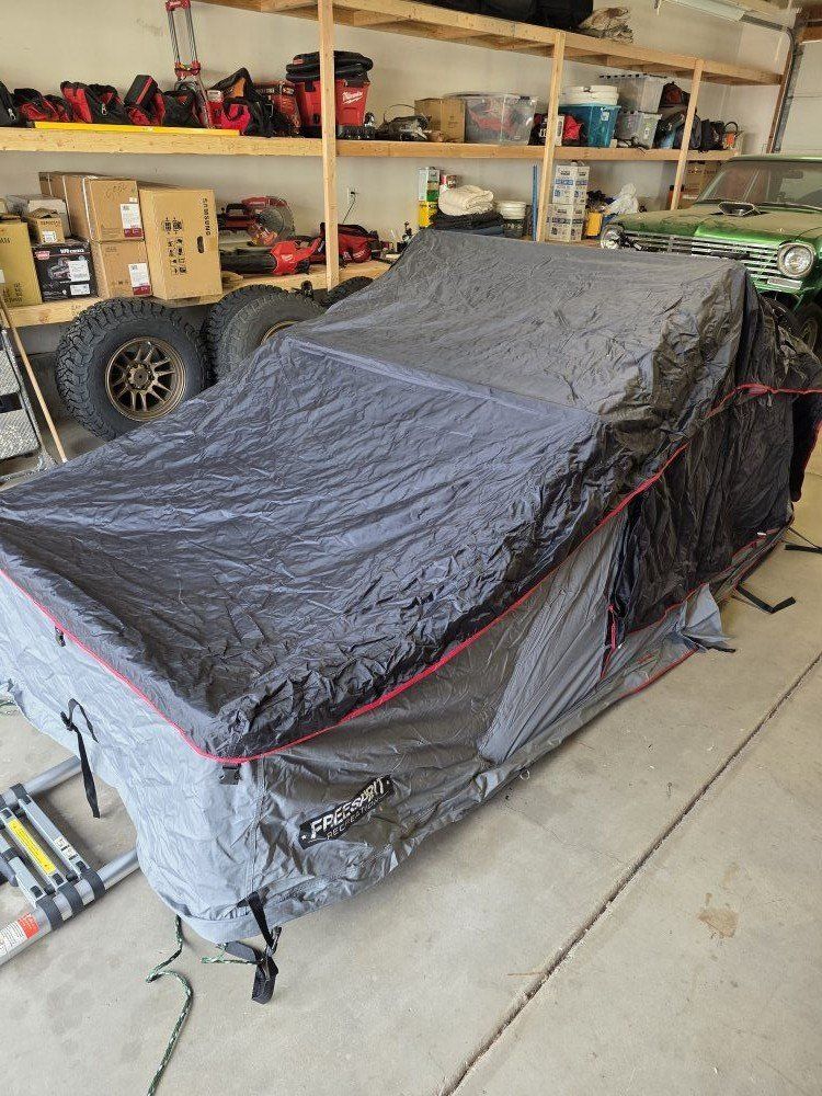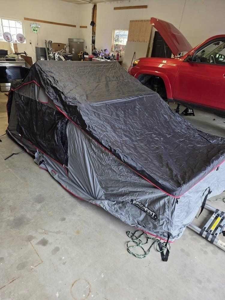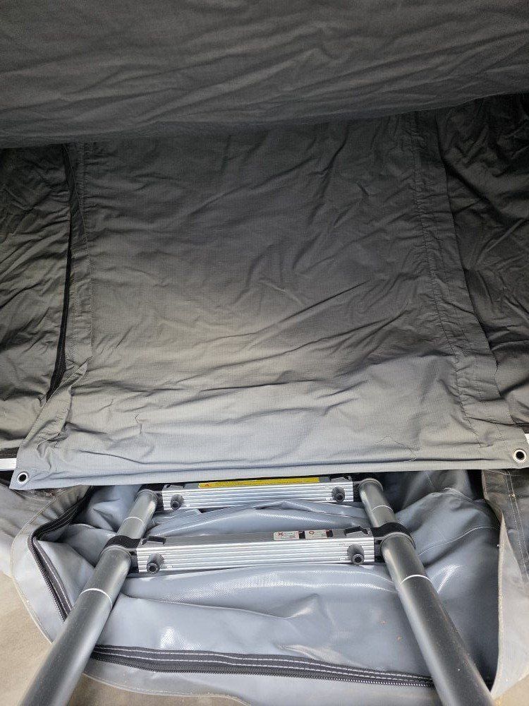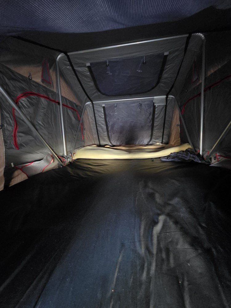 this free spirit roof top tent is in perfect condition. used 6 times with no problems at all. 56x102 for the interior dimensions plus the vestibule you climb up into. this is a very large heavy duty roof top tent. always stored indoors and never exposed to the rain.