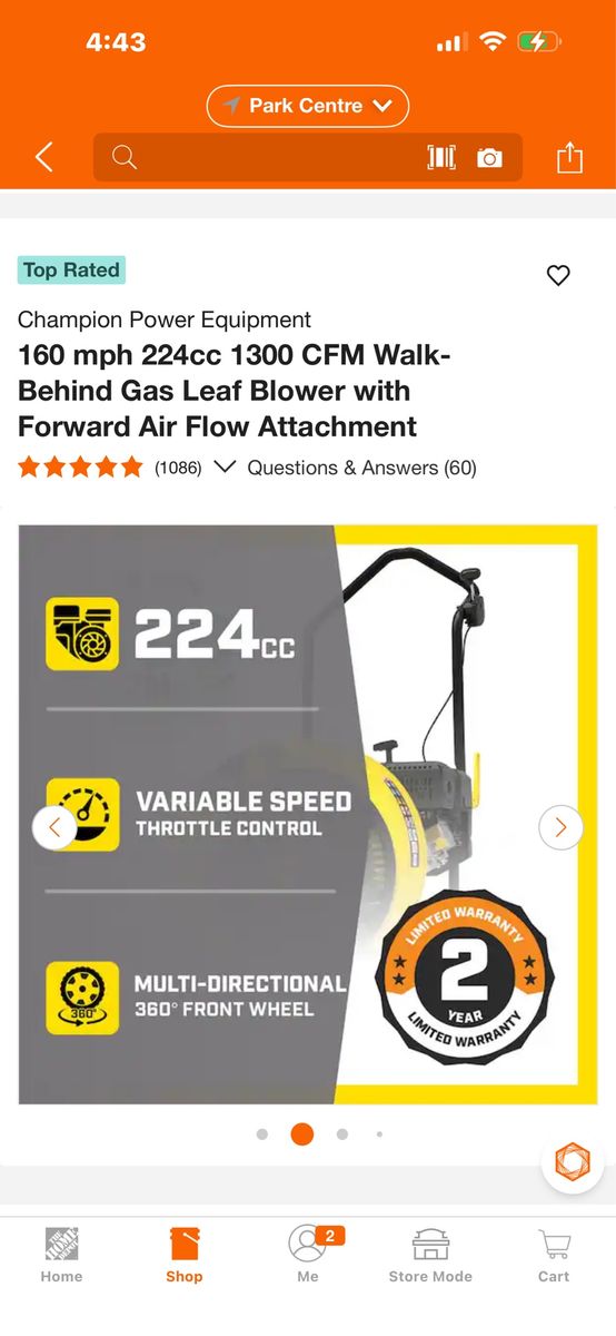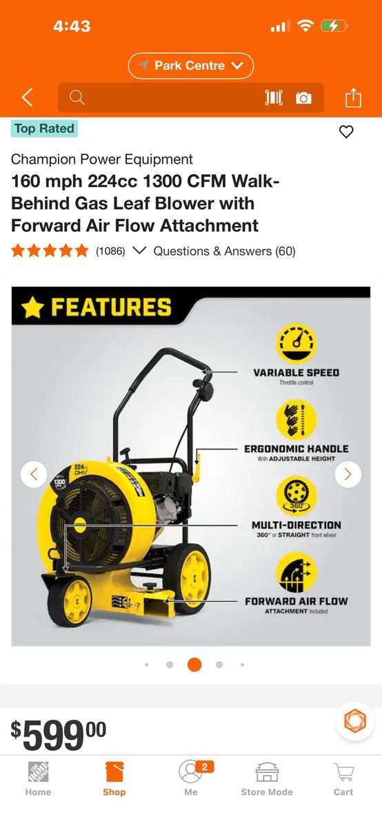 VenmoAsking $350.00, These sell for $599.00 New + Tax at Home Depot. This powerful blower is great for big or small jobs like cleaning debris and leaves from parking lots, driveways, sidewalks. It has a blowing power up to 160 mph / 1300 cfm with a 224cc Champion Motor. It was used once then sat for several years. I had to do a little work on it to get it running. I cleaned the fuel tank and carburetor, replaced the fuel line and engine oil. Now it runs great. If Interested or have Questions Text, Message or Call John at 801-678-5503