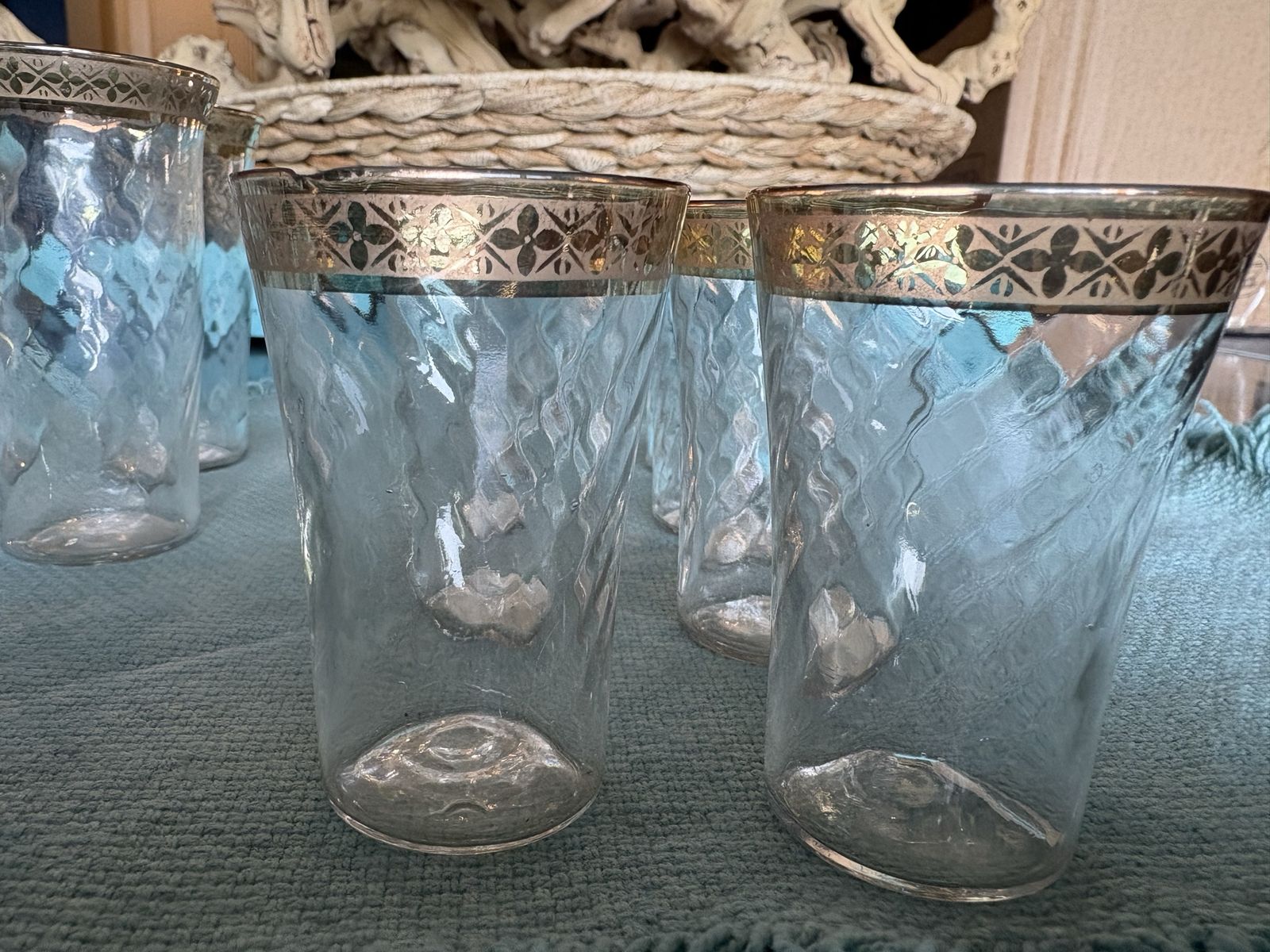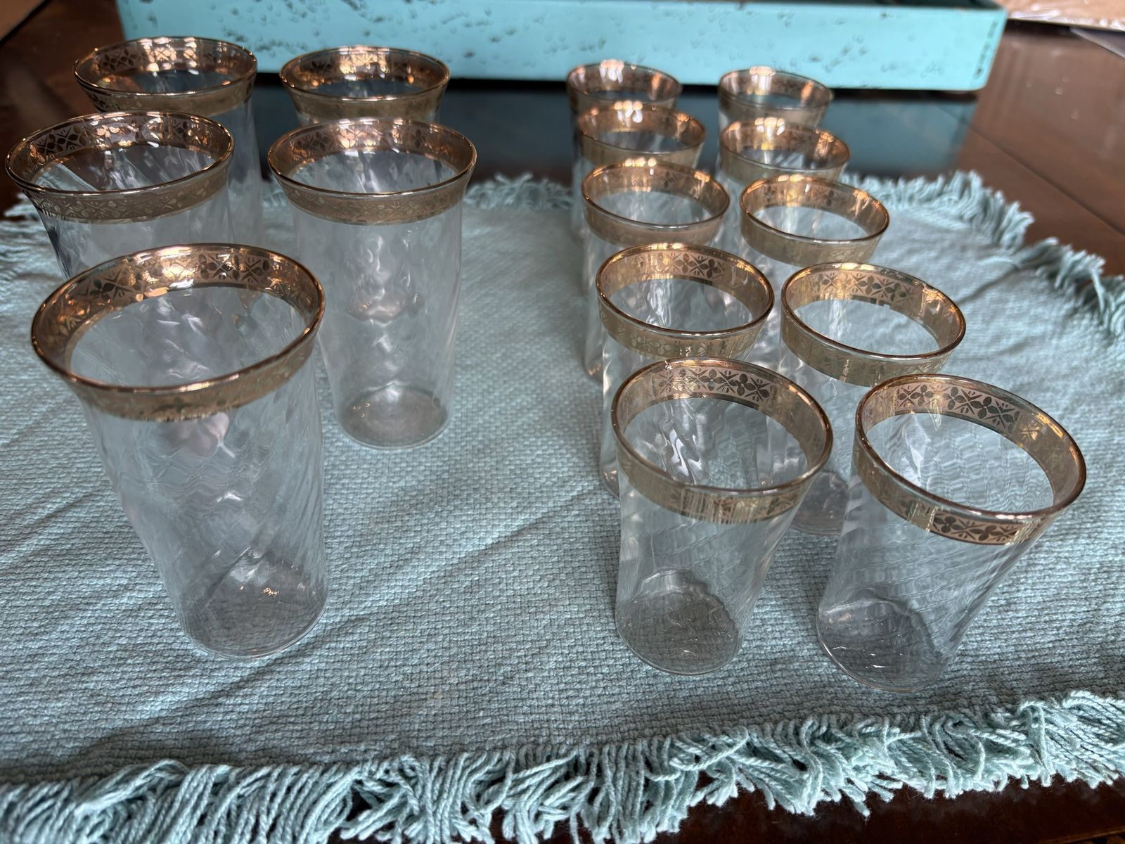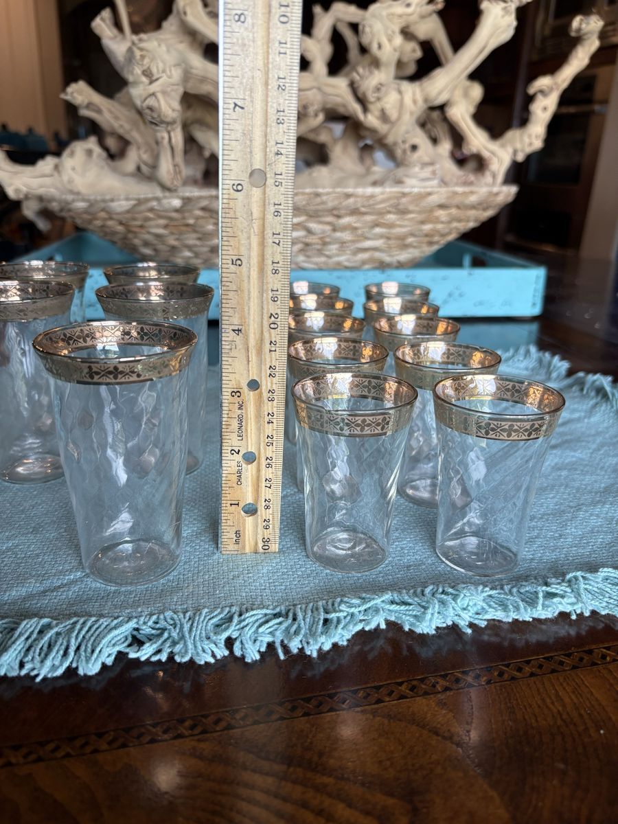 VenmoMid-Century Modern Gold Rimmed Swirl Optic Cocktail Elegant Barware 5 approx 4 oz 10 approx 2 oz 1 smaller has a chipped rim