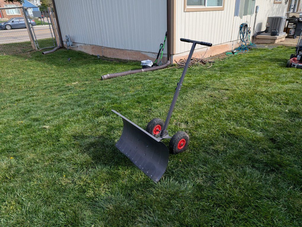 Has grippy inflatable rubber wheels, adjustable shovel pitch, and adjustable handle angle.