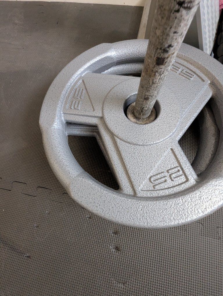 Barbell is standard size and weights include 2x25 lbs, 2x10lbs, and 2x5lbs plates.