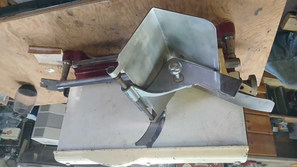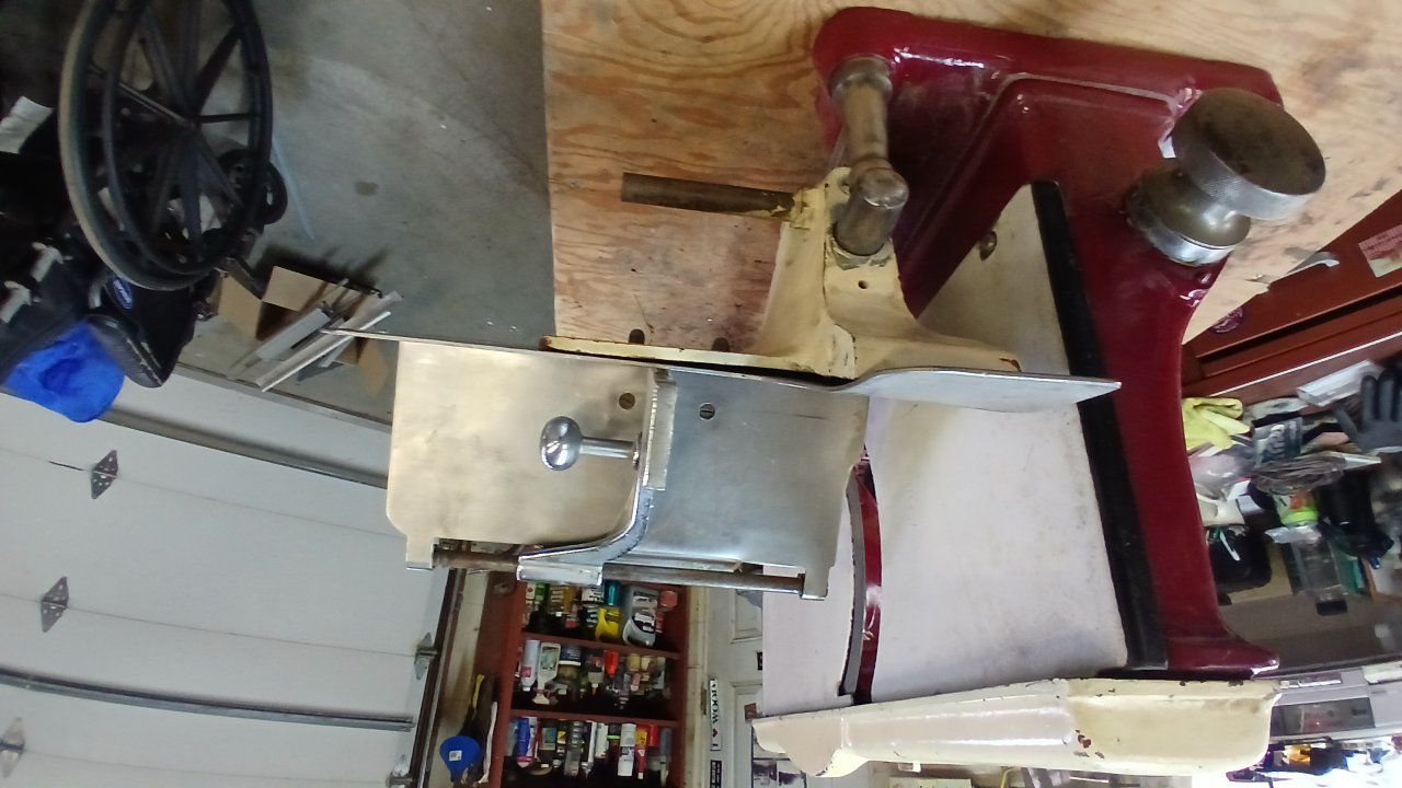 american slicing machine. I started rebuilding it. have found a old style motor for it. before the old motor went out it worked good . if you want to finish this slicer , it is bullet proof. automatic blade sharpener built in. weighs about 65lbs. 190.00 or make offer. make your own thin slice roast sandwiches. I have found an older 1/4 hp motor for it. works good.