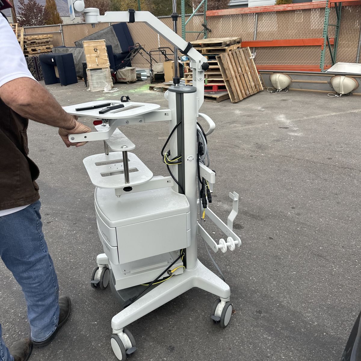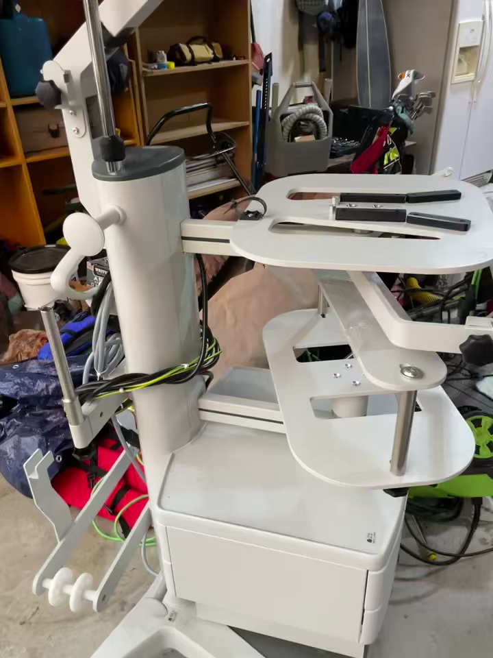 This is a high-quality medical-grade rolling cart with adjustable arms, shelves, and storage. Very sturdy and well-built.