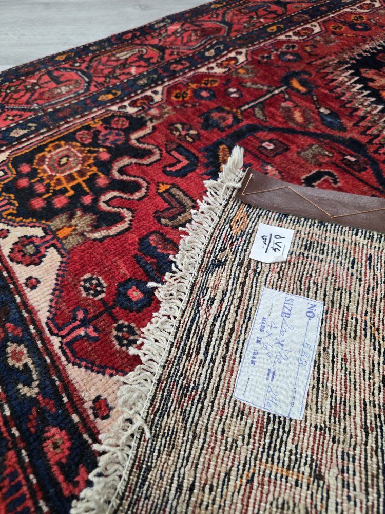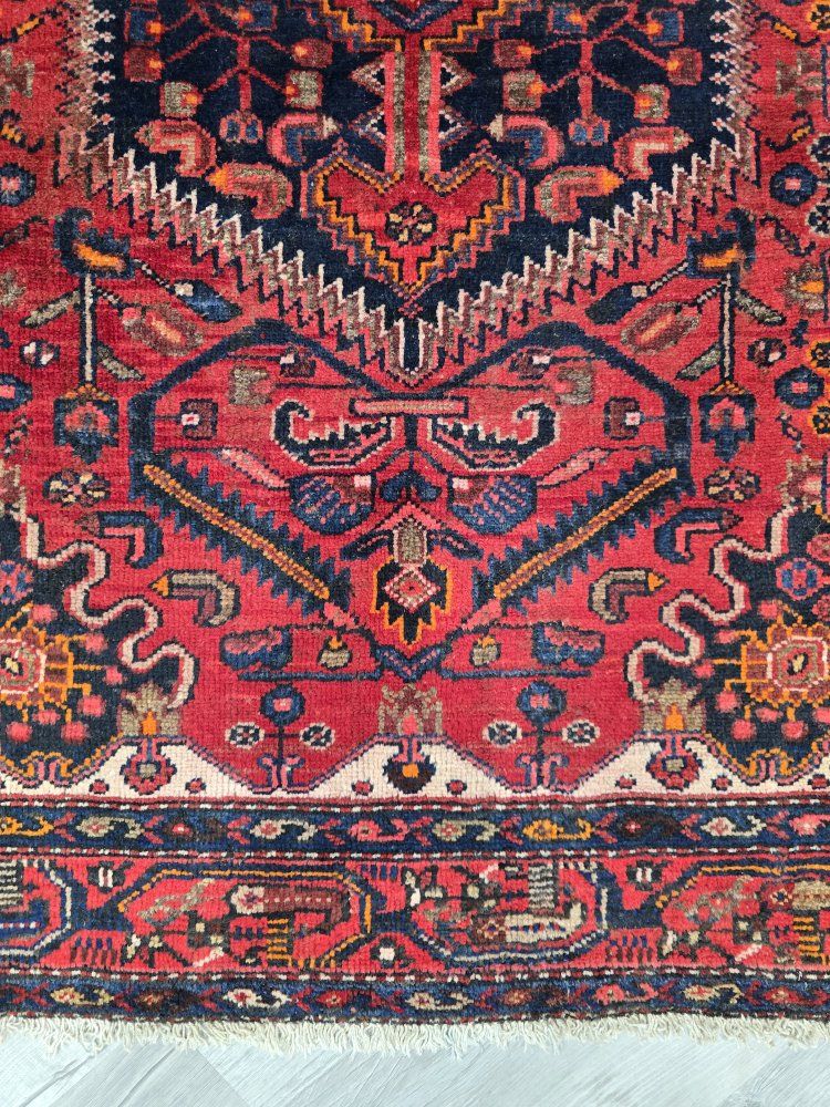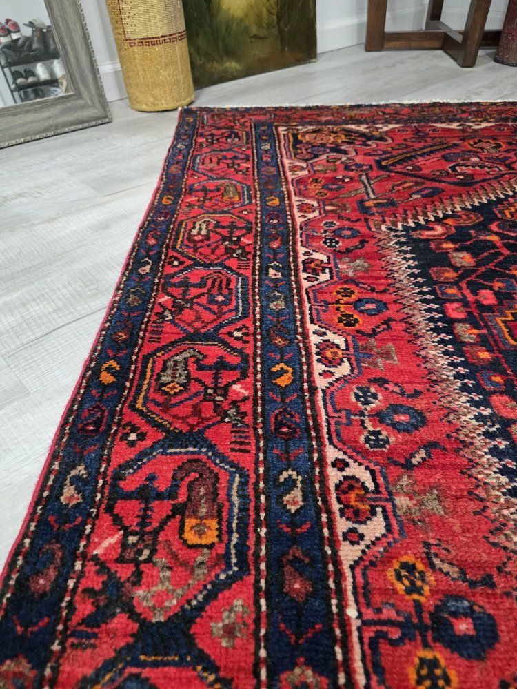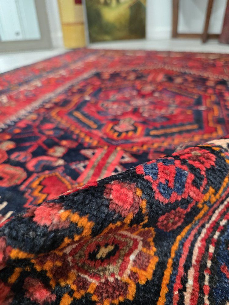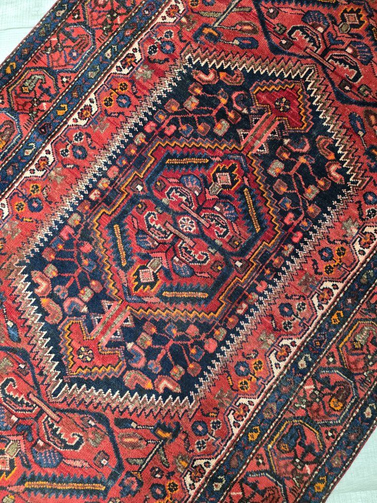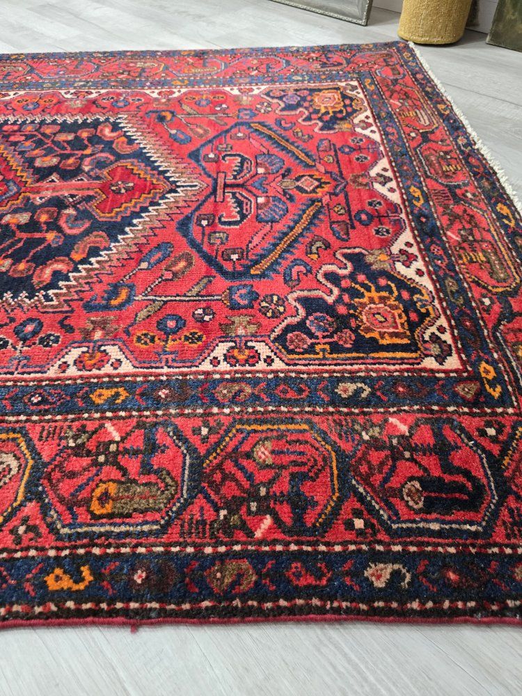 ZelleThis striking Persian Hamedan rug is a true piece of Kurdish village artistry, packed with bold character and timeless appeal. Woven in the Hamedan region of Iran it features a powerful geometric medallion filled with lively tribal motifs and stylized figures. The colors are rich--you've got different shades of reds and blues throughout and hints of burnt orange and ivory. This design also has that perfect "collected overtime" look. It is earthy, expressive, and full of movement. It's the kind of rug that instantly adds warmth, history, and a bit of soul to wherever it lands.