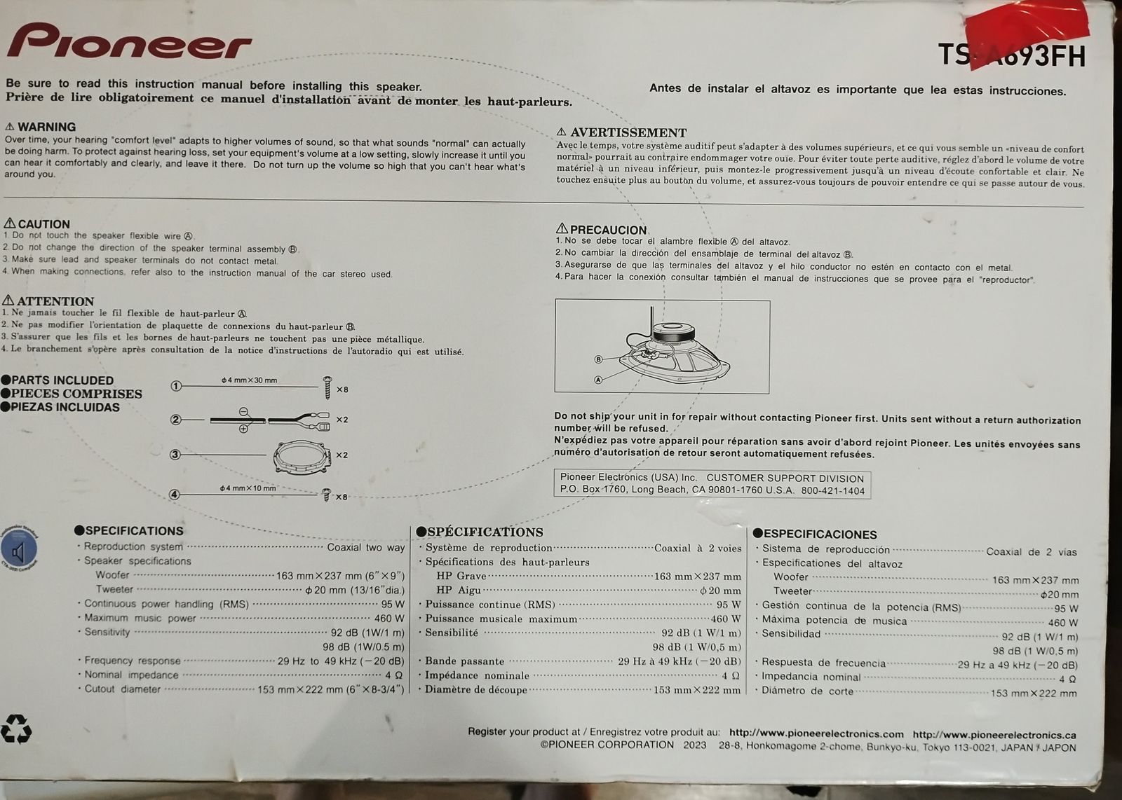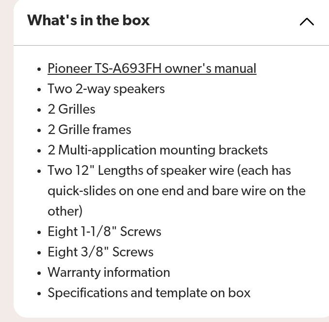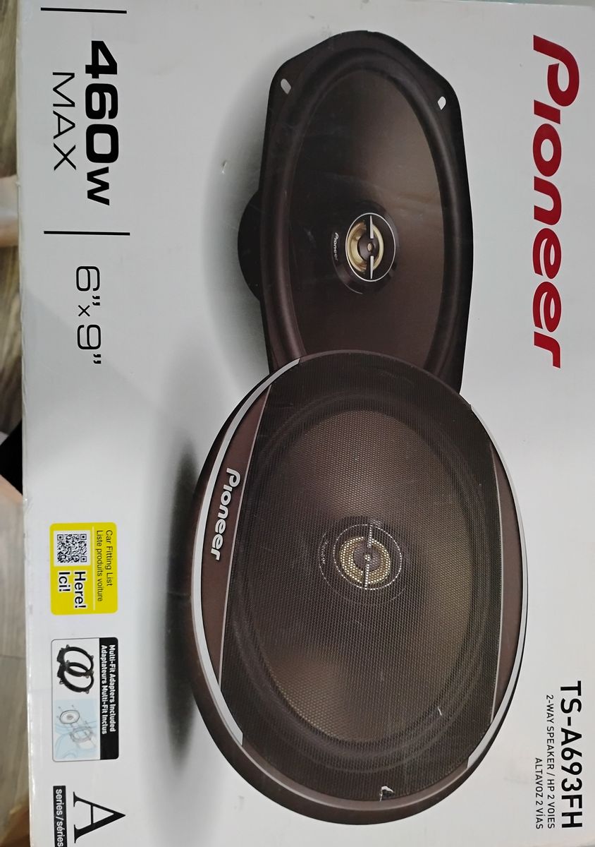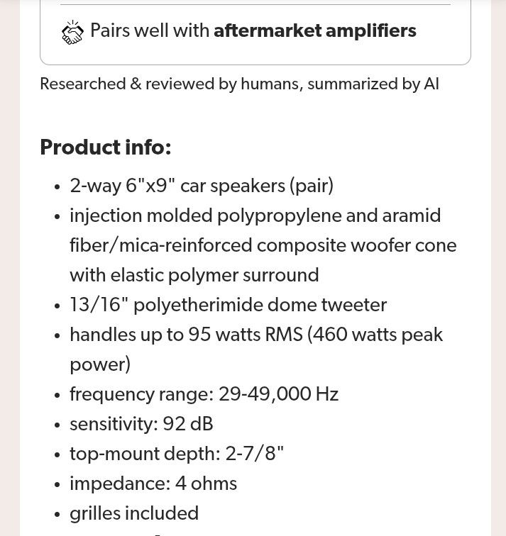 Product info: 2-way 6"x9" car speakers (pair) injection molded polypropylene and aramid fiber/mica-reinforced composite woofer cone with elastic polymer surround 13/16" polyetherimide dome tweeter handles up to 95 watts RMS (460 watts peak power) frequency range: 29-49,000 Hz sensitivity: 92 dB top-mount depth: 2-7/8" impedance: 4 ohms grilles included
