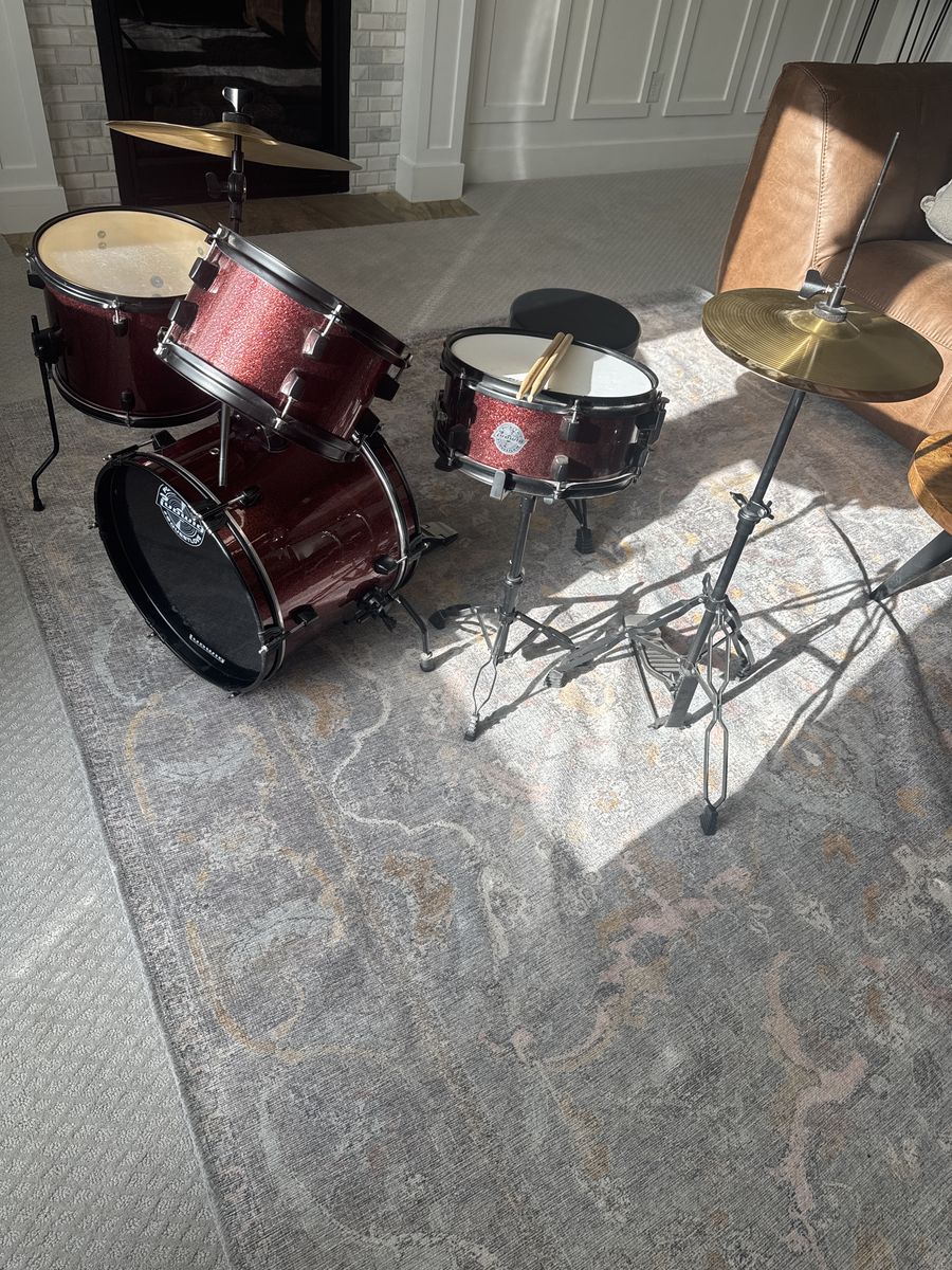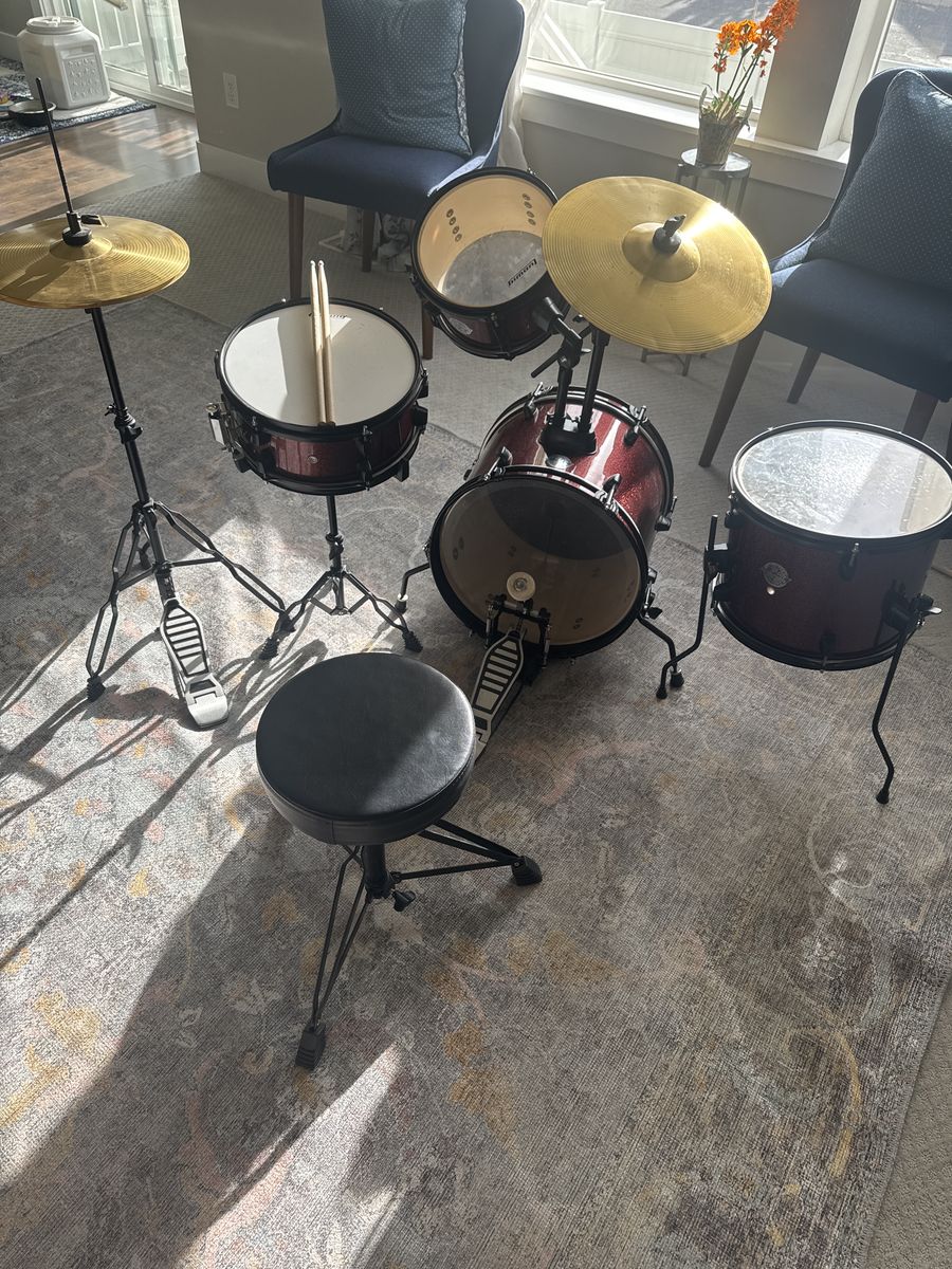 VenmoUsed Ludwig kids drum set, 5 Piece 16in youth full drum set with Bass, Toms, Snare, Floor Drum, Adjustable Throne, Cymbal, Hi-Hat Pedal, stool. This is a Starter Drum Kit for kids, red sparkle color. Good condition, 1 previous drum owner outgrew set.