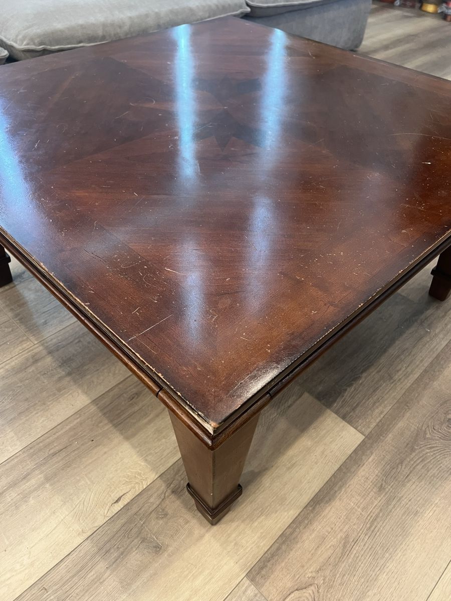 VenmoBernhardt Furniture coffee table. Made of solid wood, it’s heavy! In pretty good condition. Just has a couple of surface scratches that need to be buffed out.
