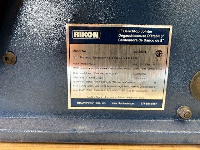 VenmoFor sale is a Rikon 8" Benchtop Jointer. This is Rikon model# 20-800H. This jointer has a helical cutter head on it. This has been used very little. I bought it for a woodworking project several years ago, that it performed great on, and hasn't been used much since then. This comes with two push block and the dust collection port reducer in the pictures.