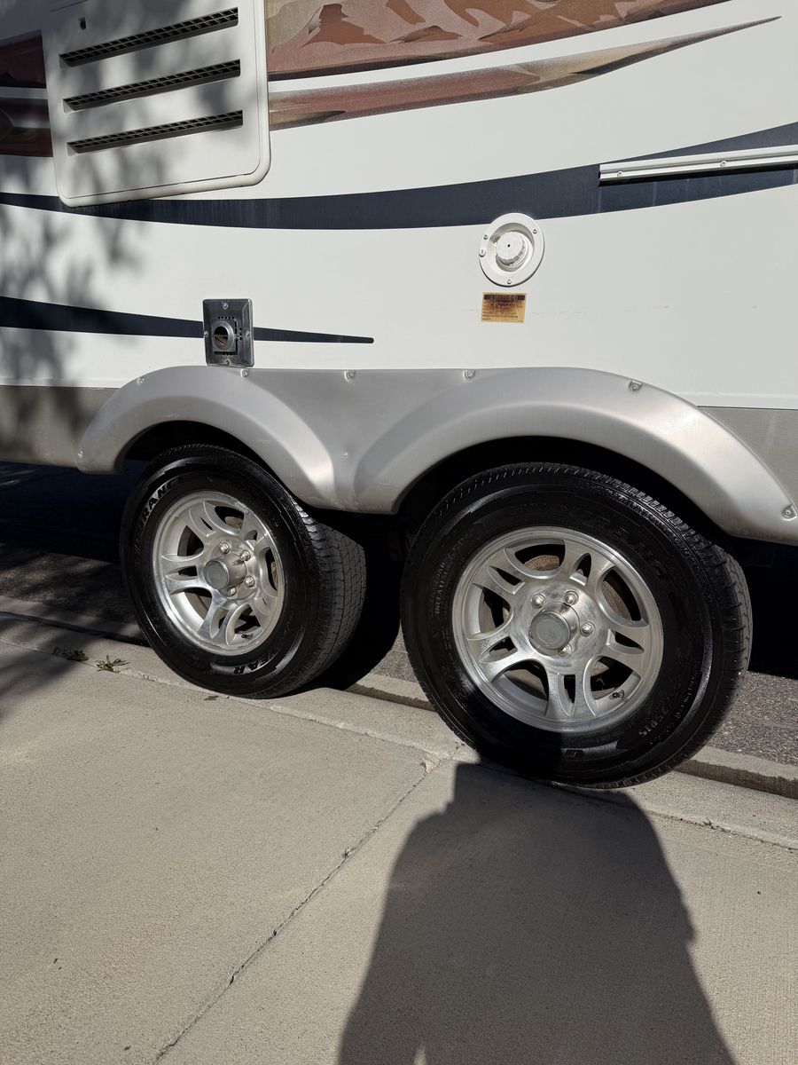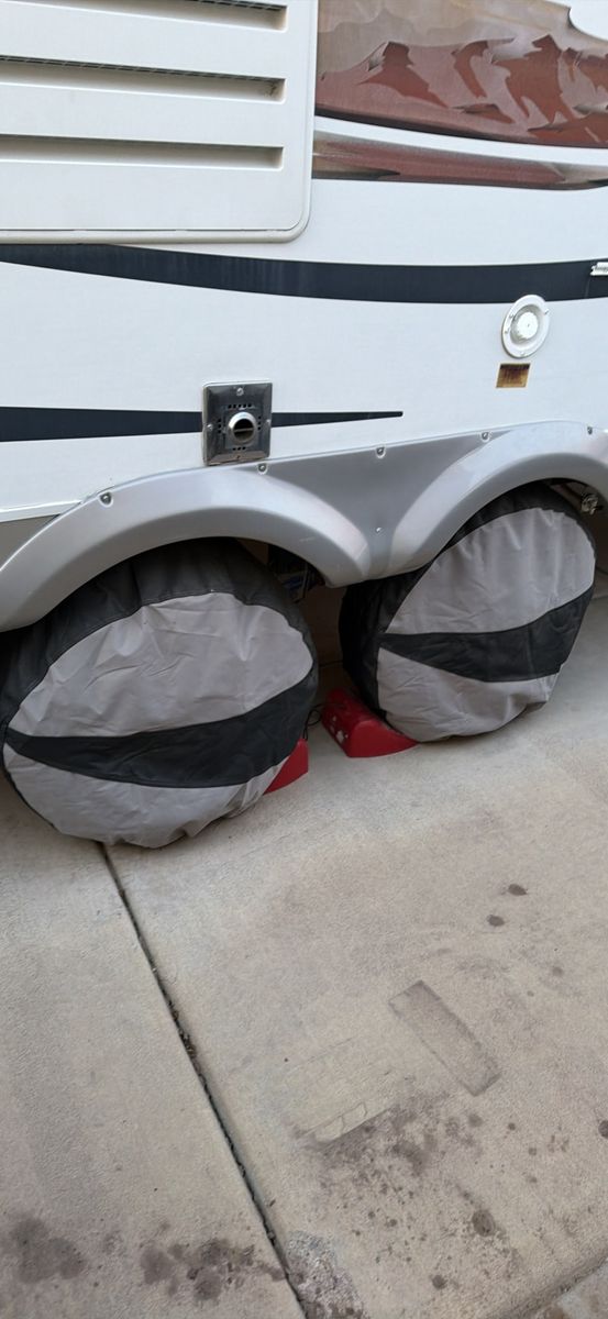 Four trailer tires less than four years old with new tire covers
