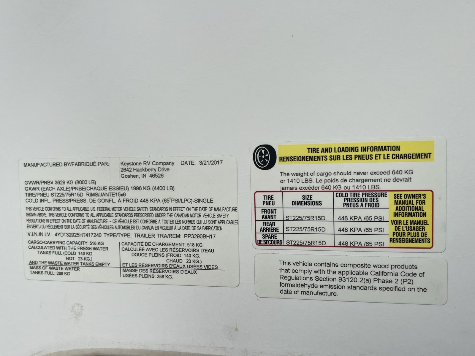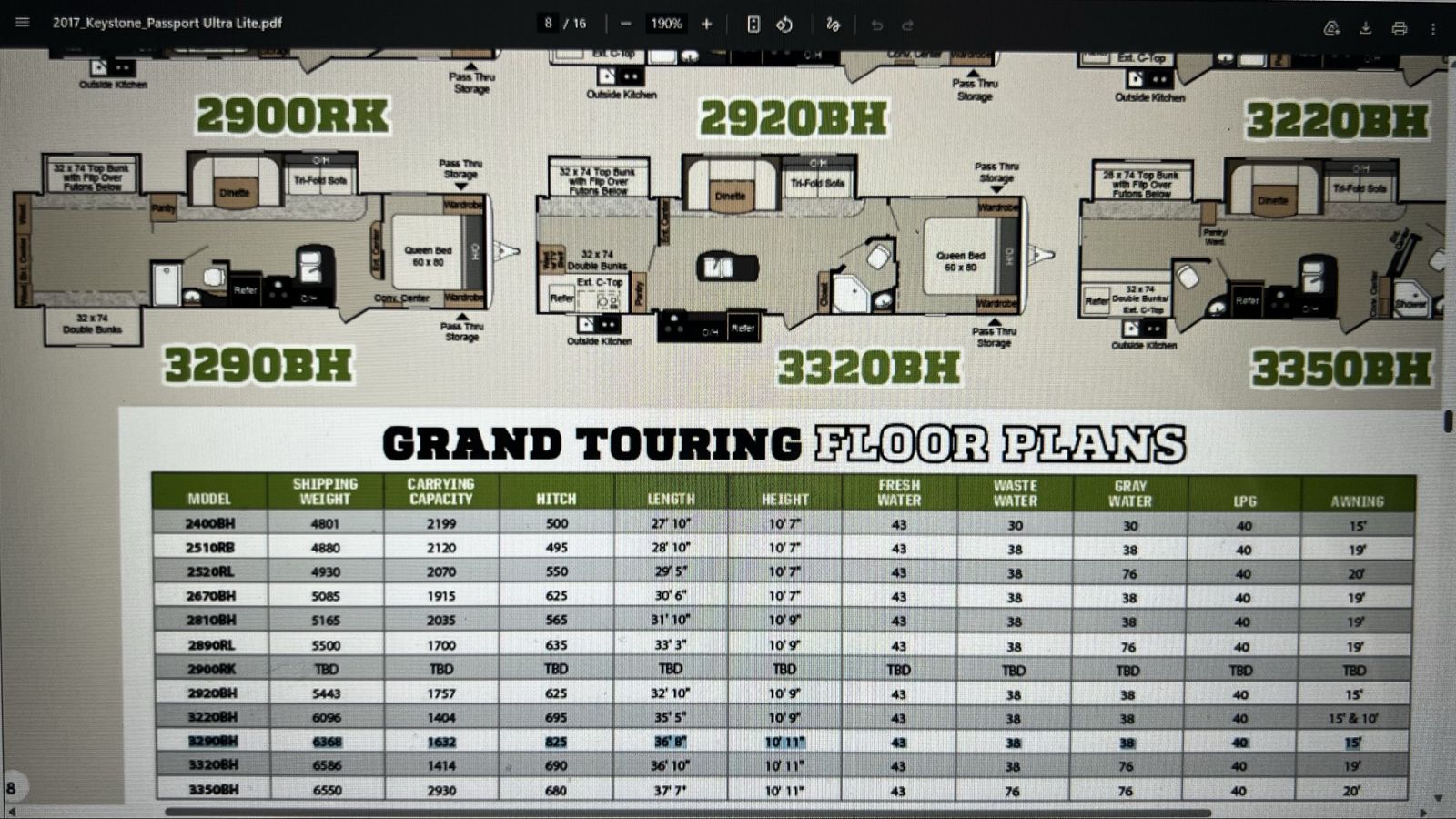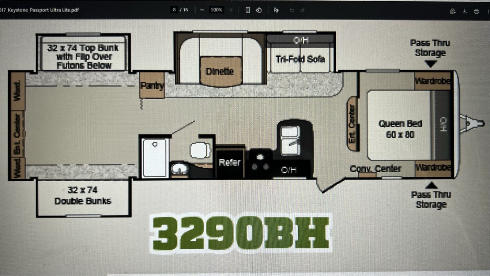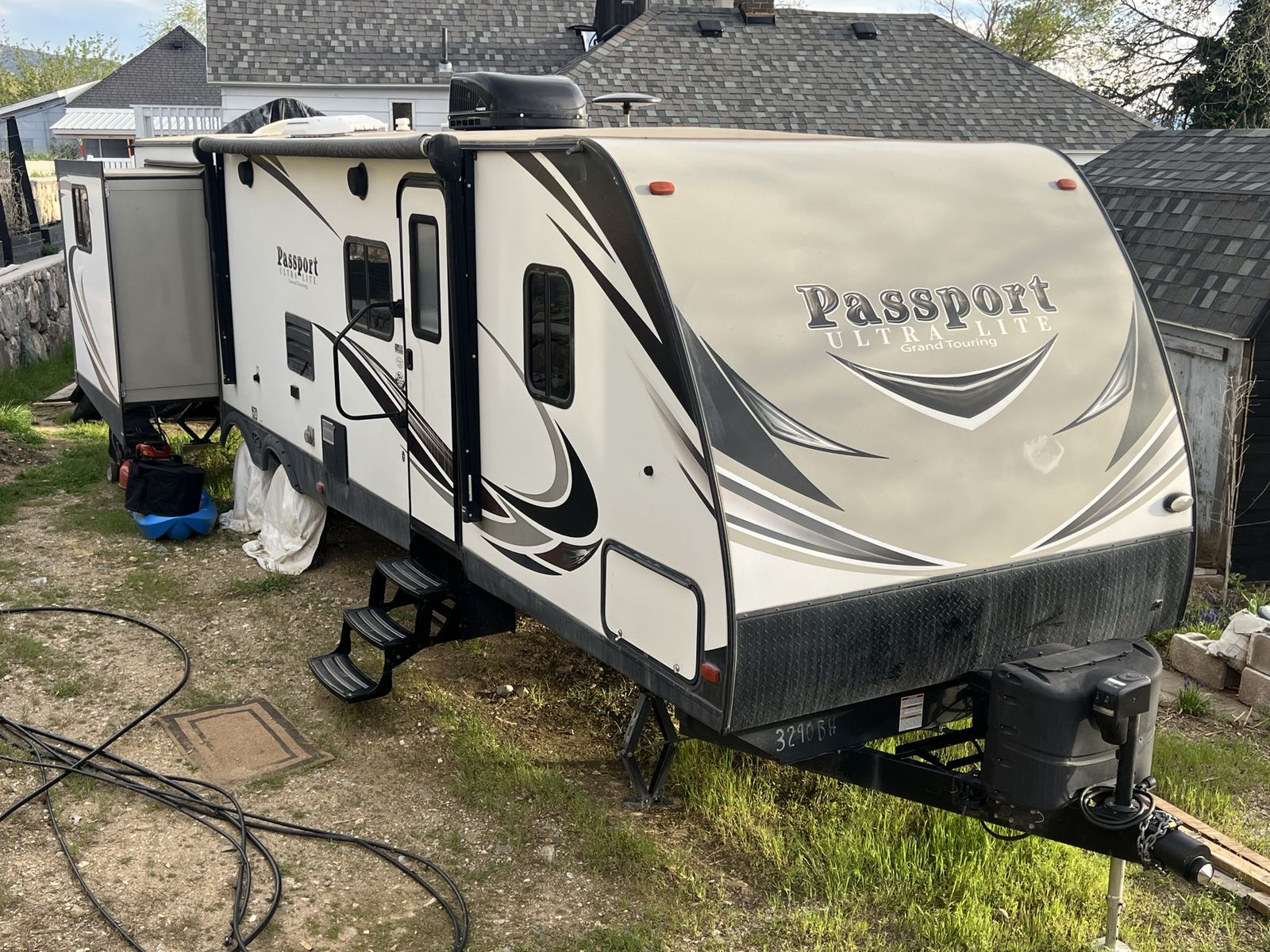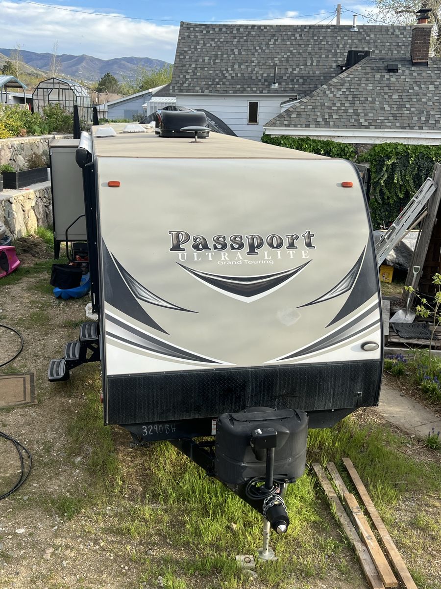 Barely used 2017 Keystone RV PASSPORT Grand Touring Ultra Lite model 3290 BH. Mostly stock, with a few extras. Extras: 100Ah Lithium Ion battery, collapsible portable 63 gallon fresh water tank, some kitchen items, full sized memory foam mattress (pictured on top of the queen mattress that came with the camper (which is still in the original plastic), included hitch stabilizer & electric tongue jack. Tires only have around 2000 miles on them, spare never used, all replaced at Burt Brothers about two years ago. Available for viewing now, available for purchase at end of April.
