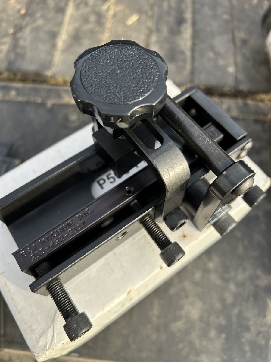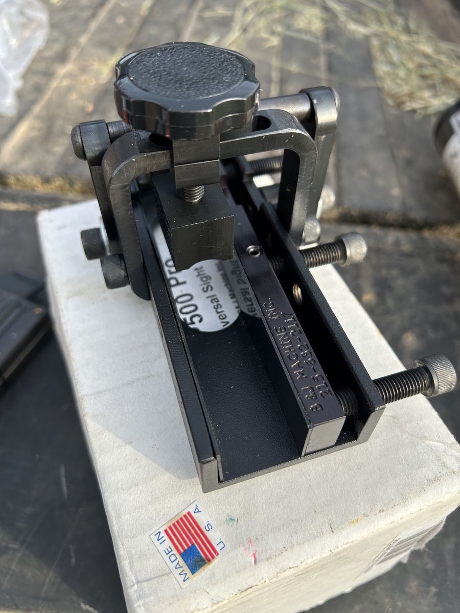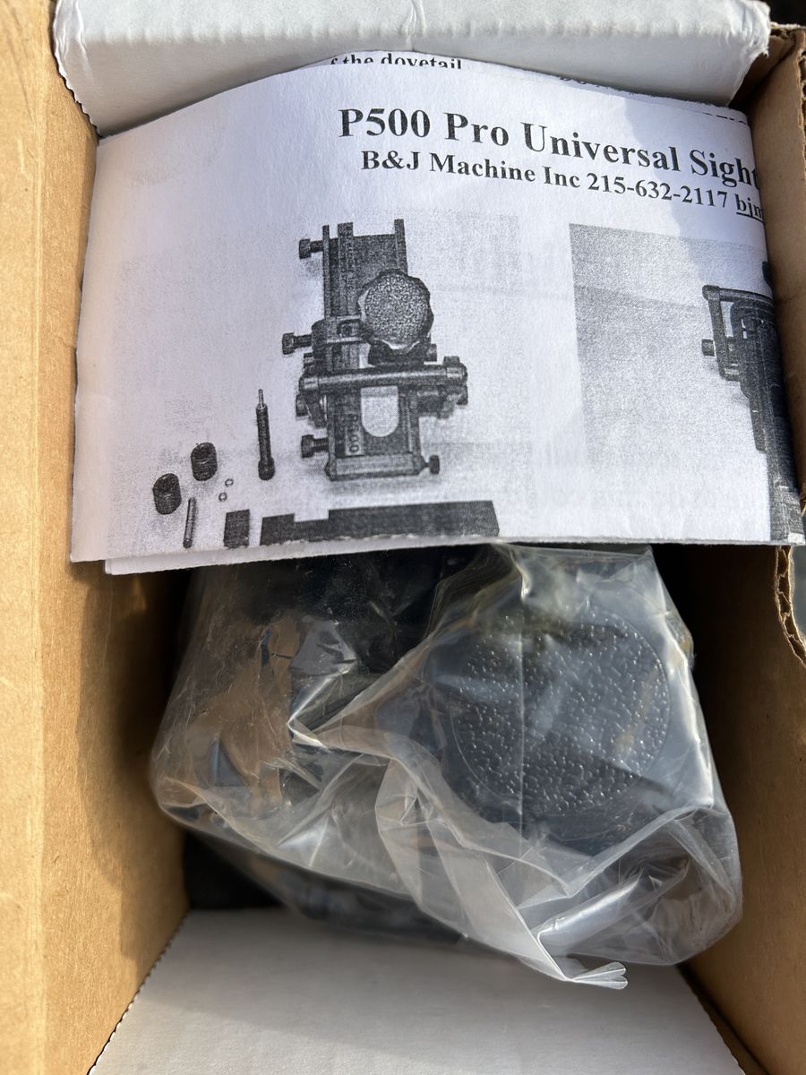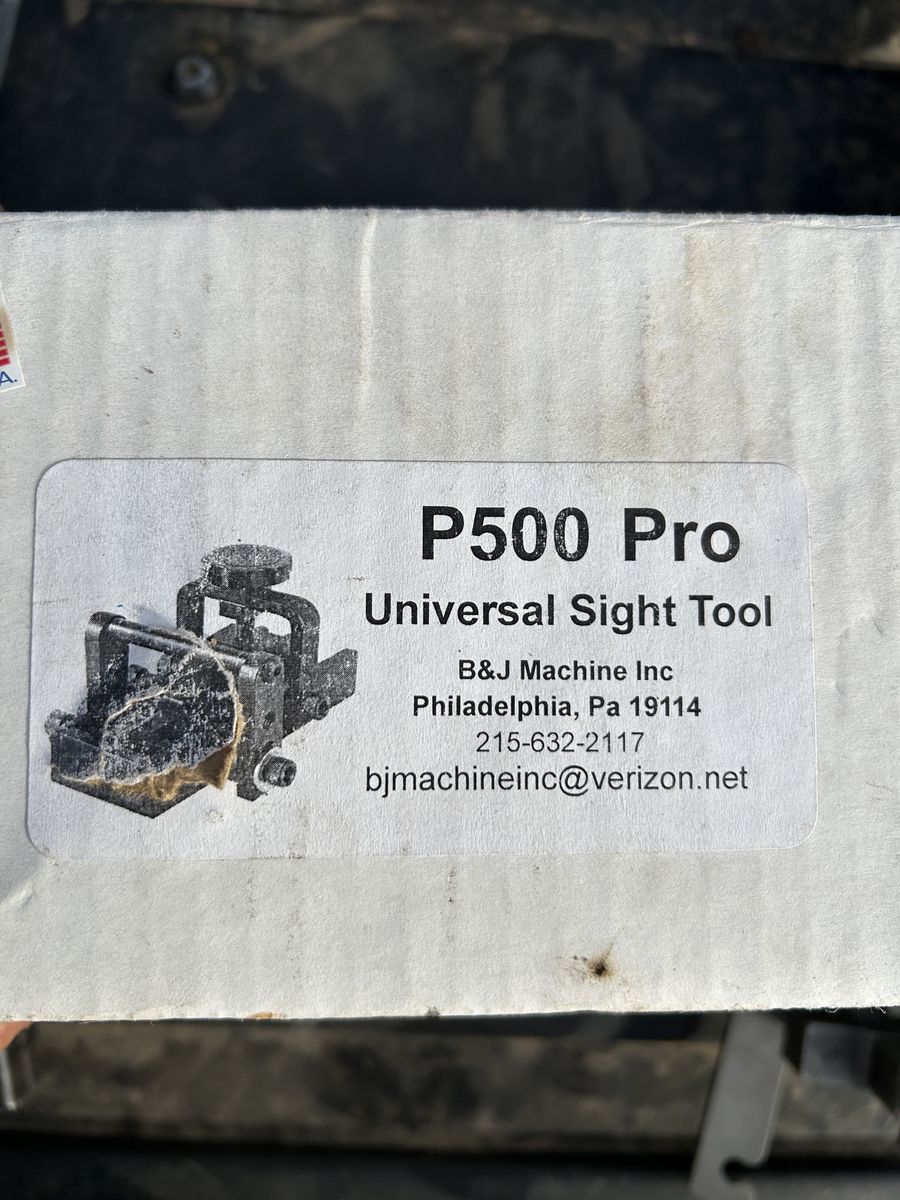 The B & J Machine P500Pro Universal sight tool is designed to remove, install and adjust front and rear dovetail sights on semi-automatic handguns. The most important improvement over the Standard Universal tool is the newly designed pusher tips. The Pro Universal pushers use hardened steel tips and a guide to prevent rotation, which can mar the sight. Two pushers are included: one with a squared end for standard sights, and one with an angled end to push against tapered sights, such as those found on Glock handguns. Another improvement over the original tool is a two position hold down clamp which speeds up setup and prevents the slide from lifting or twisting. The newly added end plate adds strength as well as keeping the slide from shifting.