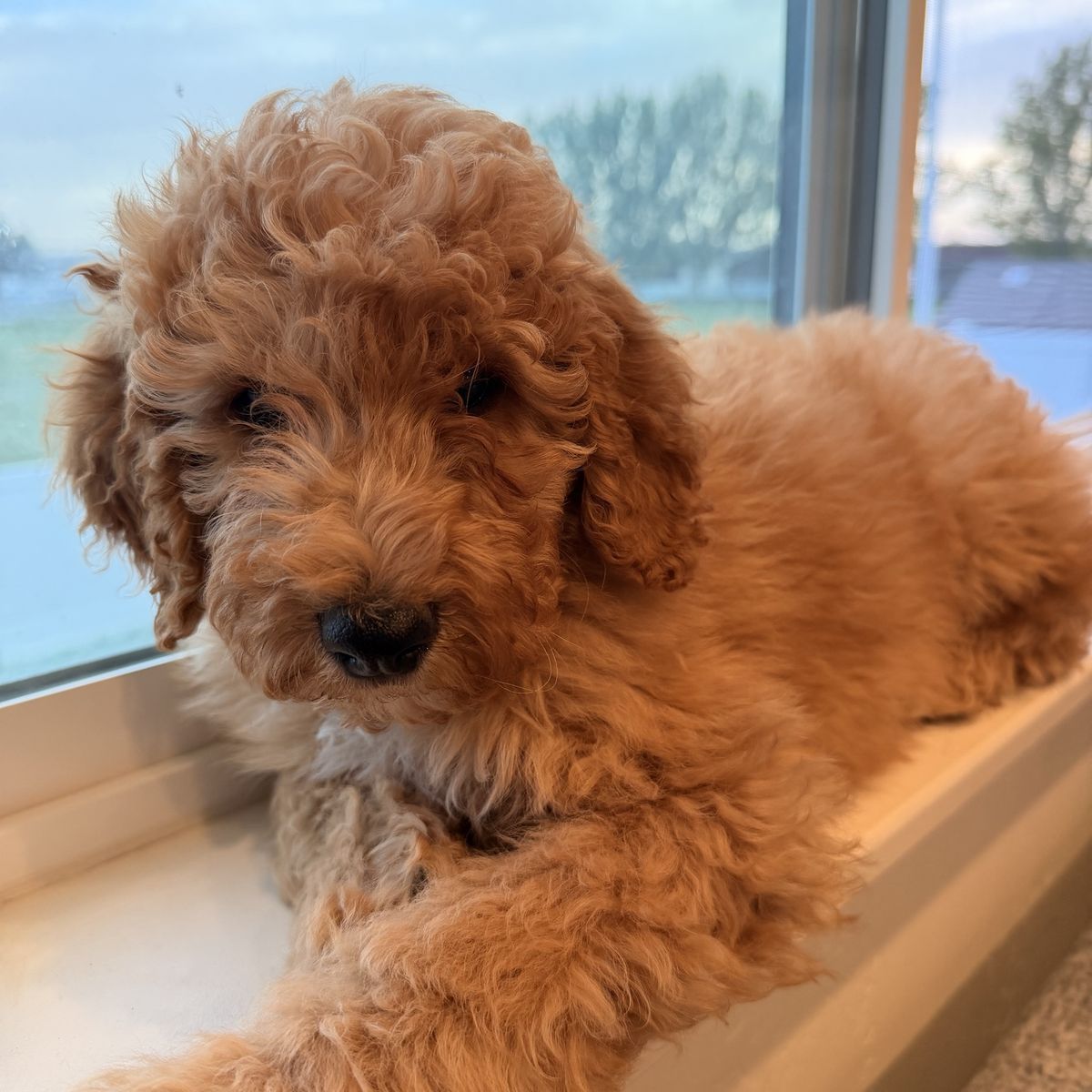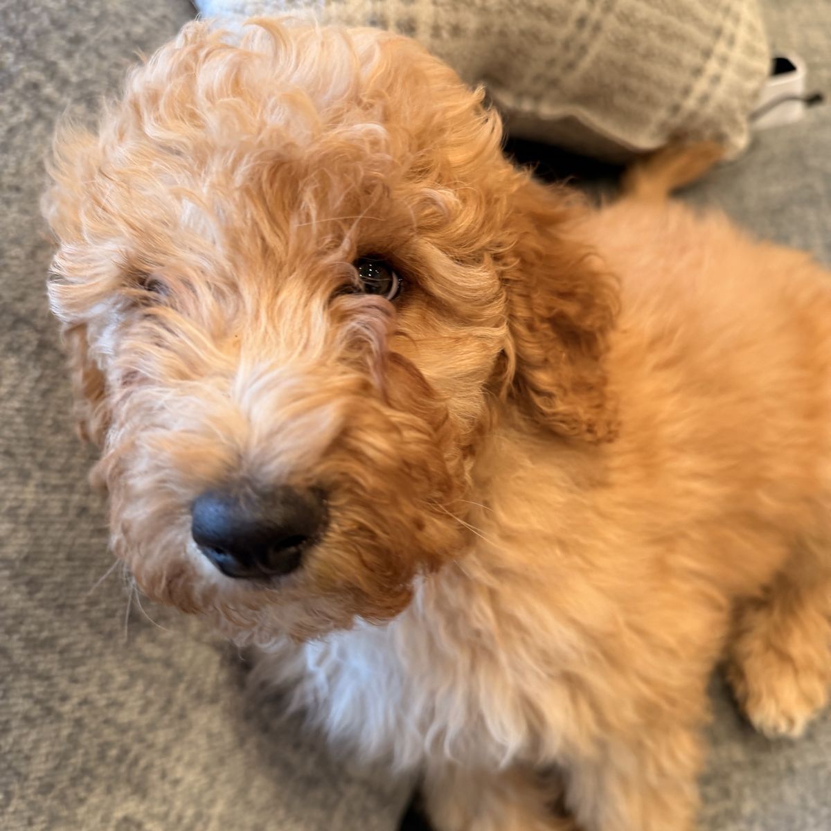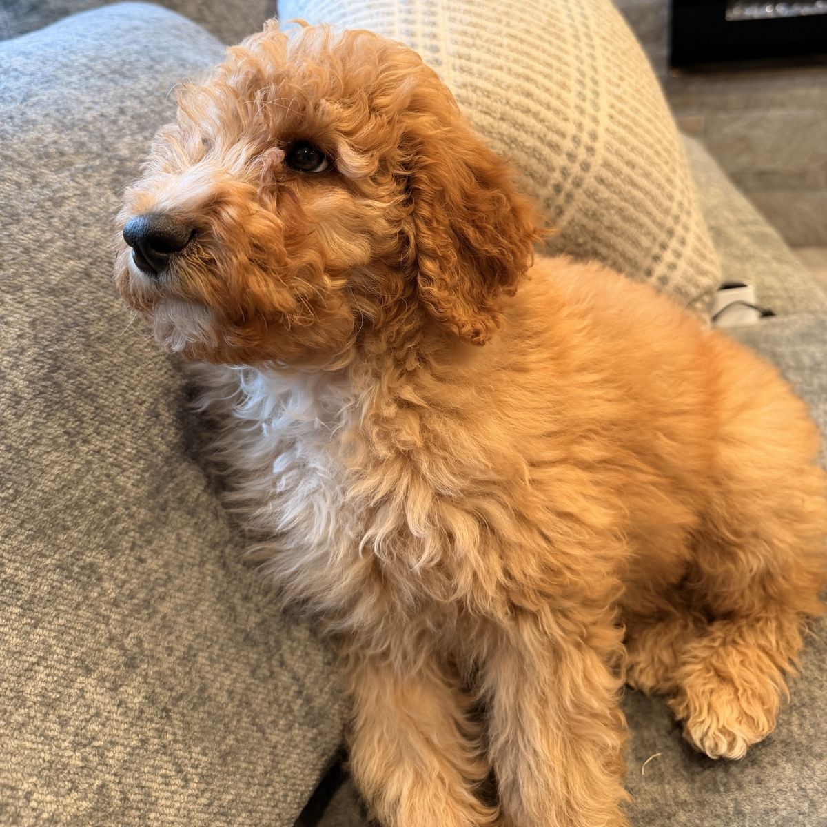 He is very friendly, playful, and great with kids and other pets. Golden Doodles are known for being intelligent, loving, and low-shedding.