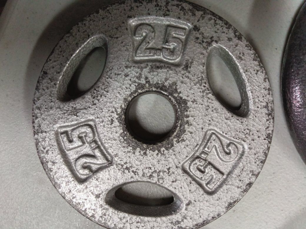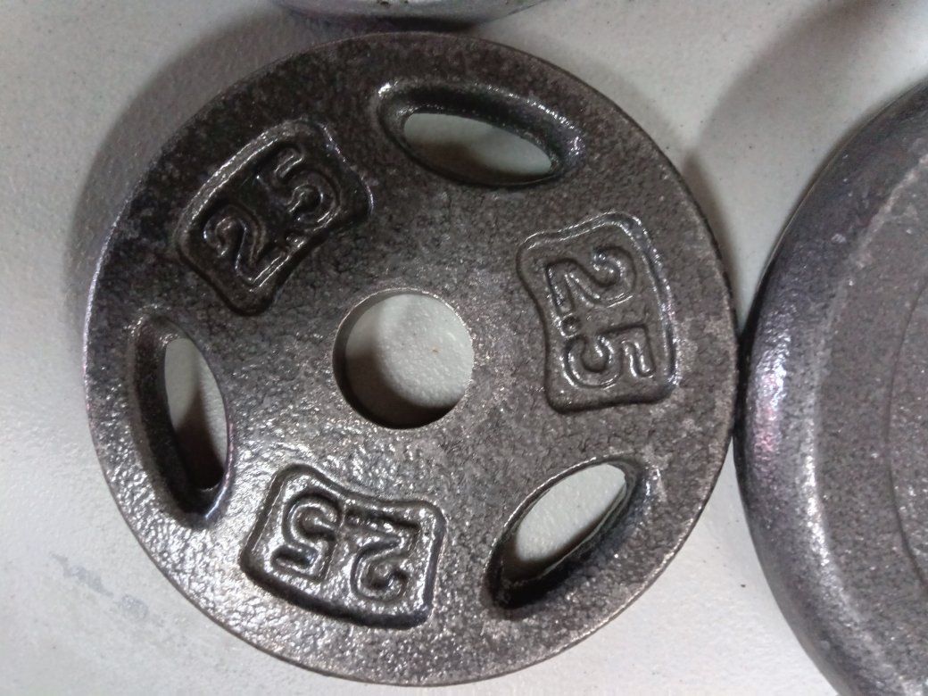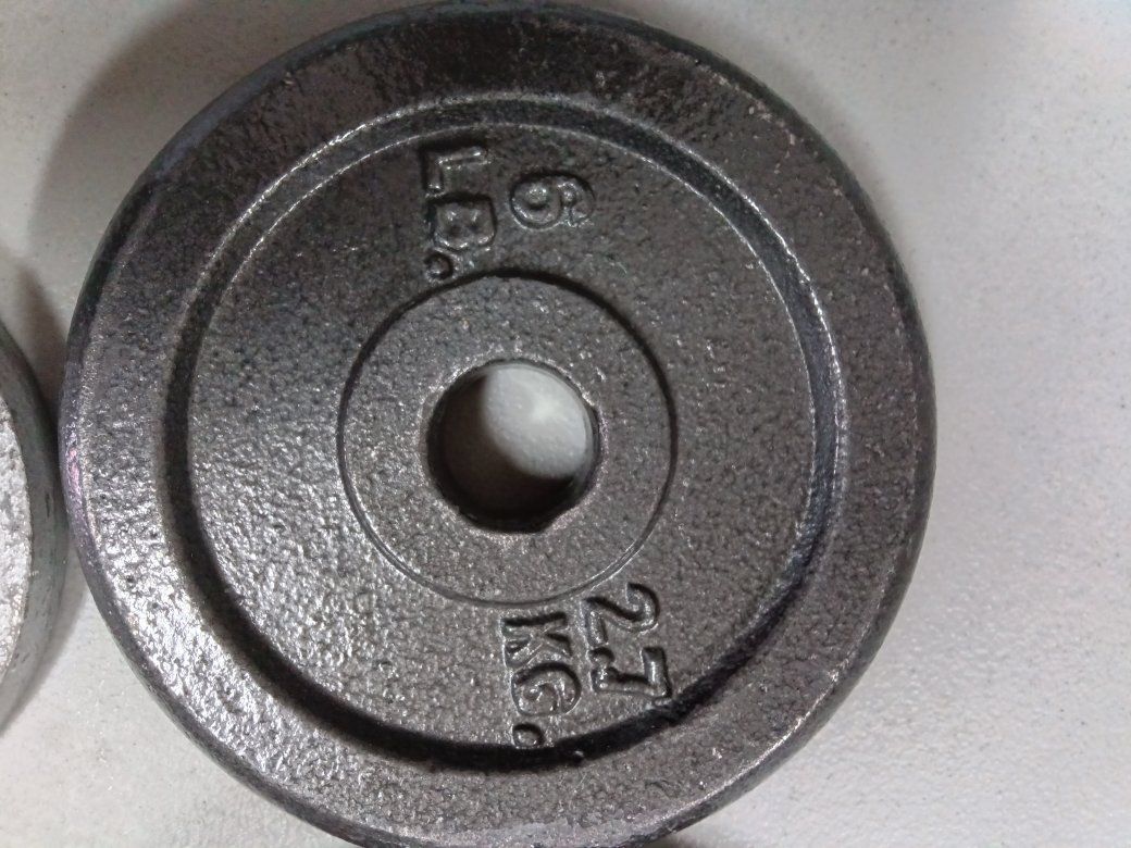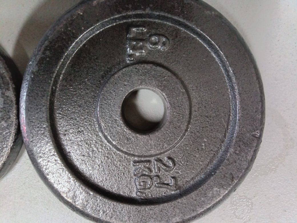 For weight plates two or 6 lb each and two or 2.5 lb each with the one inch holes Total 17lbs perfect to add to your cap or other weight set for barbells or dumbbells excellent like new conditions see pictures for details!