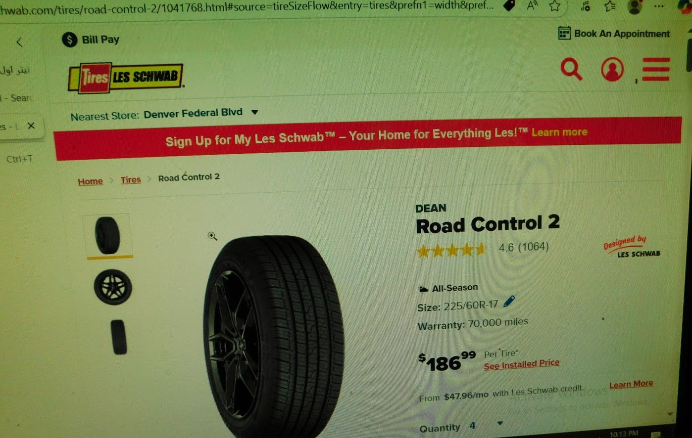 Set of 4 225 60R 17 Road Control A/S 94H all season Deans Tire Les Schwab Tire good shape like new $240 $60 per tire Les Schwab $187 per tire must see