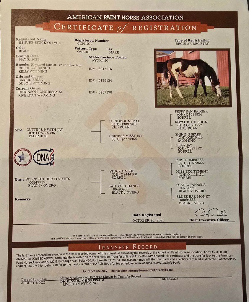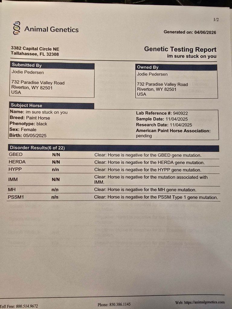 Are you looking for something with that WOW factor?If you are, you certainly should check out this absolutely gorgeous bay overo yearling filly. We call this super cool girl, Stacey. She is absolutely loaded with class, charisma, and presence. Stacey is a big stand up kind of filly standing right at 14 hands in early April of her yearling year. She is a forward cadenced mover, straight legged, and blemish free. She is by a son of Peptoboonsmal, on the top side, accompanied by the legendary Shining Spark on the bottom side of the top.These cowhorse genetics are coupled with the pretty stallion, and horse. Zip To Impress. If you are looking for a show horse quality prospect that has the genetics to watch a cow too, you should check out Stacey. I can be reached by PM, or at 3078511404. We are located just outside of Riverton WY.
