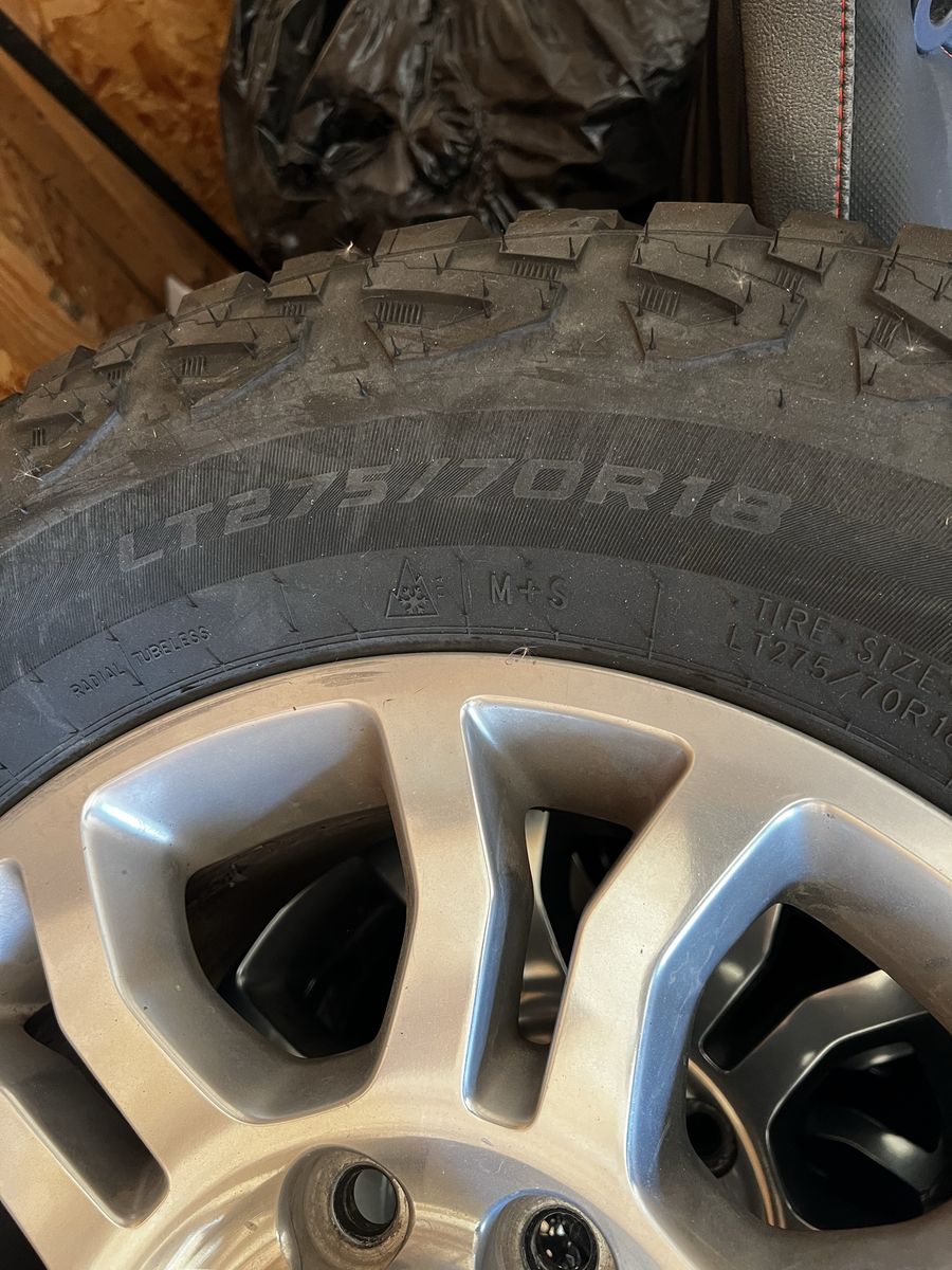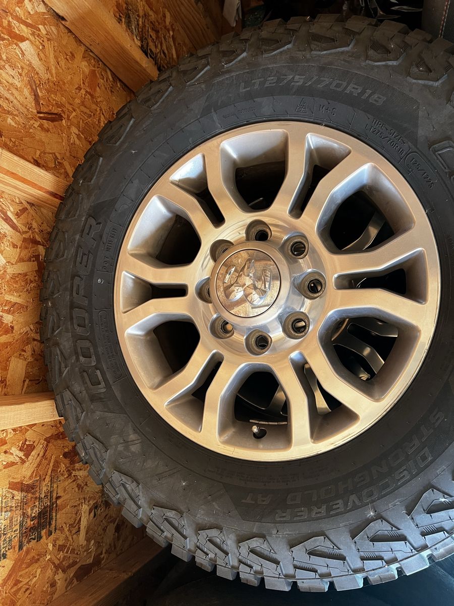 Selling a set of stock Dodge Laramie 18 inch wheels. Came off of a 2018 Dodge Ram 2500 but will fit any 8 lug Dodge. Wheels are in great shape no curb rash or anything. Tires are still near new shape, no patches, no leaks. Paid $340 per tire just last year. Came off the truck in December 2025 and have been stored indoors since.