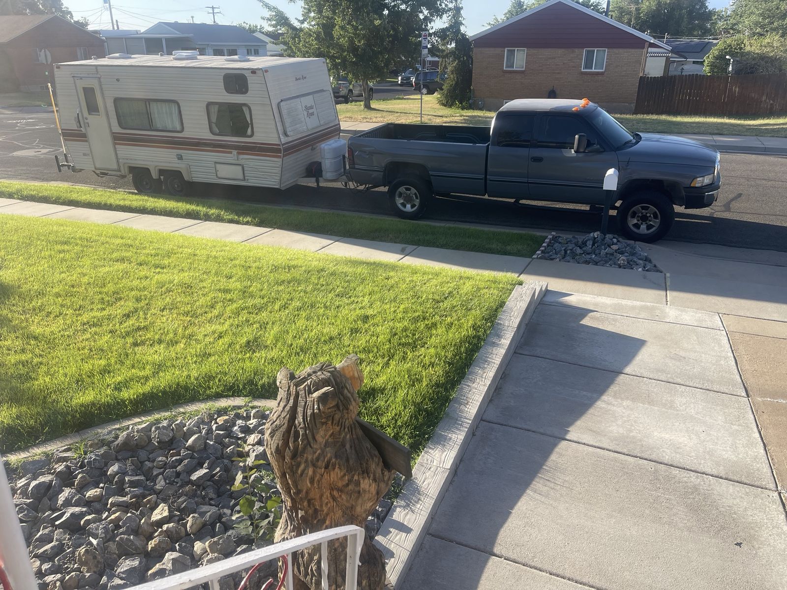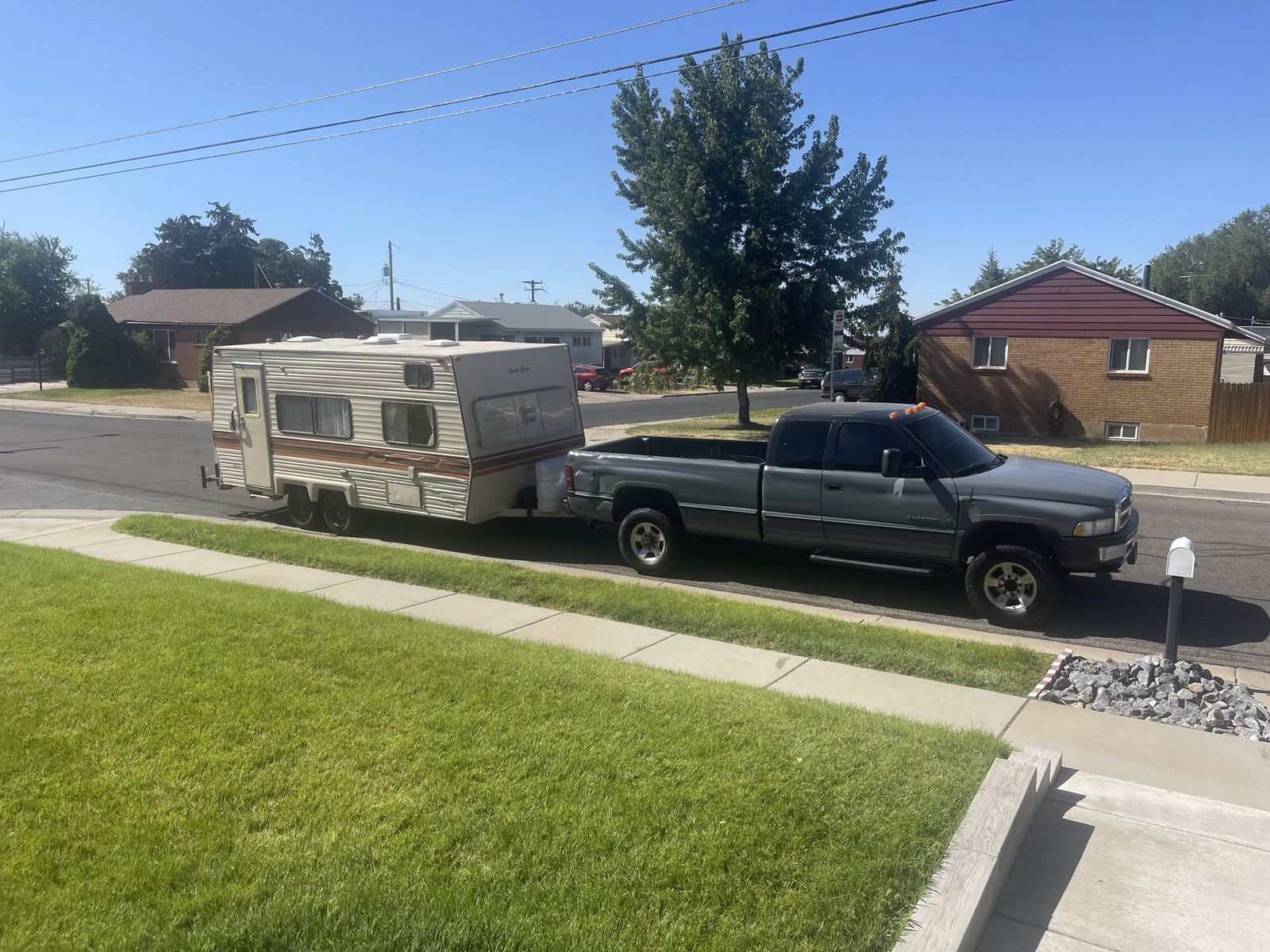 Self contained 20 ft Santa Rosa camp trailer. Everything works but the heater. Stove, fridge, toilet shower all work. See photos. Trailer comes with 2 sets of stabilizer jacks, cover, tire covers, solar panel, for charging trailer batteries. two propane tanks and an equalizer jack. Trailer roof has never leaked and was completely resealed last fall . I am also selling the Dodge truck that can be seen in the photos. 1997 Dodge ram, 2500, V10, 8.0l, 176,000 miles and runs very strong! Comes with a very nice adjustable hitch. It’s had all new suspension installed on the truck. New ball joints, tie rod ends, swaybar links steering damper, everything. Truck has brand new rims and tires with less than 50 miles on them. Also come with a complete set of 17 inch rims and tires. Truck has a new battery fan clutch, wires, spark plugs. Would sell both truck and trailer together for $11,000.