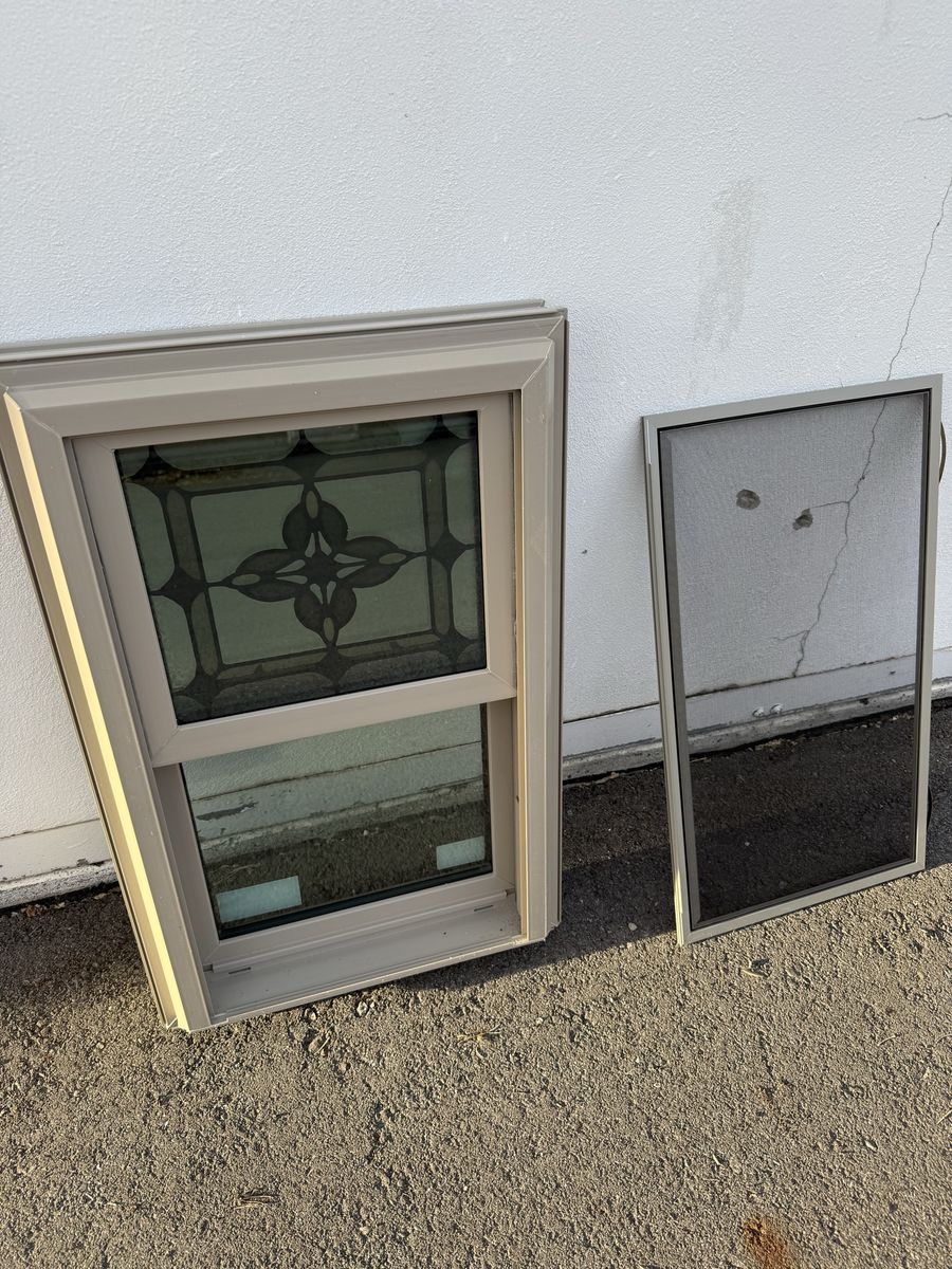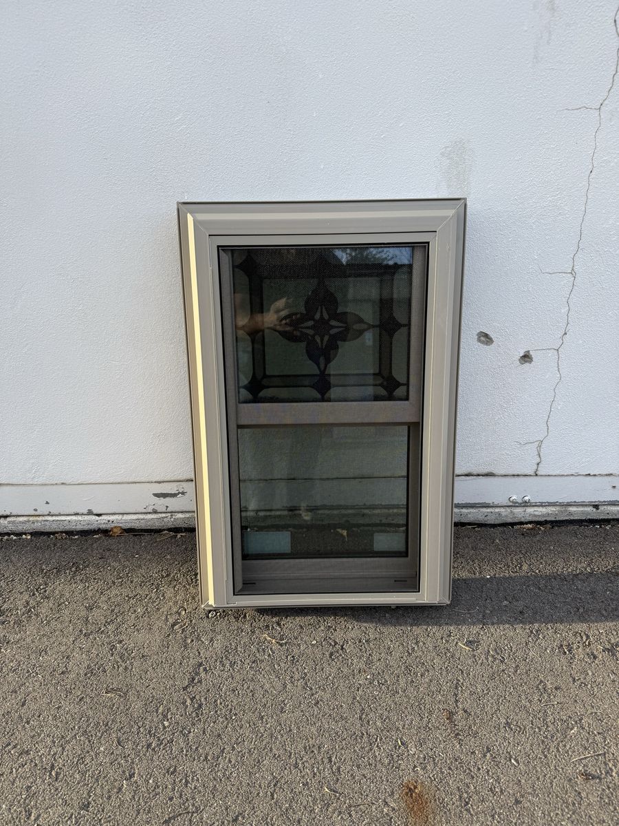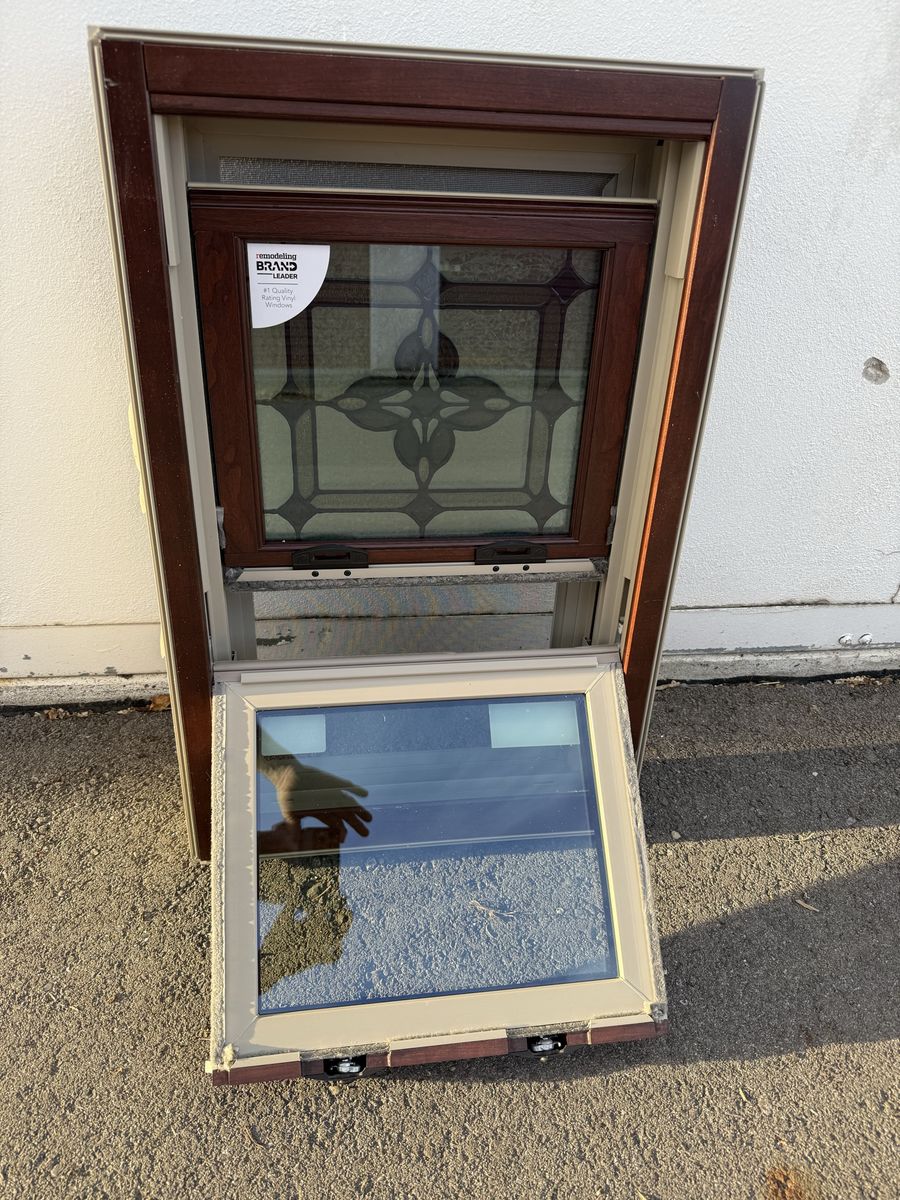 This is a brand new Tan exterior wood grain interior leaded glass double hung. Exact measurements are 20” wide x 30” tall. Frame depth is 3 1/4” deep. This is a double hung window. Both upper & lower panes operate & fold inward for easy cleaning.