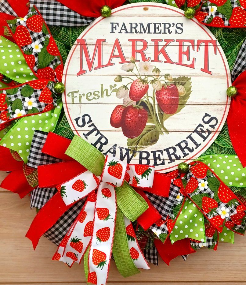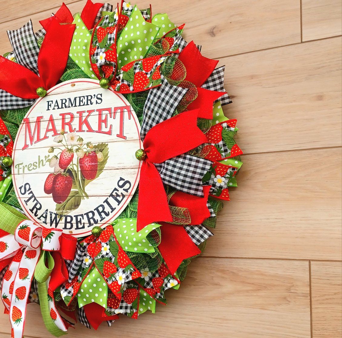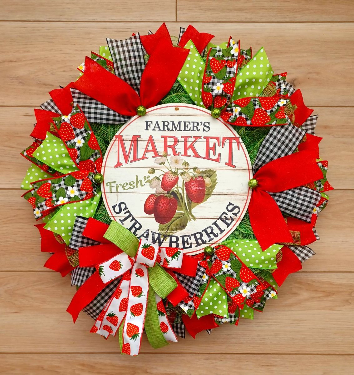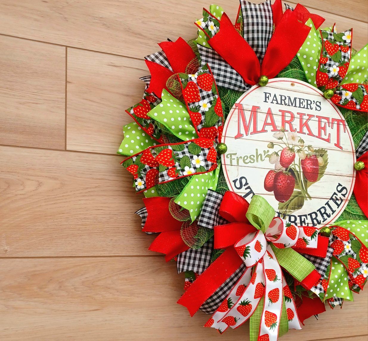 Adorable 24” strawberry wreath with ‘Farmers Market Fresh Strawberries’ sign Perfect for gifting! Custom ribbon colors available & shipping offered. Message me for details!