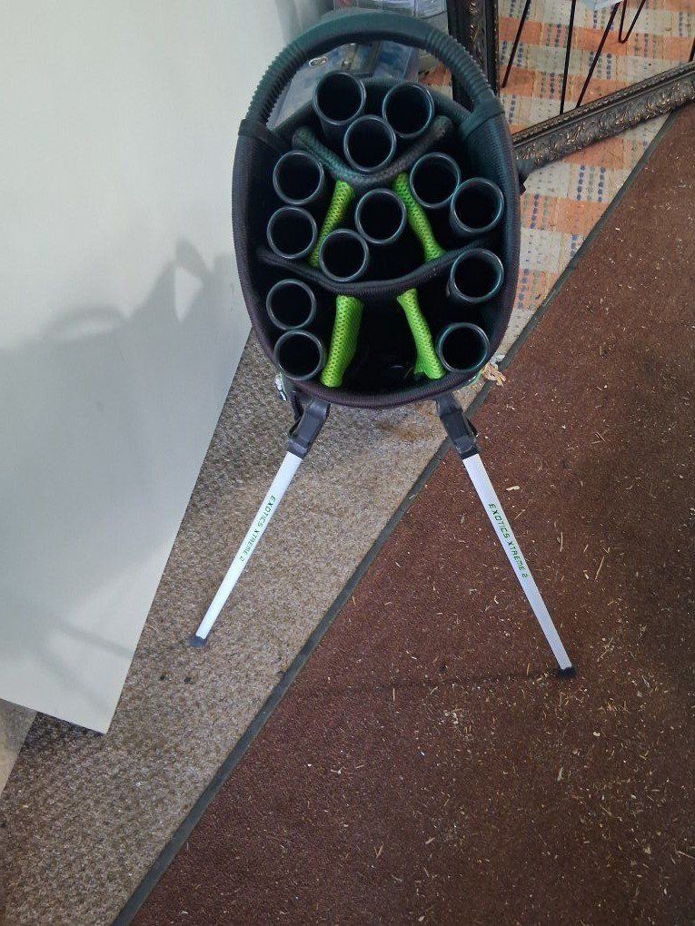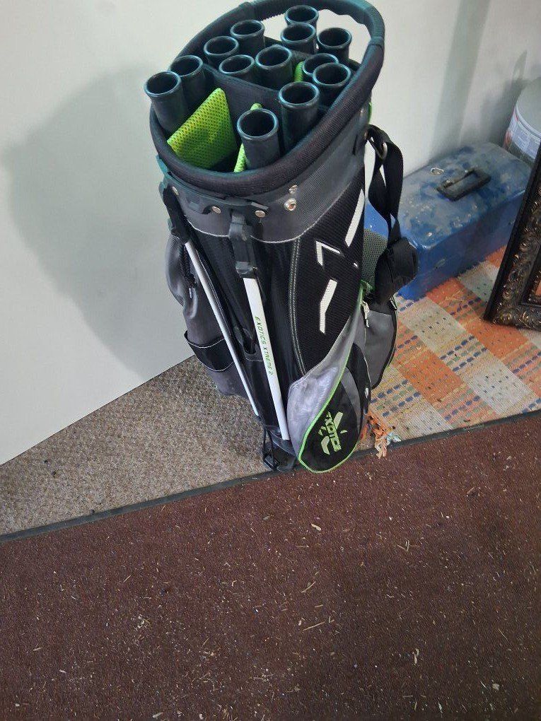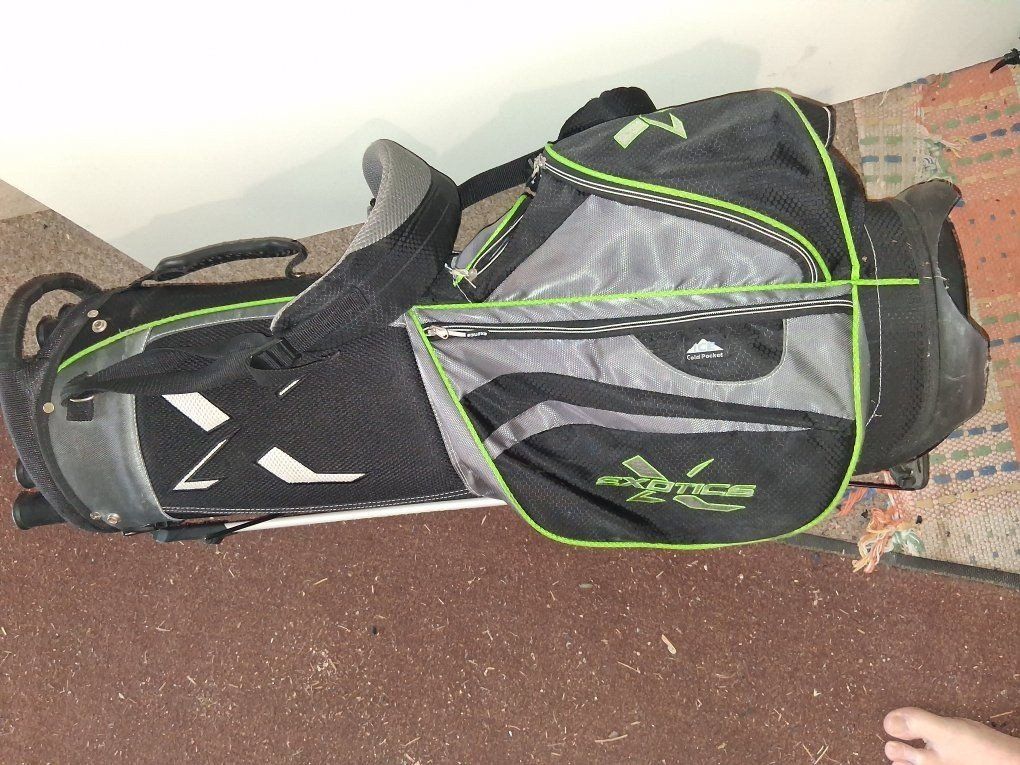 Exotics golf bag with shoulder carrying strap and stand in good shape ready for the course sorry no cover