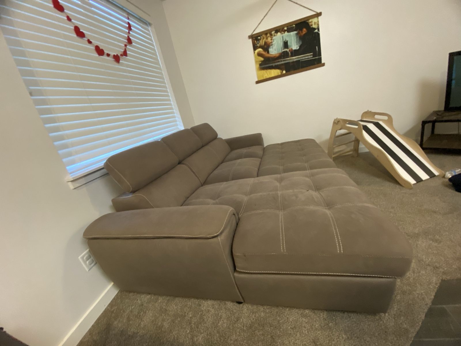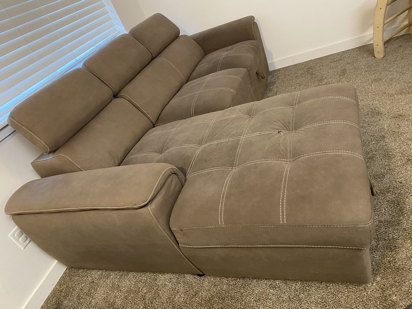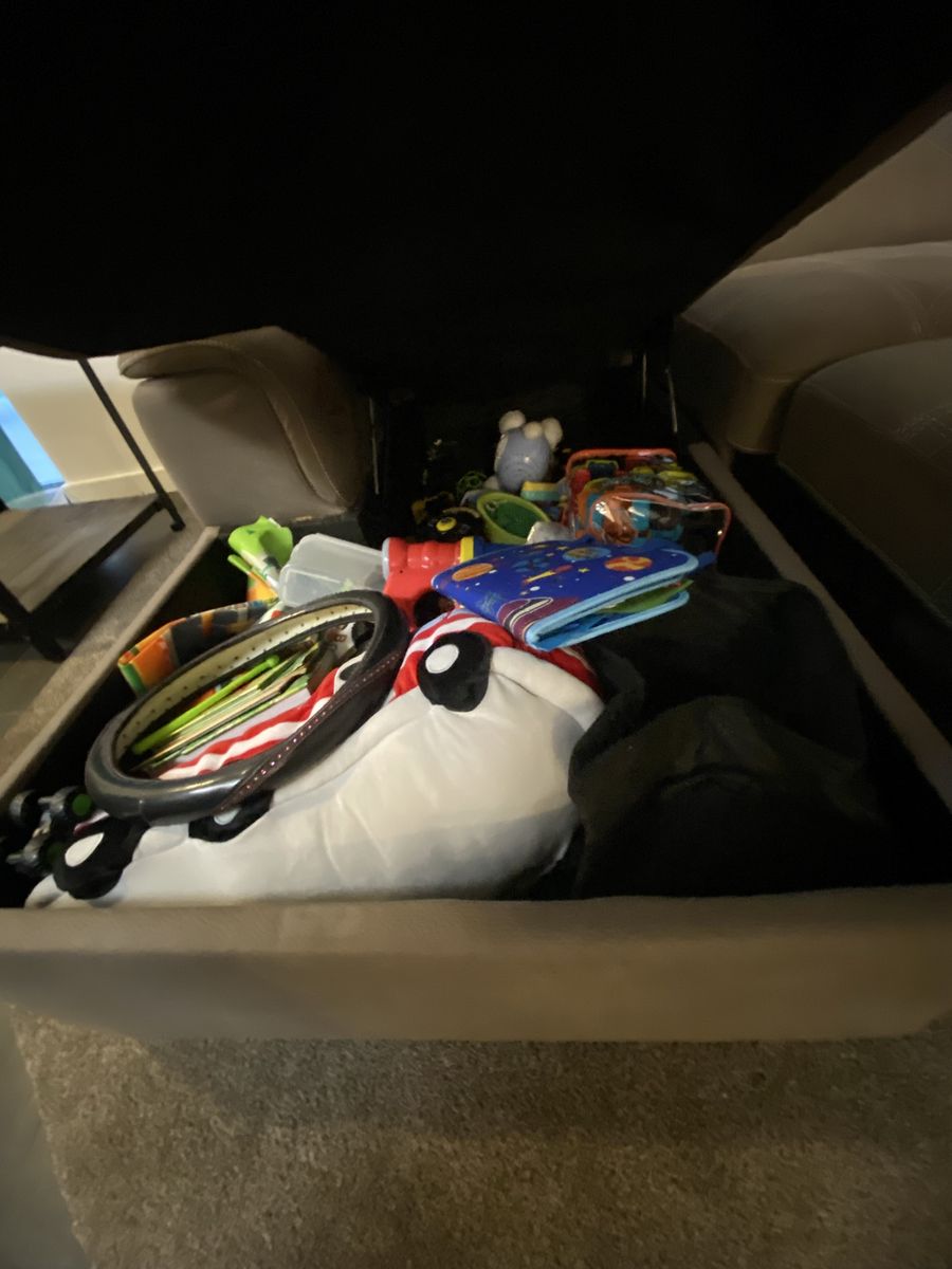 Super comfy tan sectional with: • Pull-out sleeper bed • Hidden storage under chaise (great for blankets/toys) • From kid-friendly home
