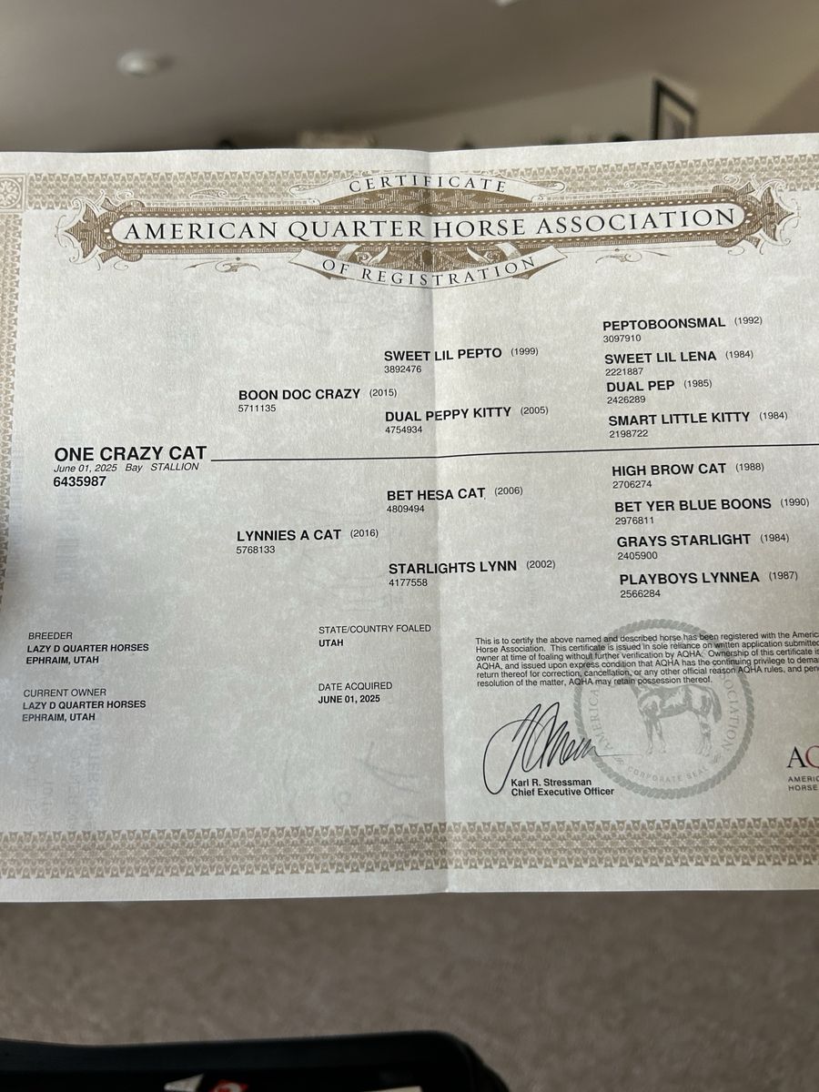 VenmoIf you’re more interested in the bloodlines instead of color!! This stud colts for you! Just look at his papers and you’ll see that he has great potential to be a great head or heel horse! Or what you want to do with him!! He’s a great colt! Leads! Been on a walker ! You can bathe him! He has fantastic parents! His Dad won multiple Championships in the URCHA! And had won money in the NRCHA! Look at his pedigree and you’ll agree with me! Asking 4000$ OBO