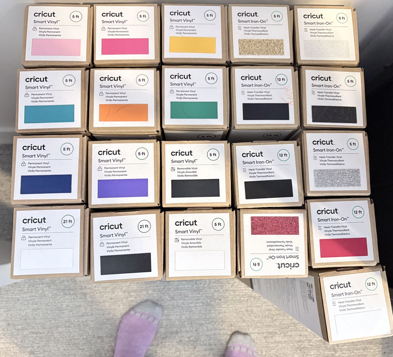 Cricut Smart vinyl for venture Machine. Bundle includes permanent vinyl, removable vinyl, iron-on vinyl, and iron-on glitter vinyl. This is being sold as a bundle. Each vinyl roll is at the smallest size 24.X 5 feet the larger ones are 24X 21 feet. The medium ones are 24X by 12 feet, as shown in the picture; the box they're in comes with a bundle.