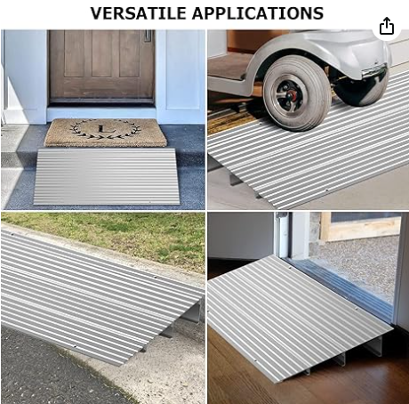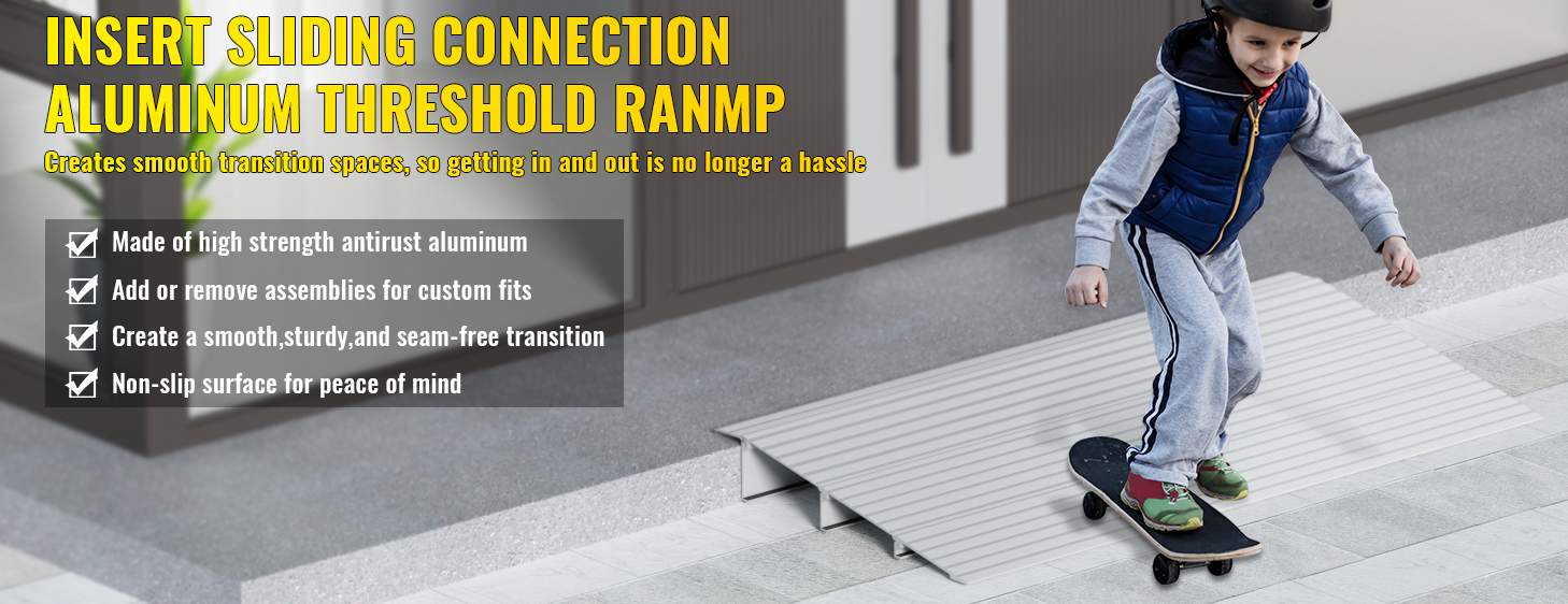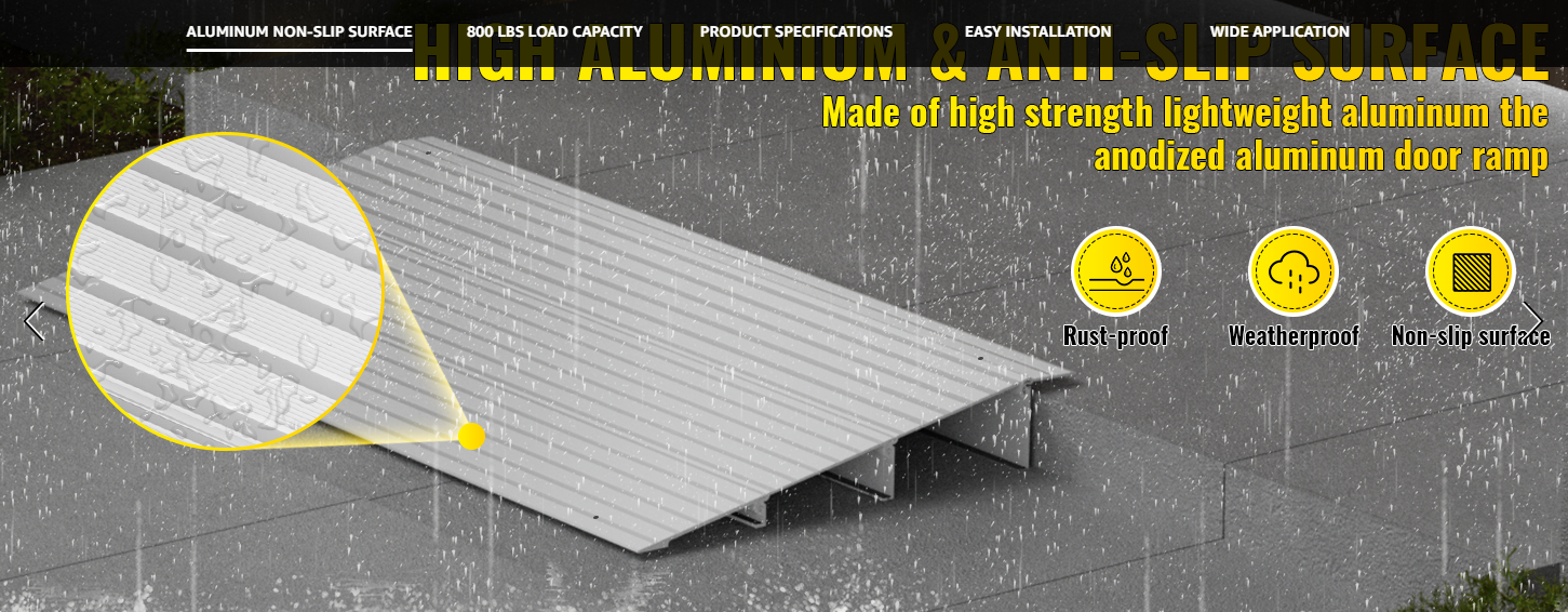 · HIGH ALUMINIUM AND ANTI-SLIP SURFACE-The Aluminum Entry Ramp, made of high strength lightweight aluminumThe anodized aluminum door ramp can be rust-proof and scratch-proof for witha slipresistant surfaceindoor and outdoor usage.