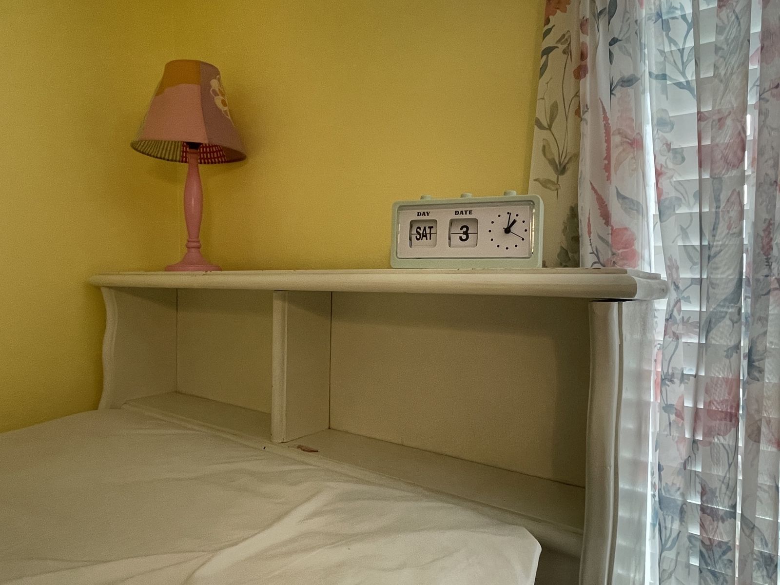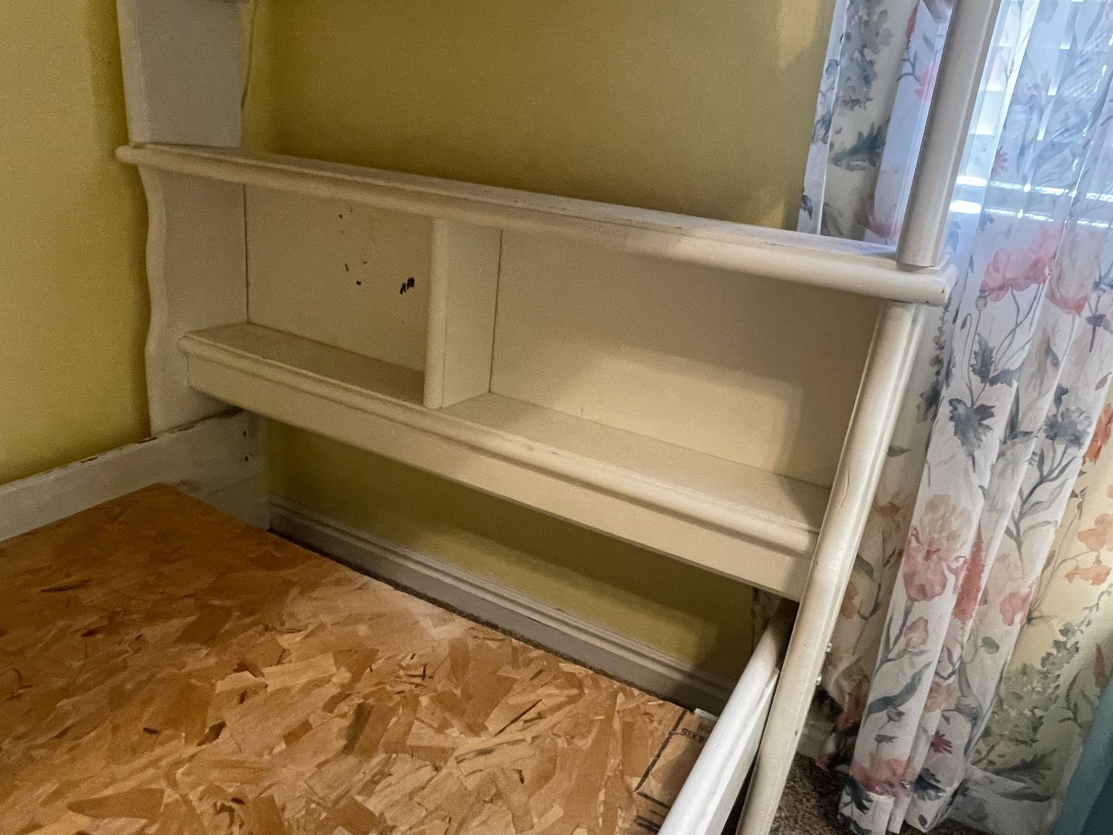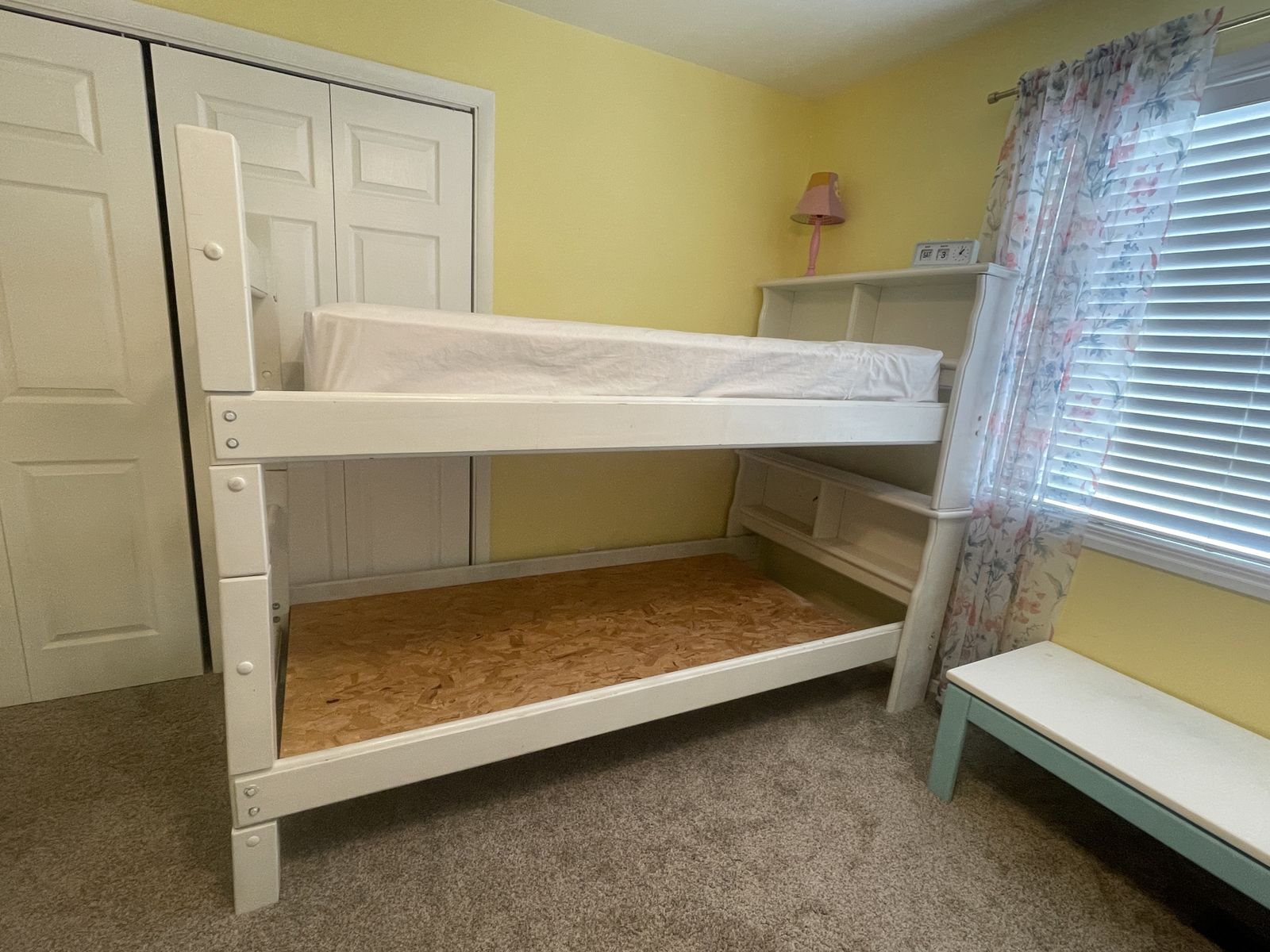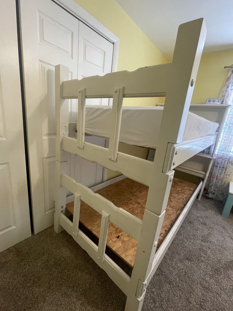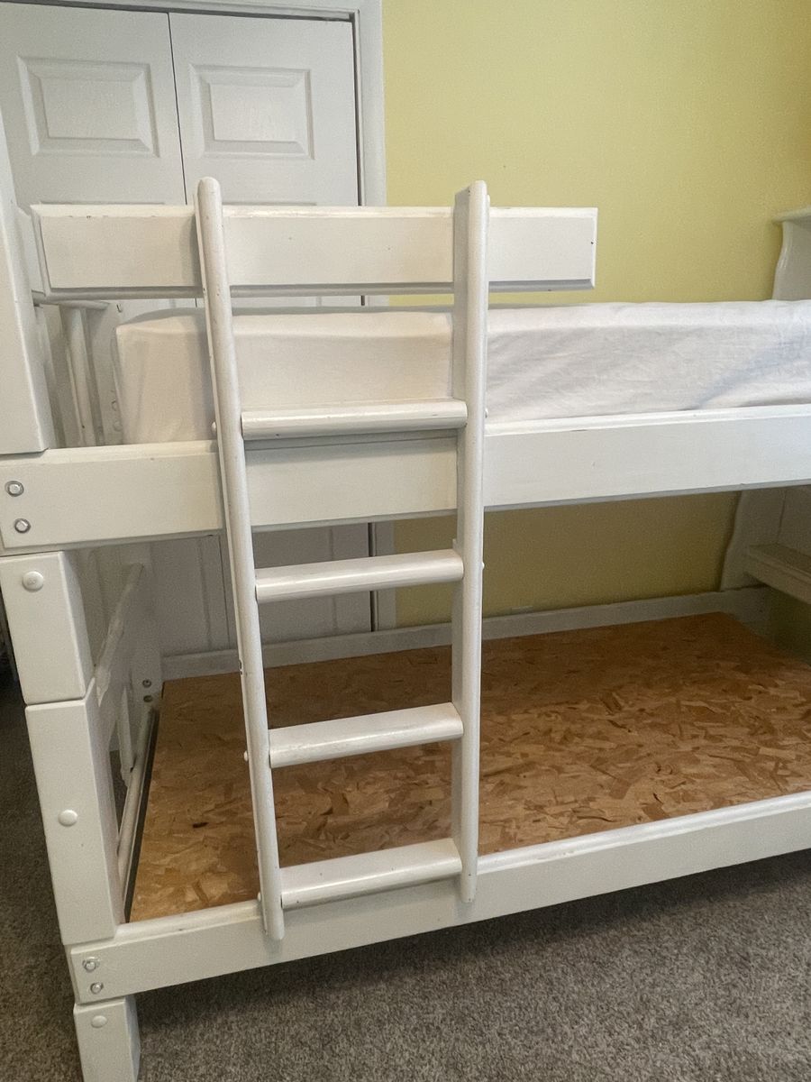 This set of white bunkbeds is very sturdy. They don’t squeak like cheap metal bunk beds. They separate into two twin beds. They come with 2 mattresses and bunk boards. (One mattress is missing in the picture but we have it.) Nice bookshelves at the head of each bed. The ladder is removable, it can be placed at the head or foot of the bed. The white paint could use a little touch up but overall they’re in good condition. We will take them apart for easy transportation.