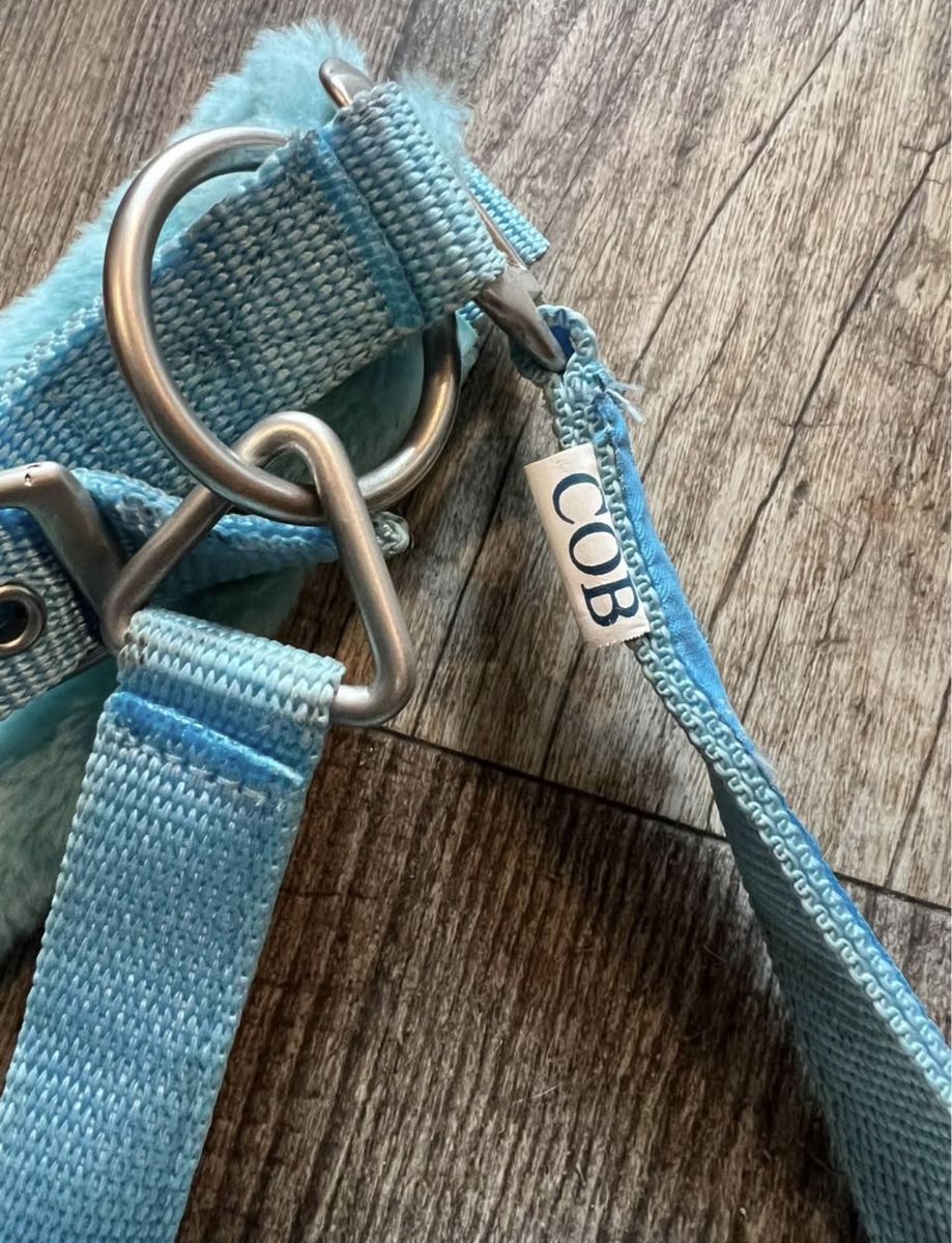 Super cute turquoise travel halter with soft fleece padding for extra comfort during hauling or everyday use. Lightweight but sturdy, with adjustable fit.