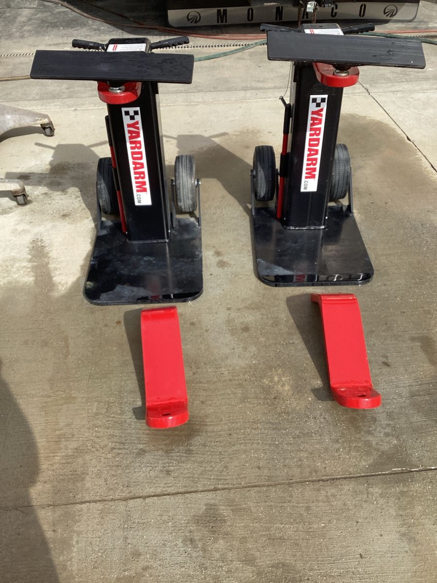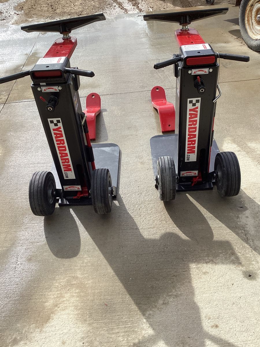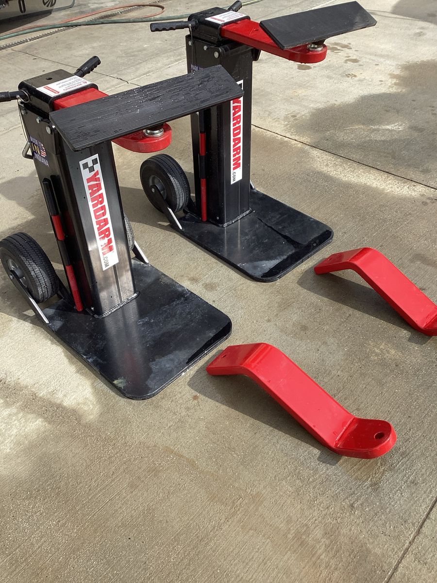 2 like new yard arm boat jacks and 4 ea 10 ton adjustable stands with some keel adjustable V stands .All in like new condition. The yard arm jacks have been used only 4 times in my boat shop. They have never been left outside. They are complete with all the typical accessories, they are clean and ready To put to work, also have7 adjustable tri leg jack support stands that work with these jacks and yard arm jacks for additional stability. I can deliver to the Salt Lake area, OBO
