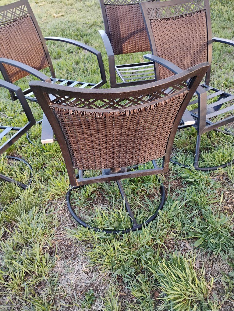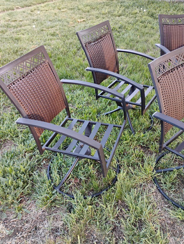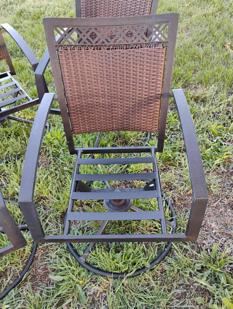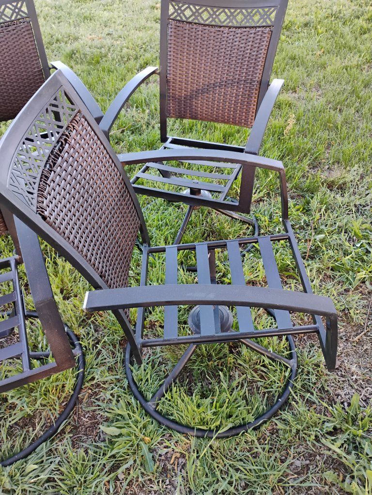 VenmoAll swivel. A couple chairs the top of the back I coming undone. See pics. still works fine. Very solid. Steal straps where the cushions go fits up to a 20x20-in cushion. round base. Priced reasonable. $50 for the Set.