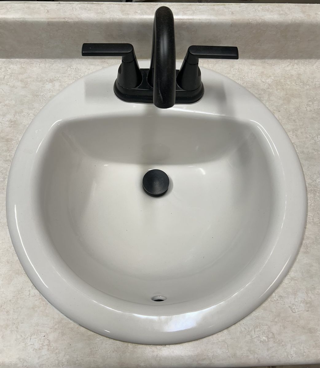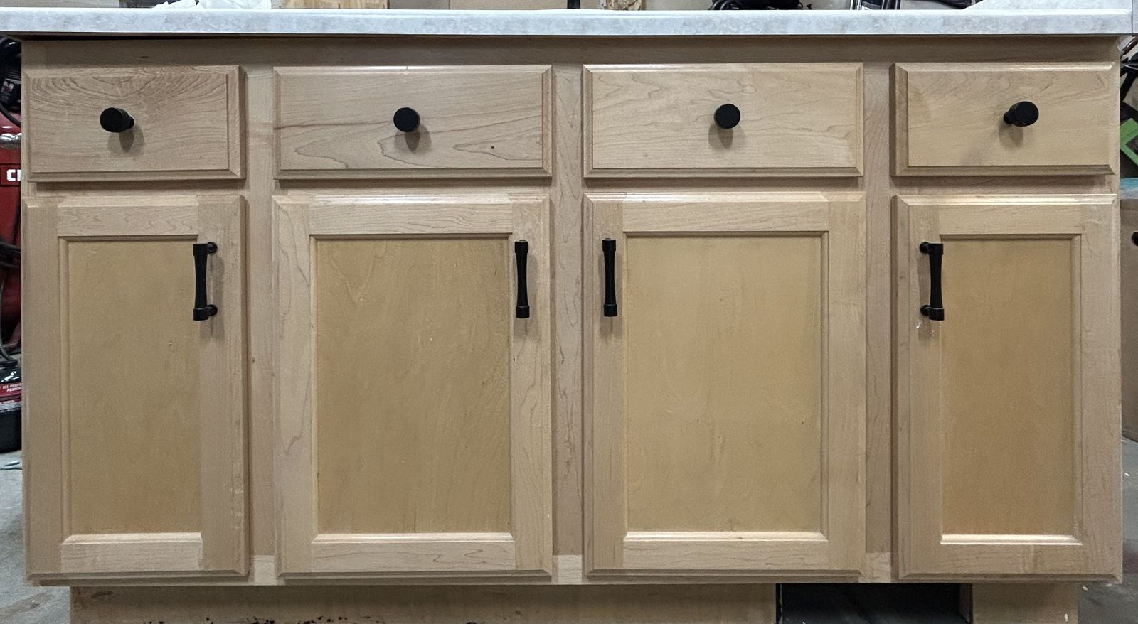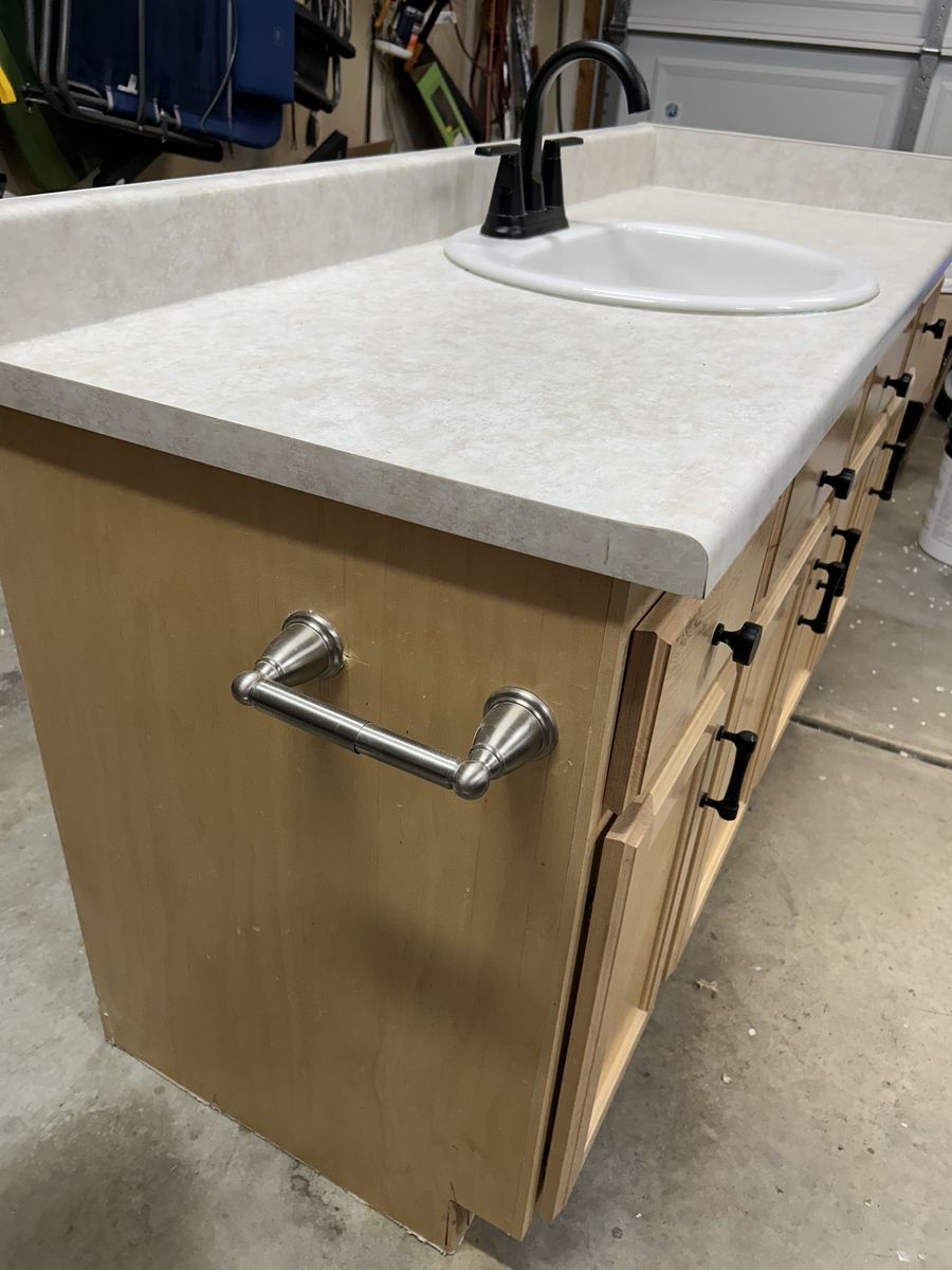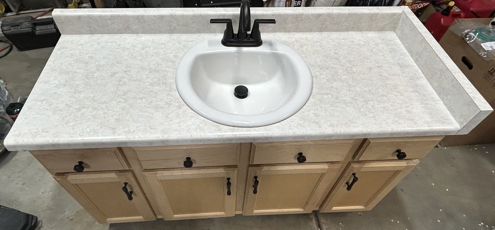 VenmoThis maple bathroom vanity is 54” wide, 21” deep and 31” tall. The cabinet is finished on the left side.