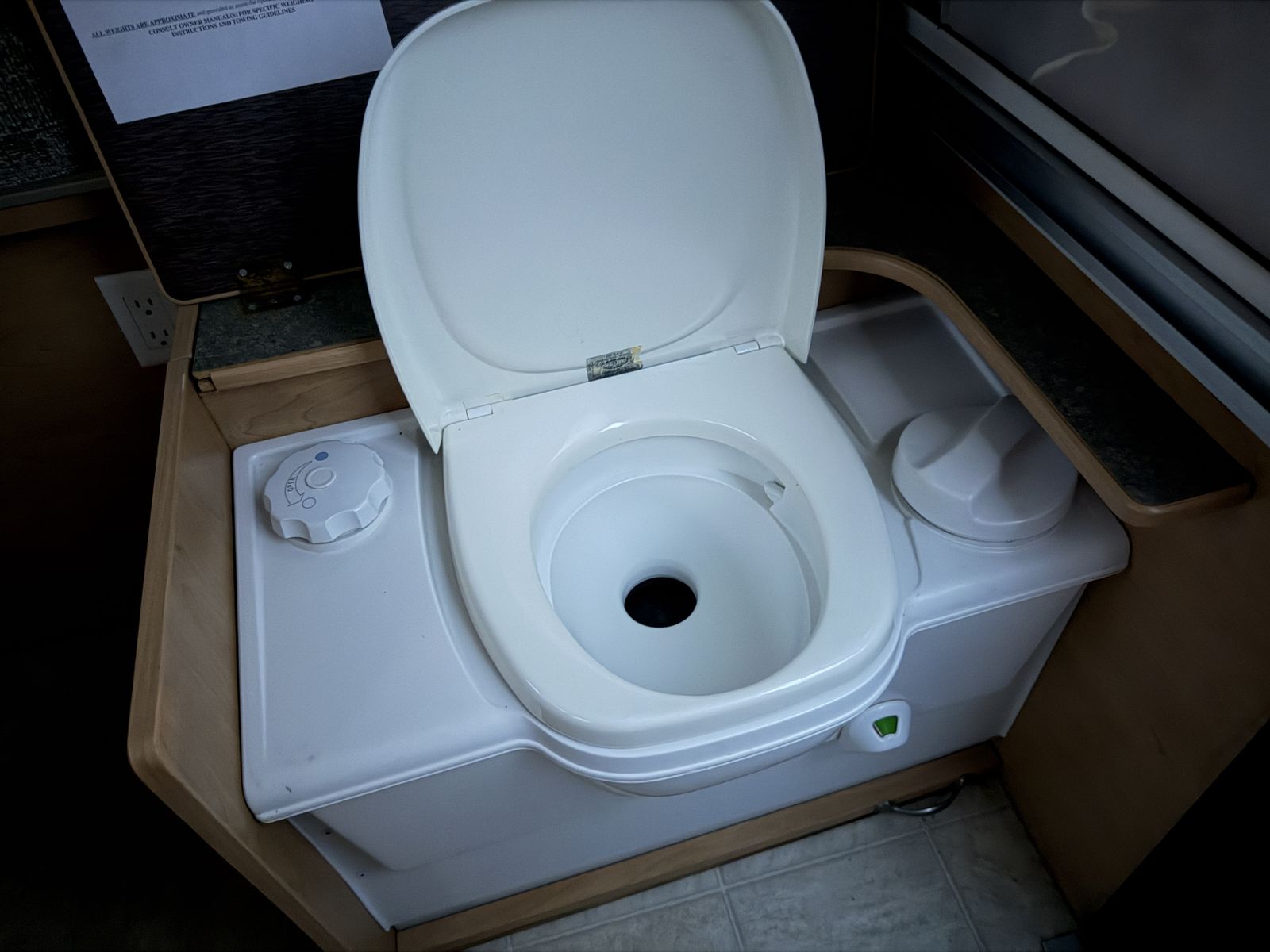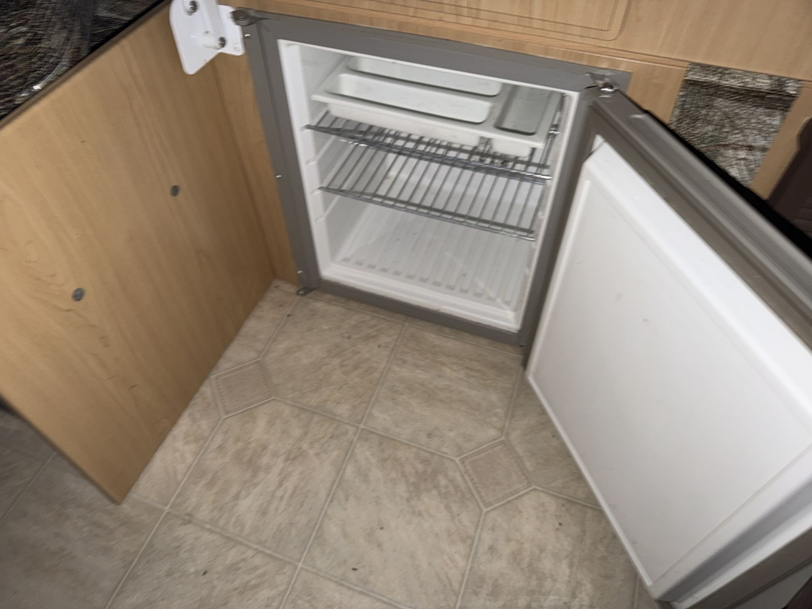 Door sticks a little but opens/closes/locks completely. We removed the door from its storage cable, but all storage snaps are in working order. One of the stabilizer jack feet is bent, but is still functional. There are two over head lights that take 2 bulbs each; each light has one bulb that needs replacing.