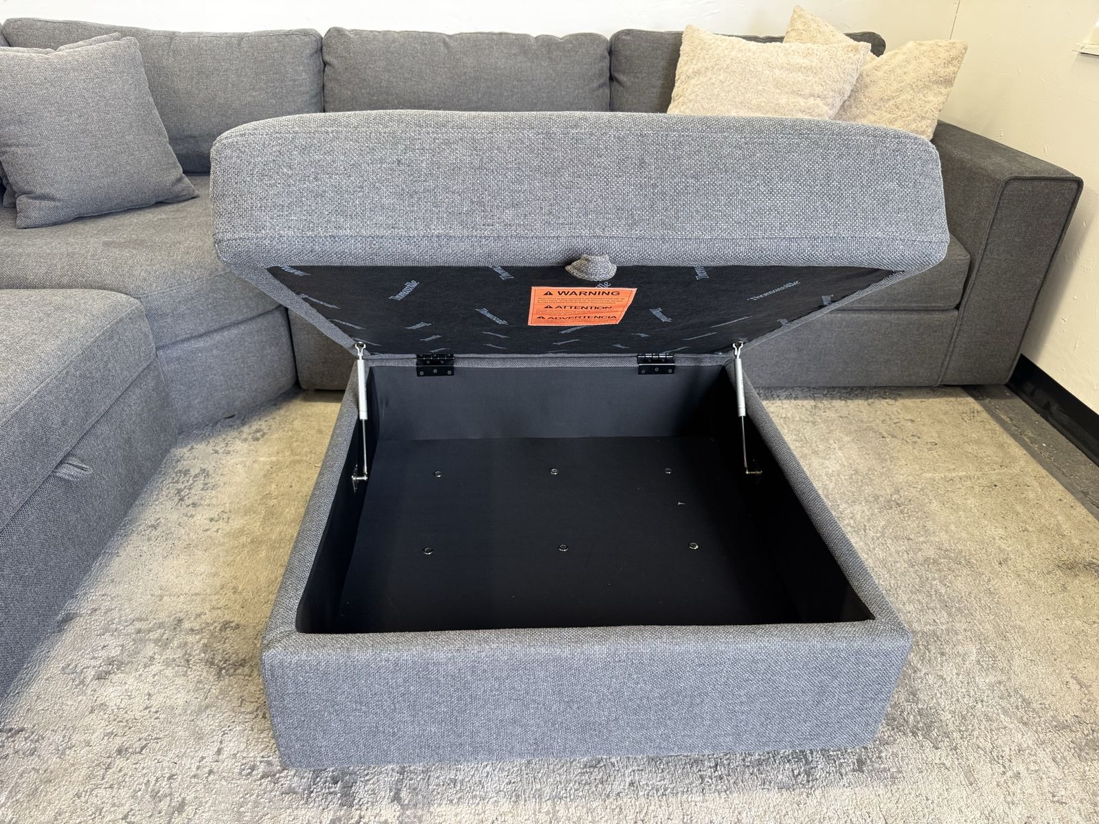 Features: • Modern Style with a Clean Look • Hidden Storage Seats on Both Sides • Storage Ottoman with Generous Storage Space • Zipper Attached Back Cushion Holds Cushions in Place • Wide Track Arms