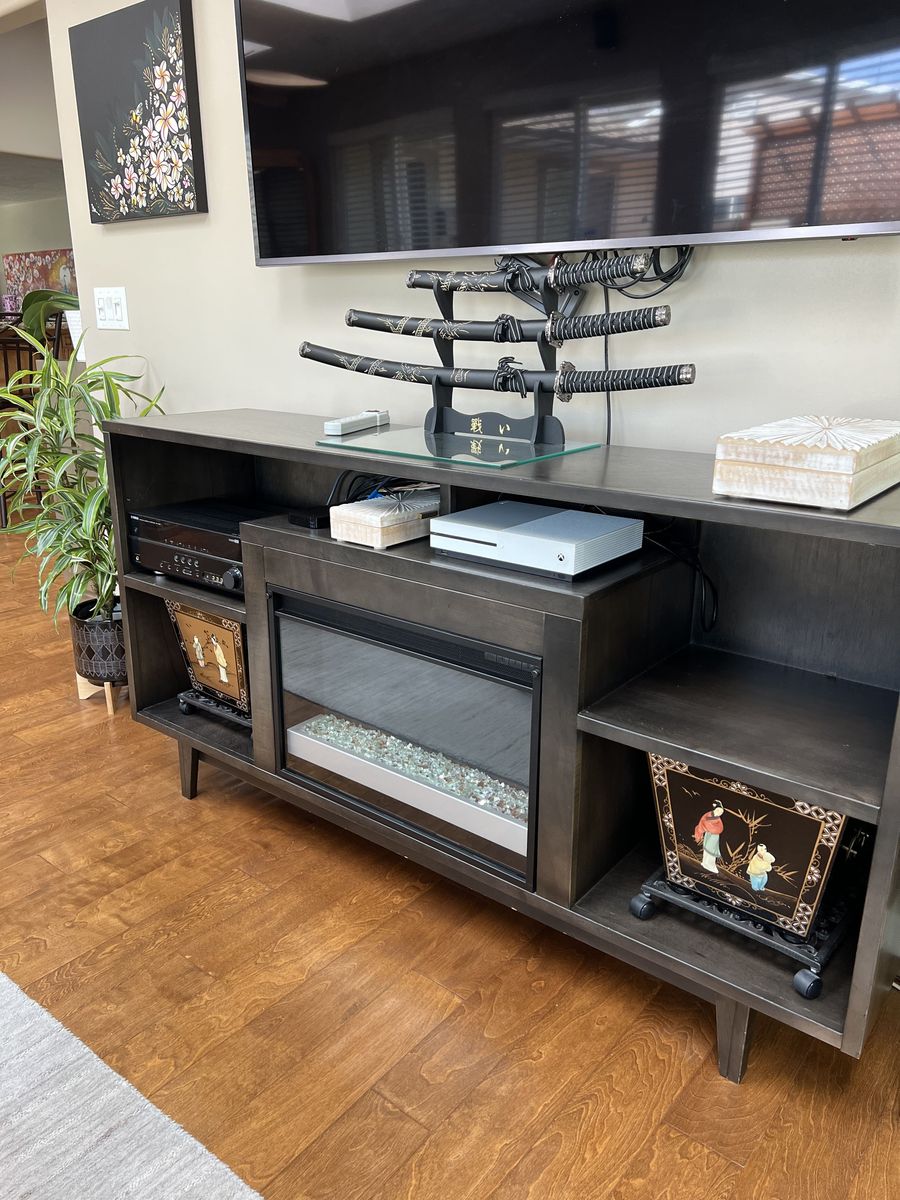 Modern 68" Storage Fireplace TV Stand With Cord Management Excellent Condition. Moving Sale Estate Sale All furniture, furnishings, decorative items in the home are for sale.