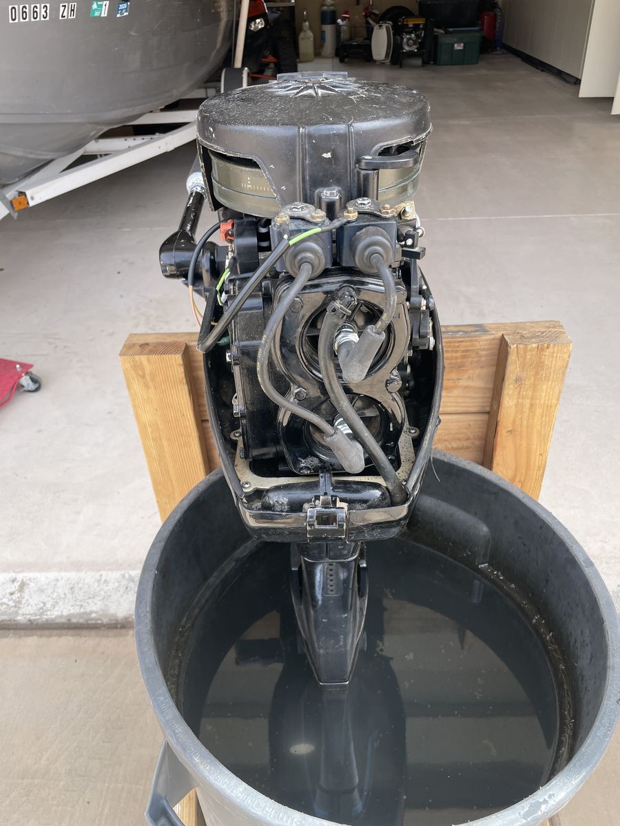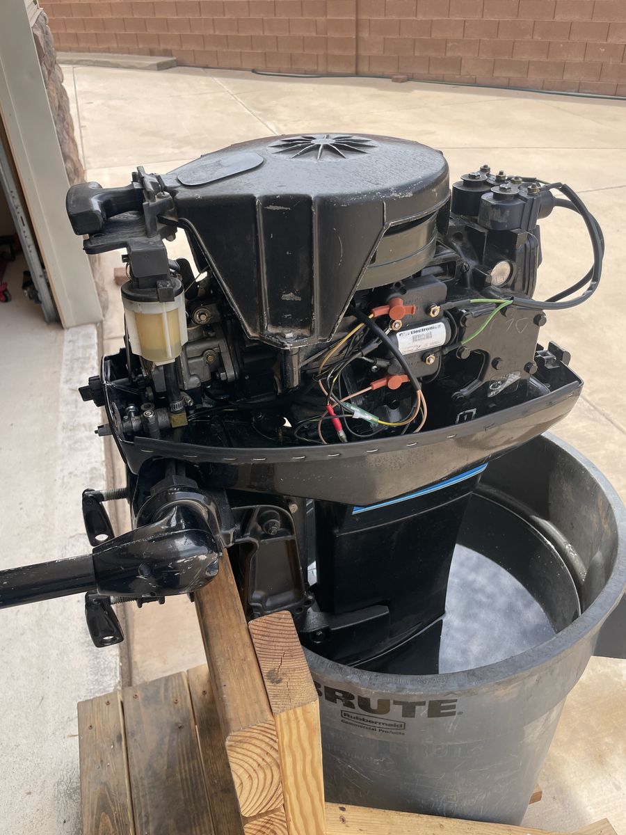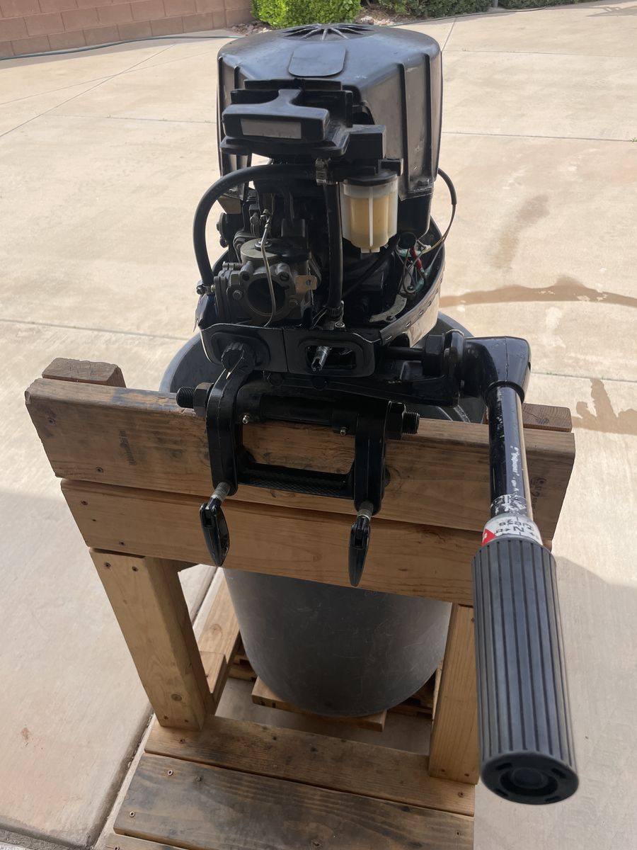 This motor is a lightly used outboard with compression at 105 psi and 101 psi. It is an easy soft pull start when cold and warm. The carbureator was cleaned with new parts including a factory new inlet needle valve and gaskets. The electrical system has a new stator (creates the electrical voltage), a new trigger (which controls the spark timing with rpm changes), and a new CDI switchbox (which aggregates the spark for each cylinder).
